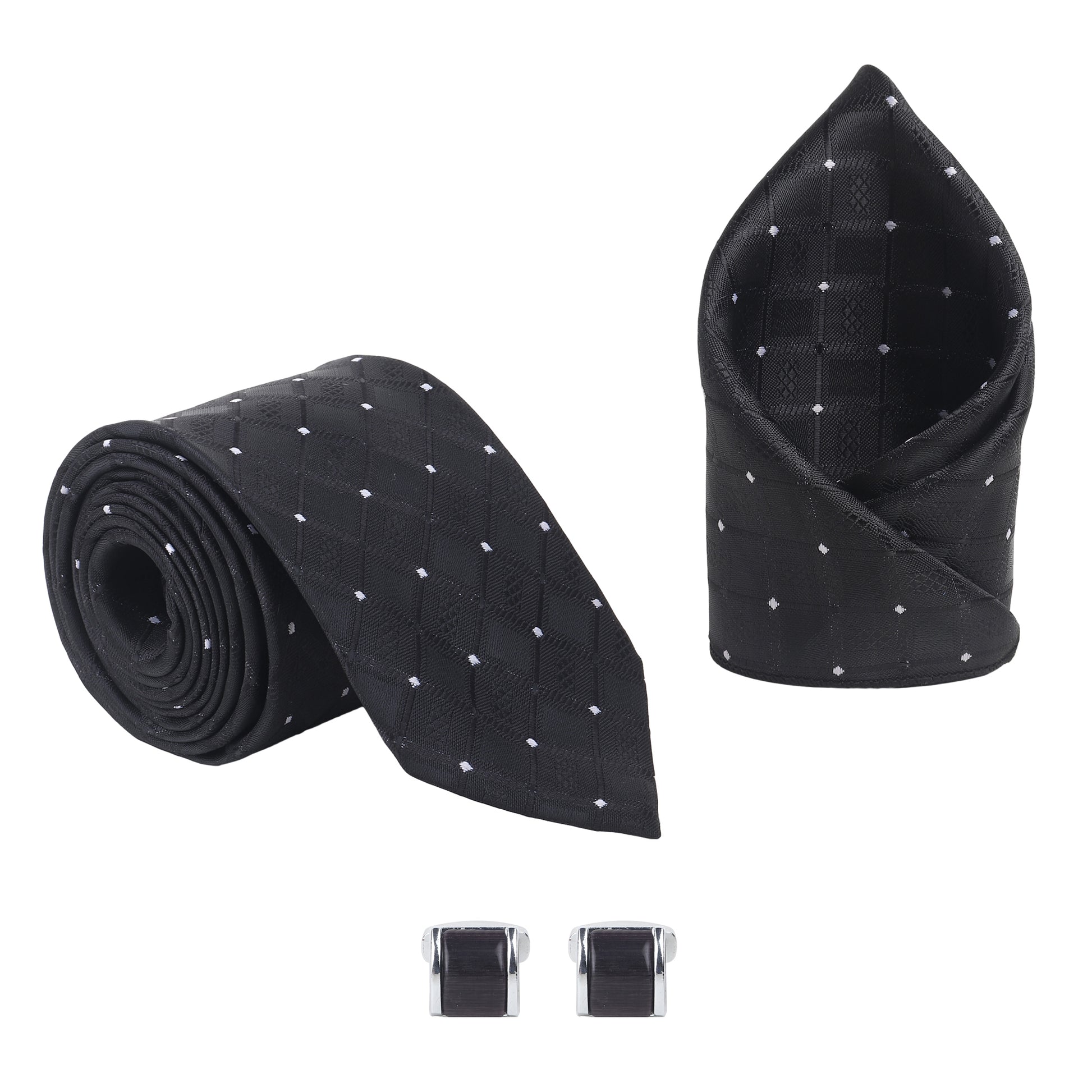 Kanthlangot Men’s 3-Piece Formal Set – Black Diamond Pattern Tie, Pocket Square & Rectangular Black Cufflinks (3-Inch Necktie)