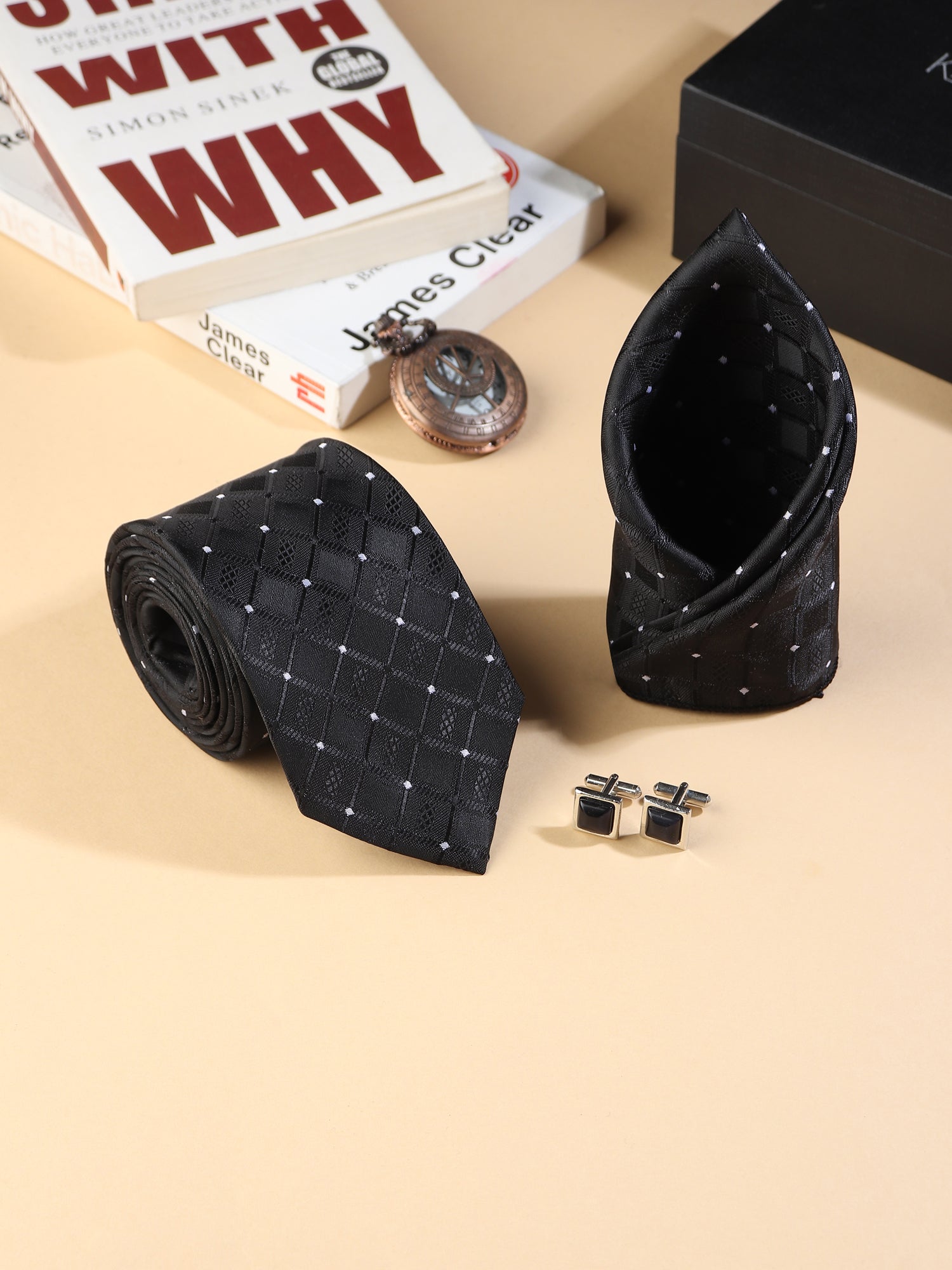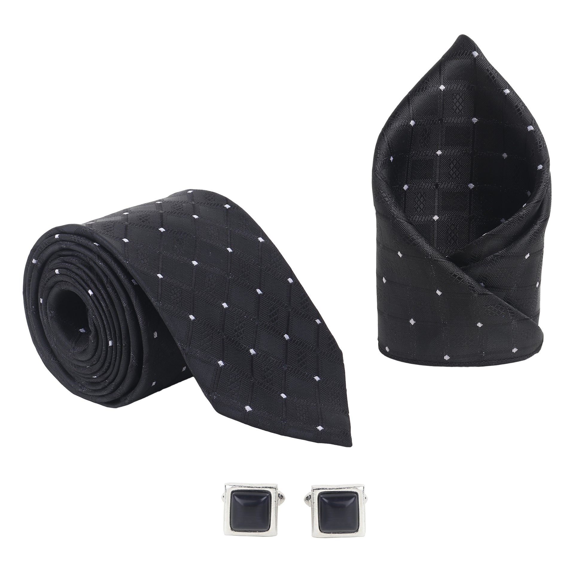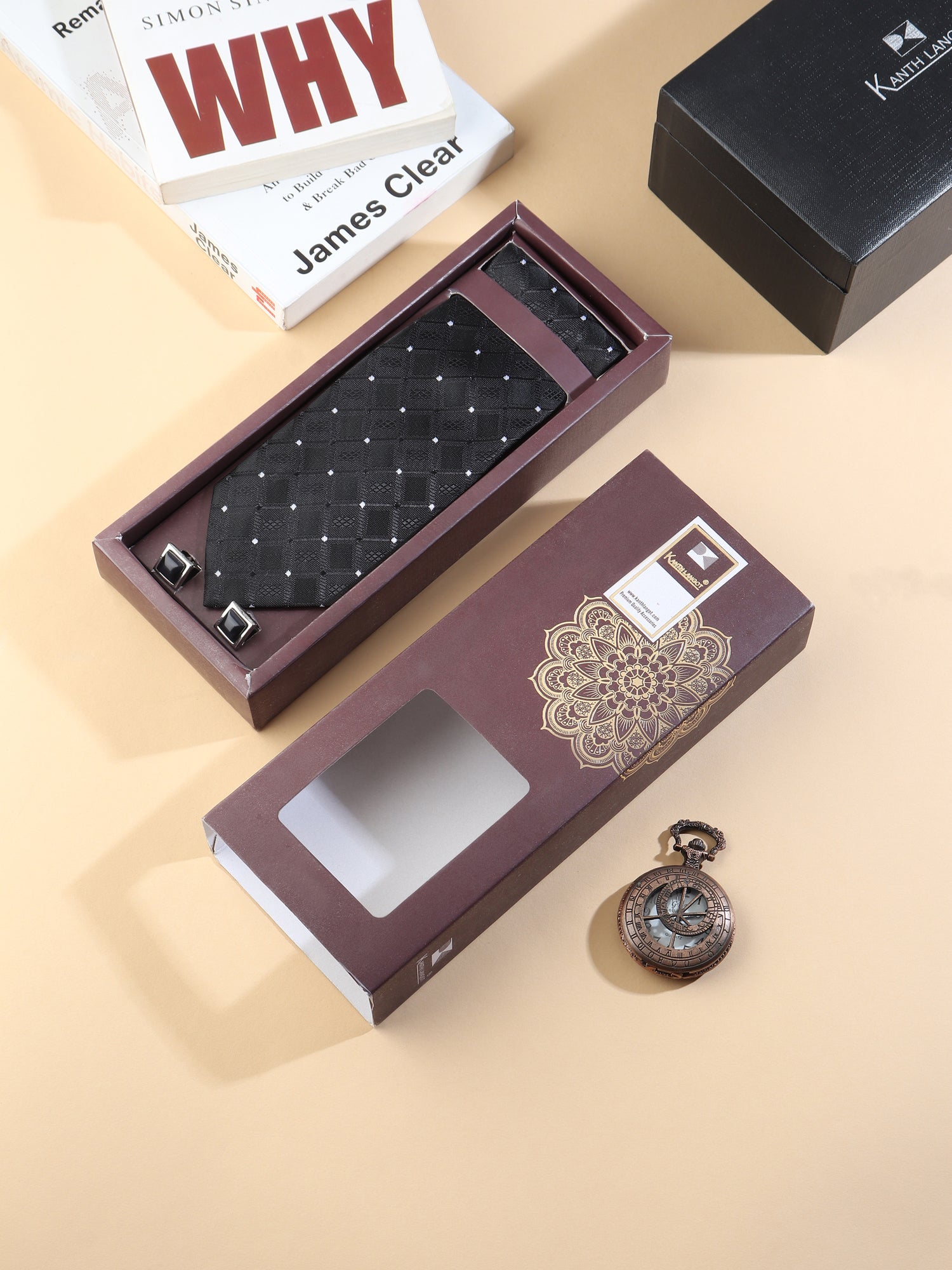 Designed for the man who leads with quiet power, the Kanthlangot Men’s Formal Set features a black tie with a diamond-check pattern, a matching pocket square, and square silver cufflinks embedded with a jet-black high-shine stone.