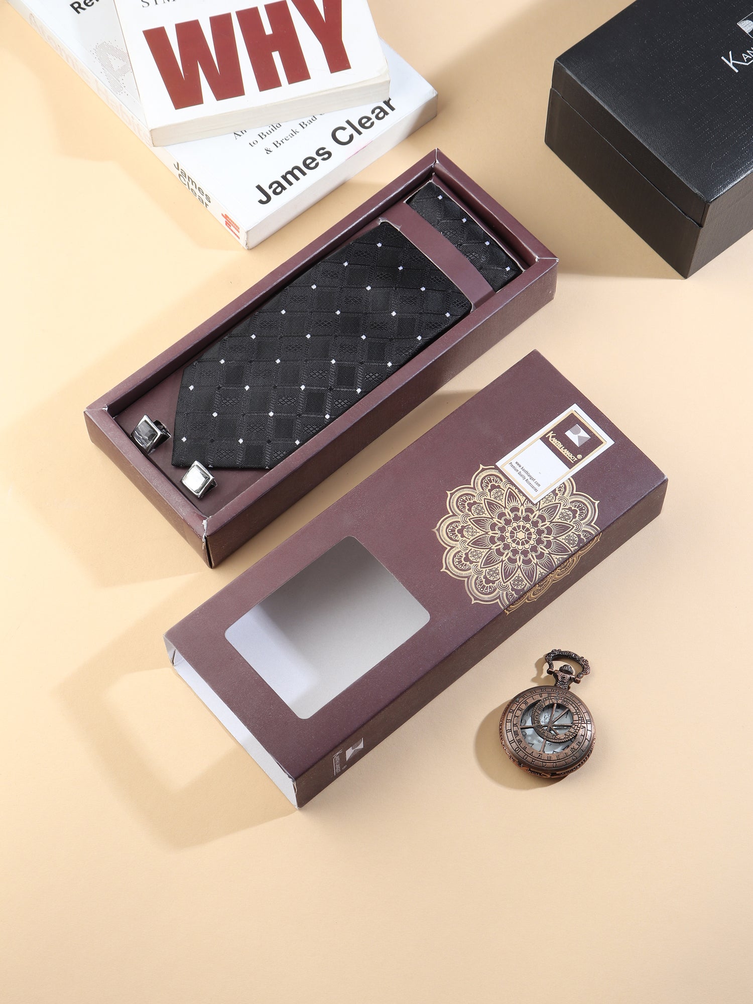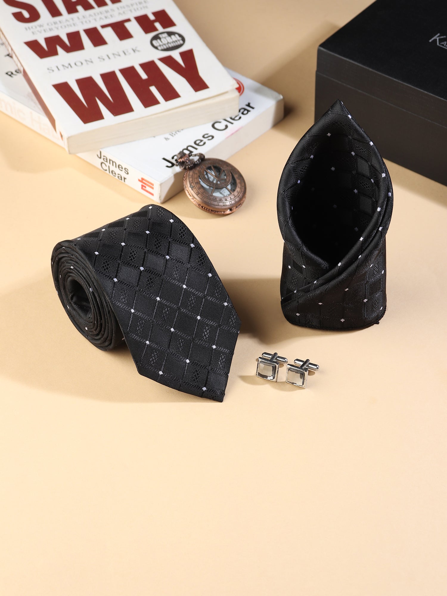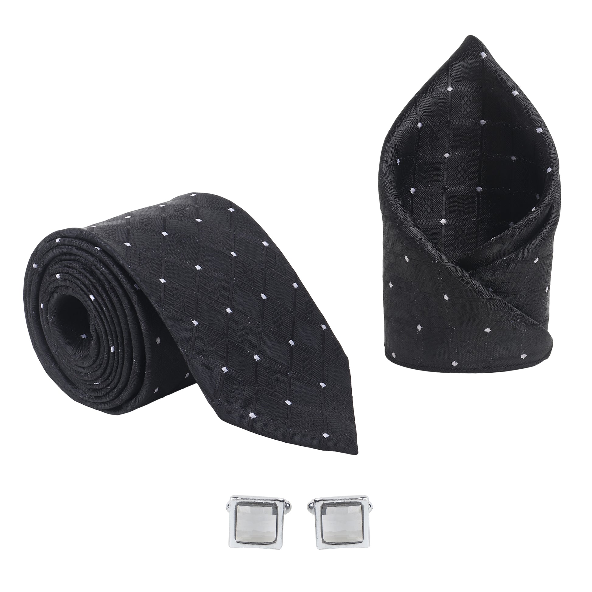 Classic elegance gets a modern twist with the Kanthlangot Men’s Formal Set, featuring a refined black tie with a diamond-check pattern, a matching pocket square, and silver square cufflinks with a polished light stone center for a clean and elevated finish.