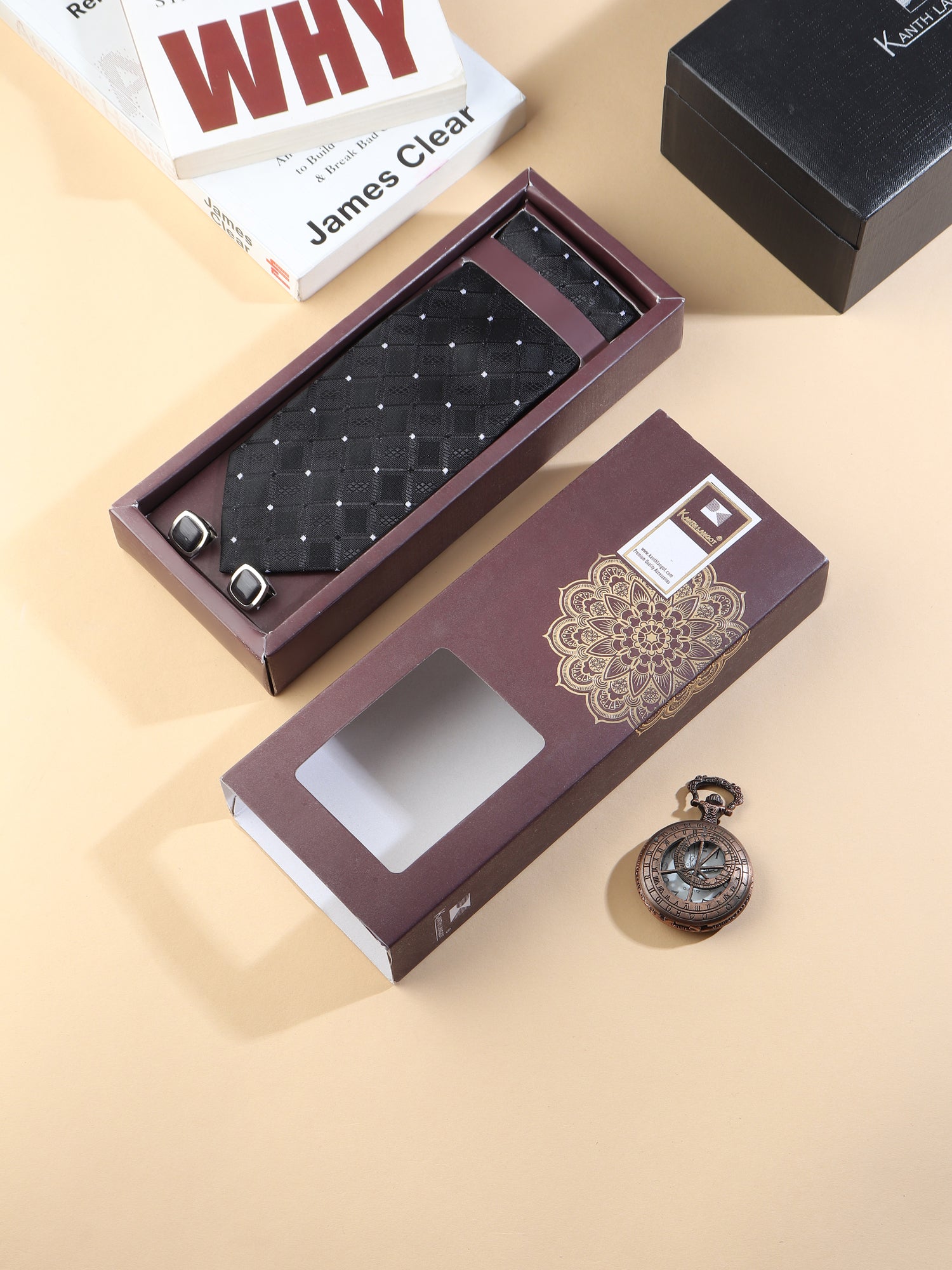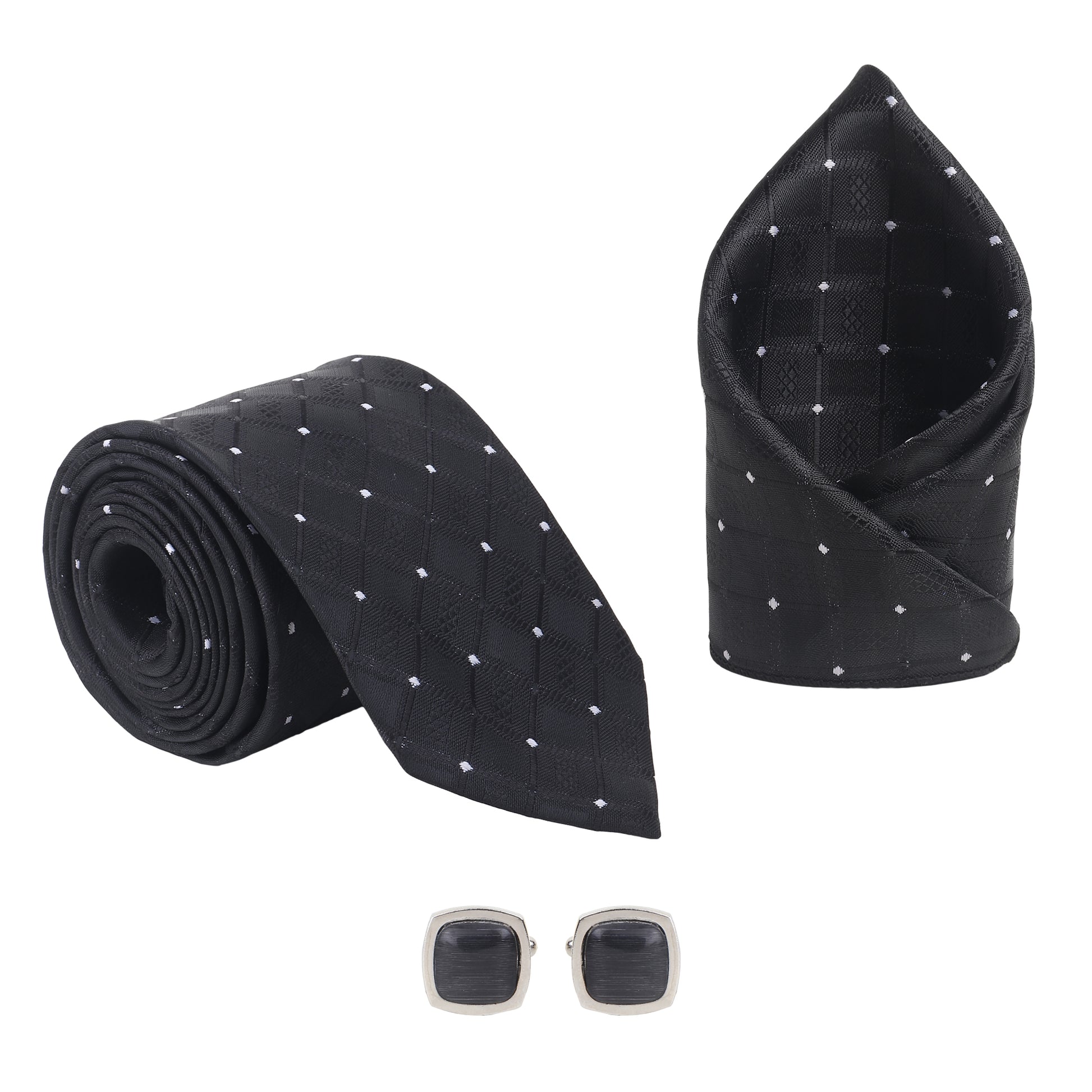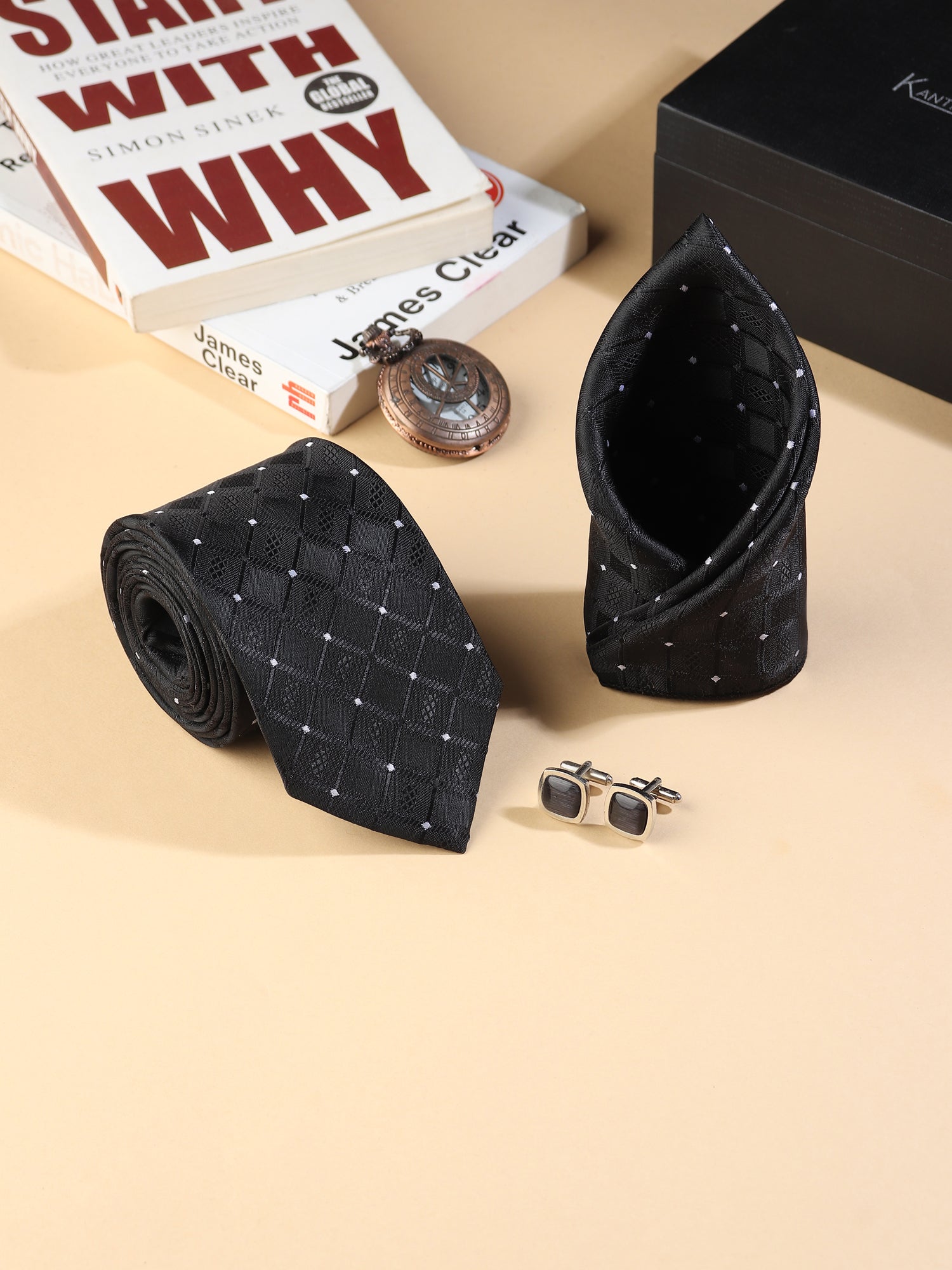 Make an impression with timeless geometry and bold restraint. The Kanthlangot Men’s Formal Set includes a black 3-inch tie with a fine diamond-check pattern, a matching pocket square, and rounded silver cufflinks with a smooth matte black stone—a signature of modern elegance.