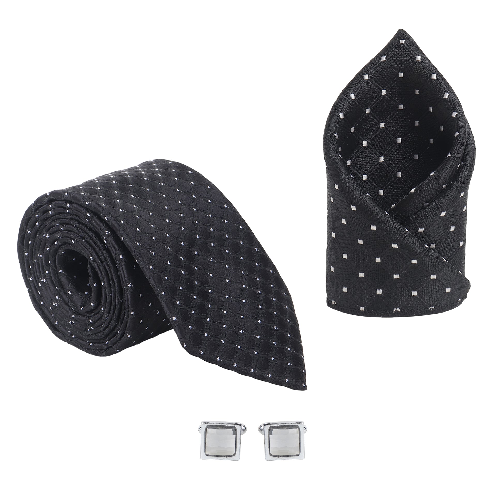 Kanthlangot Men’s 3-Piece Formal Set – Black Dot-Grid Tie, Pocket Square & Square Light Stone Cufflinks (3-Inch Necktie)