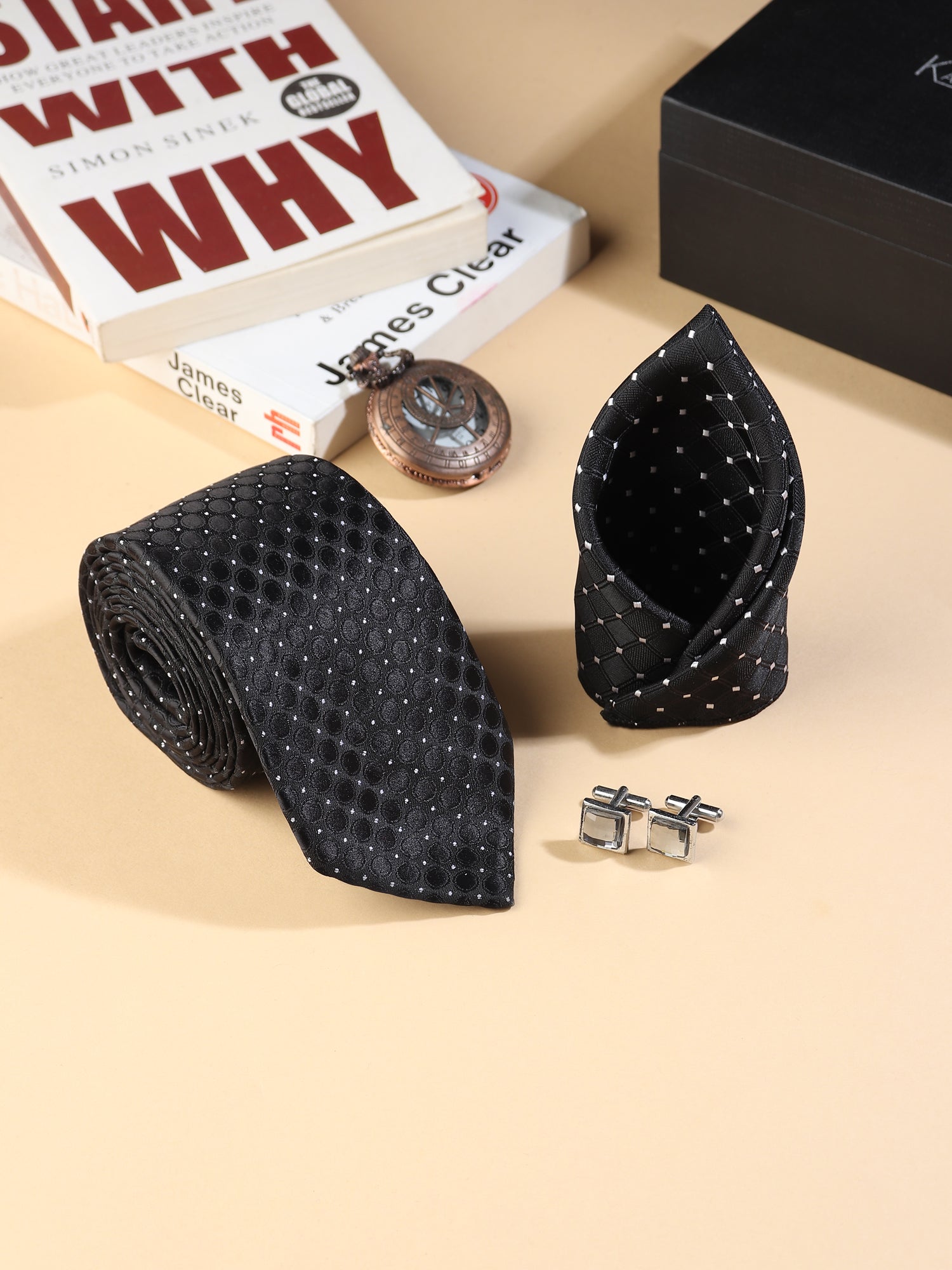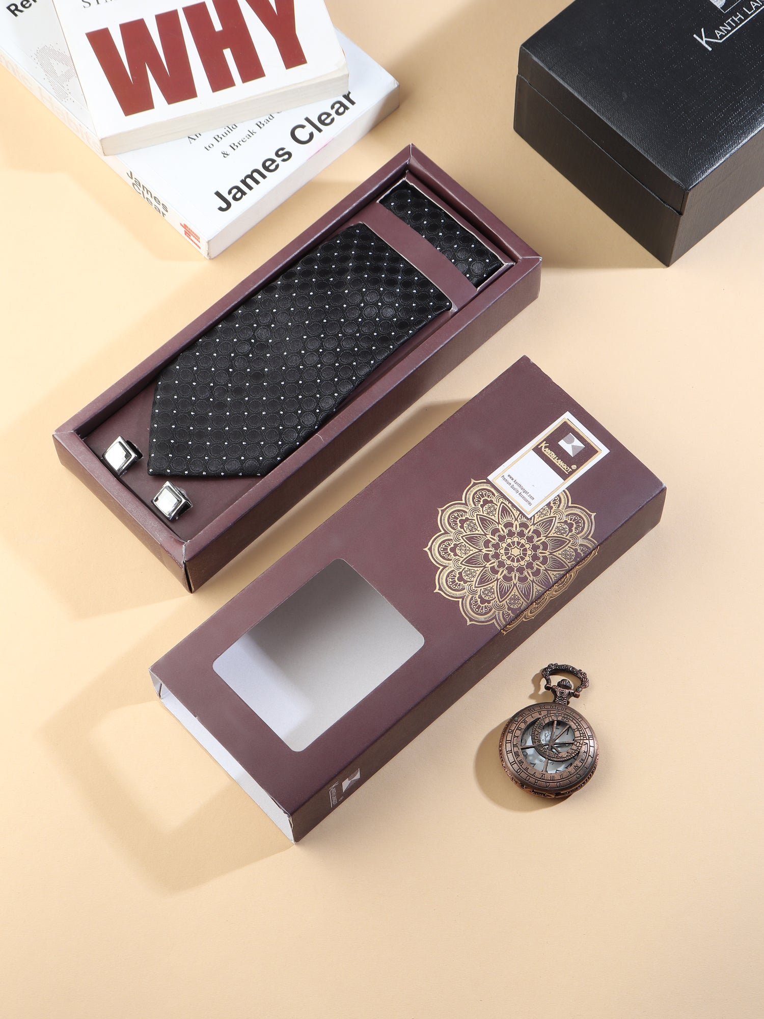 Defined by texture and precision, the Kanthlangot Men’s Formal Set includes a black tie with a raised dot-grid weave, a matching pocket square, and square silver cufflinks with a polished light reflective stone. This refined combination delivers a clean, crisp presence for formal settings and high-end gifting.
