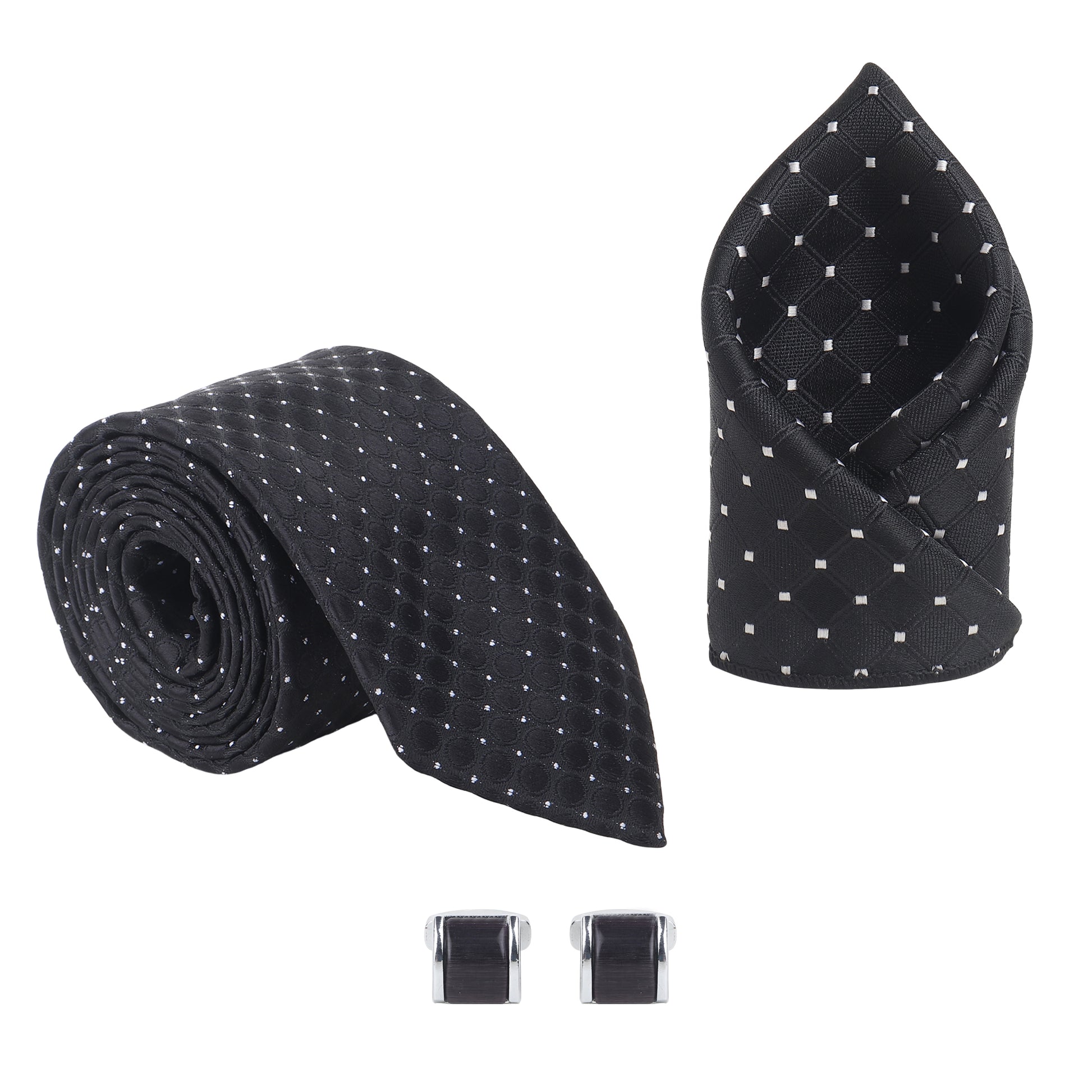 Kanthlangot Men’s 3-Piece Formal Set – Black Dot-Grid Tie, Pocket Square & Rectangular Black Cufflinks (3-Inch Necktie)