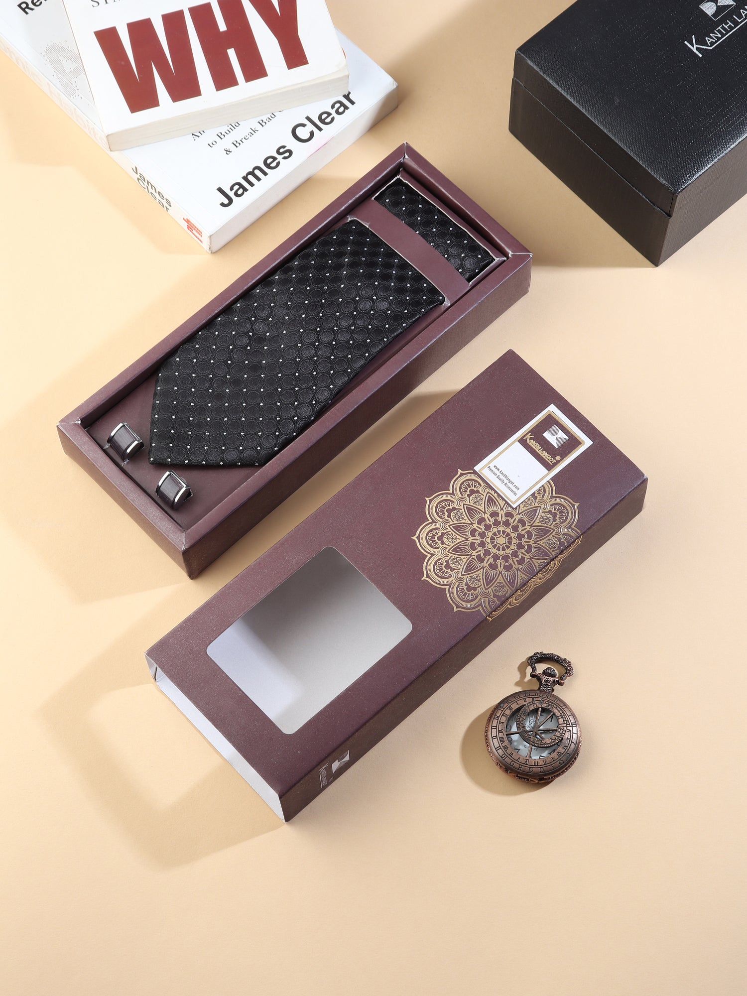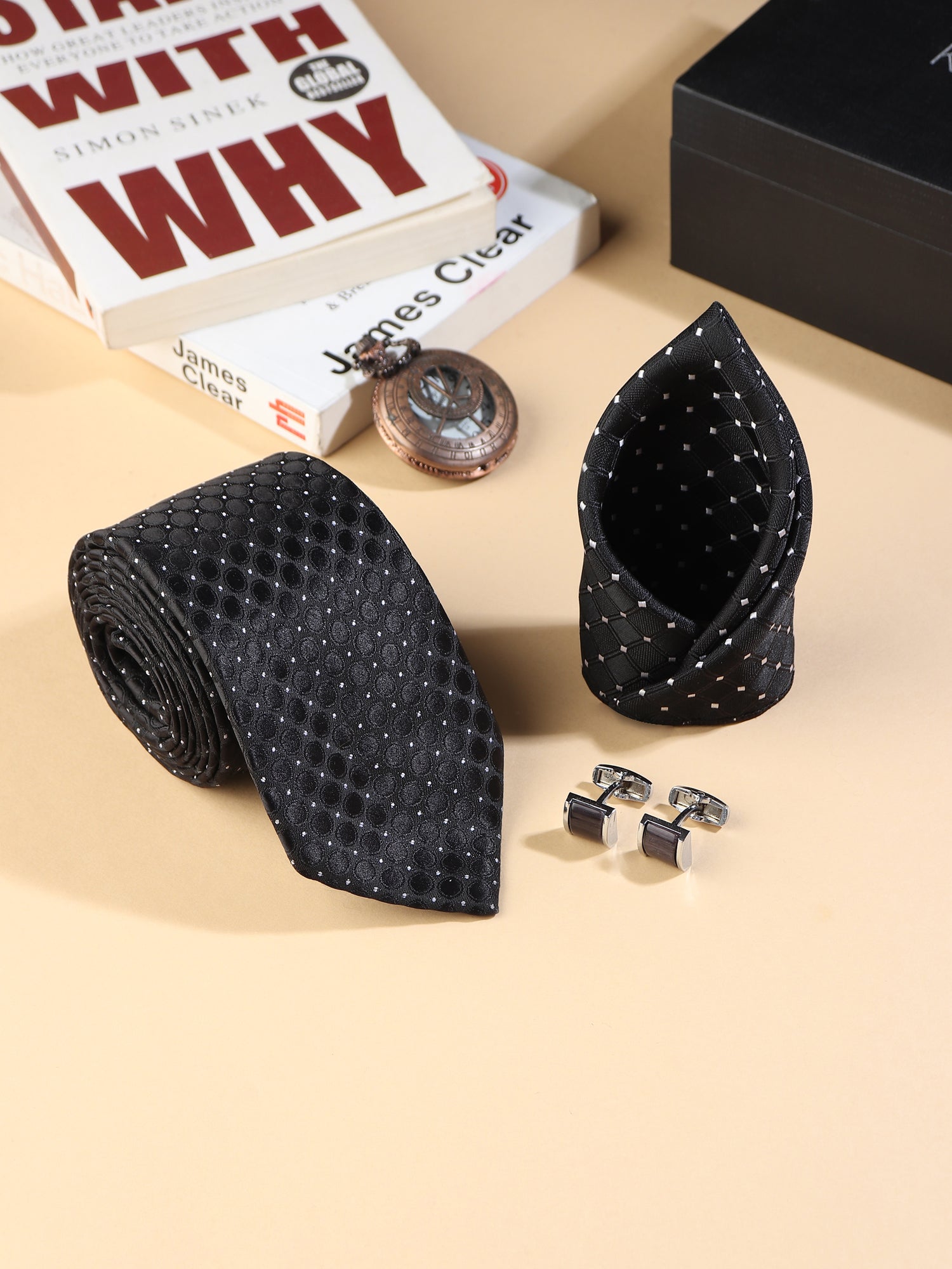 Refined texture meets modern geometry in the Kanthlangot Men’s Formal Set, featuring a standout black tie with a raised dot-grid pattern, coordinated pocket square, and rectangular silver cufflinks with a dark glossy center stone.
