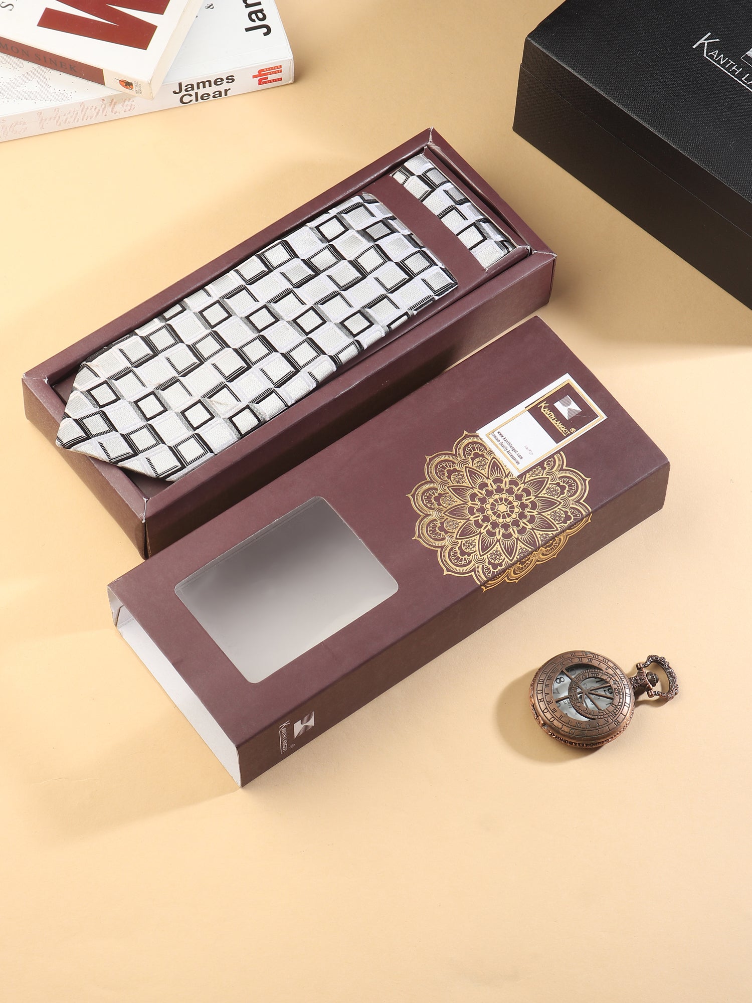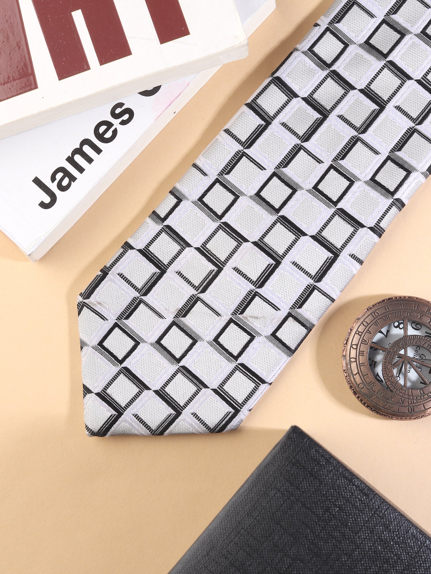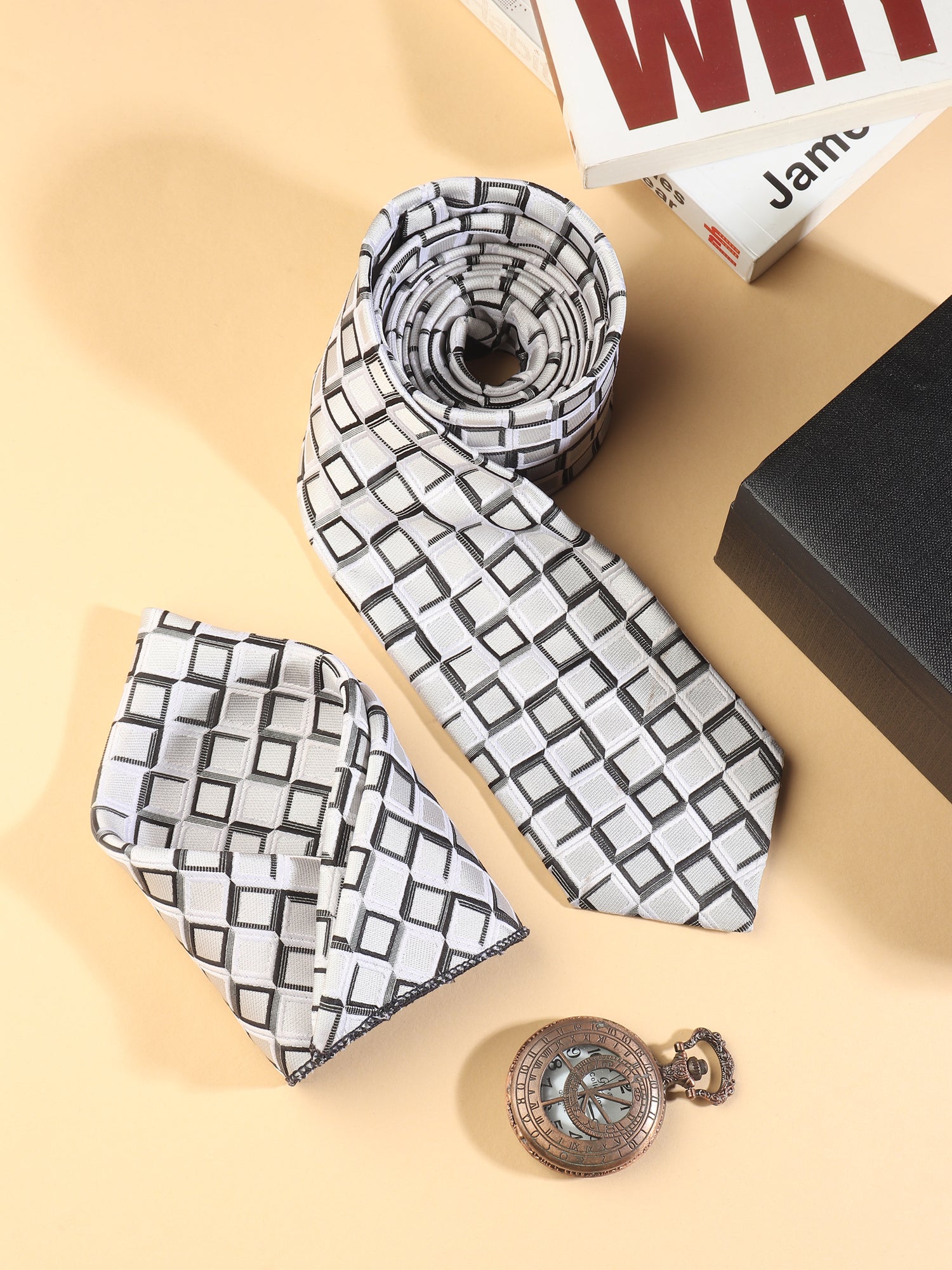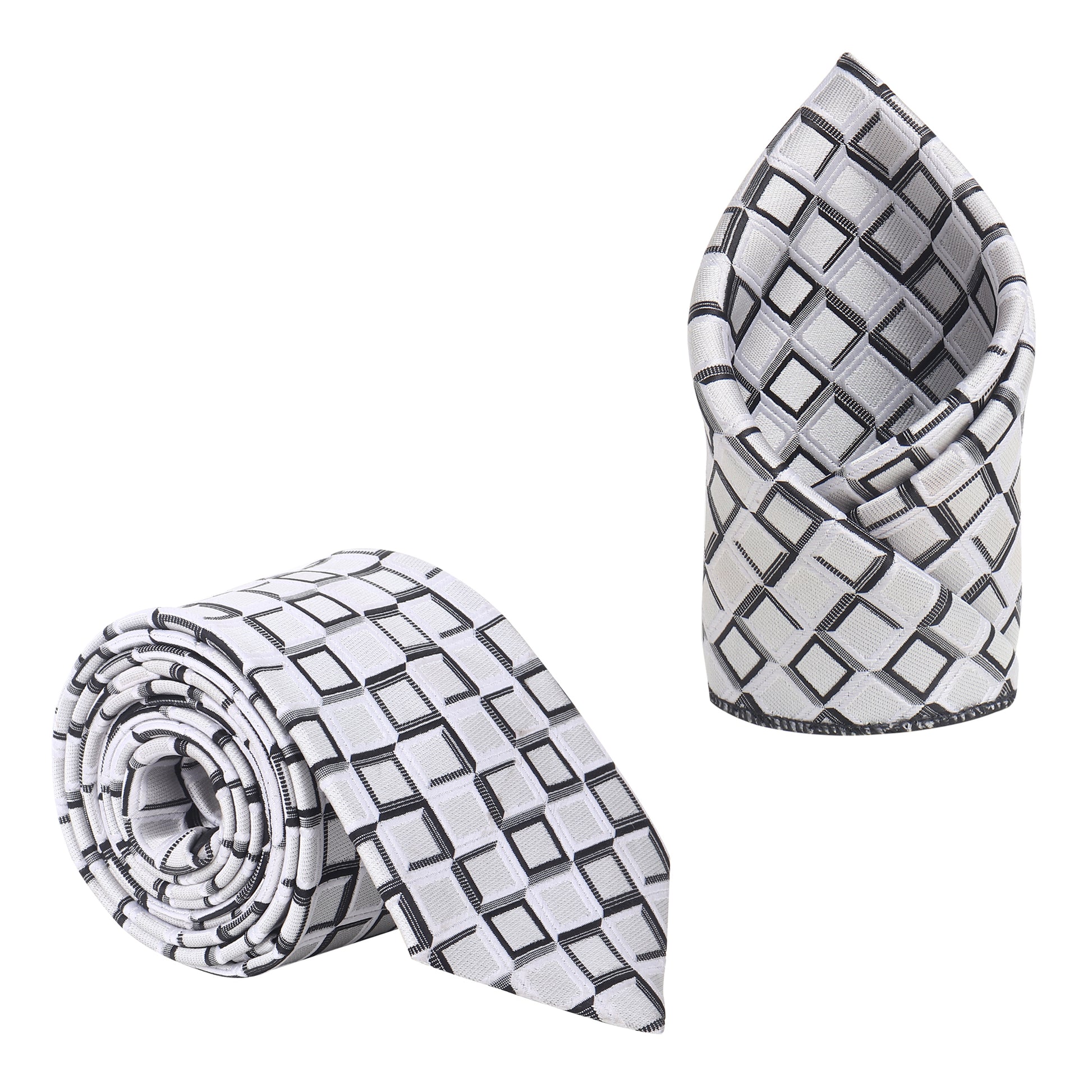 Make a powerful first impression with the Kanthlangot White & Black Geometric Necktie & Pocket Square Set. Featuring a sharp white base adorned with modern black square patterns, this set brings a bold twist to classic formalwear. Whether paired with a dark suit or a crisp shirt, it effortlessly balances contrast and sophistication.