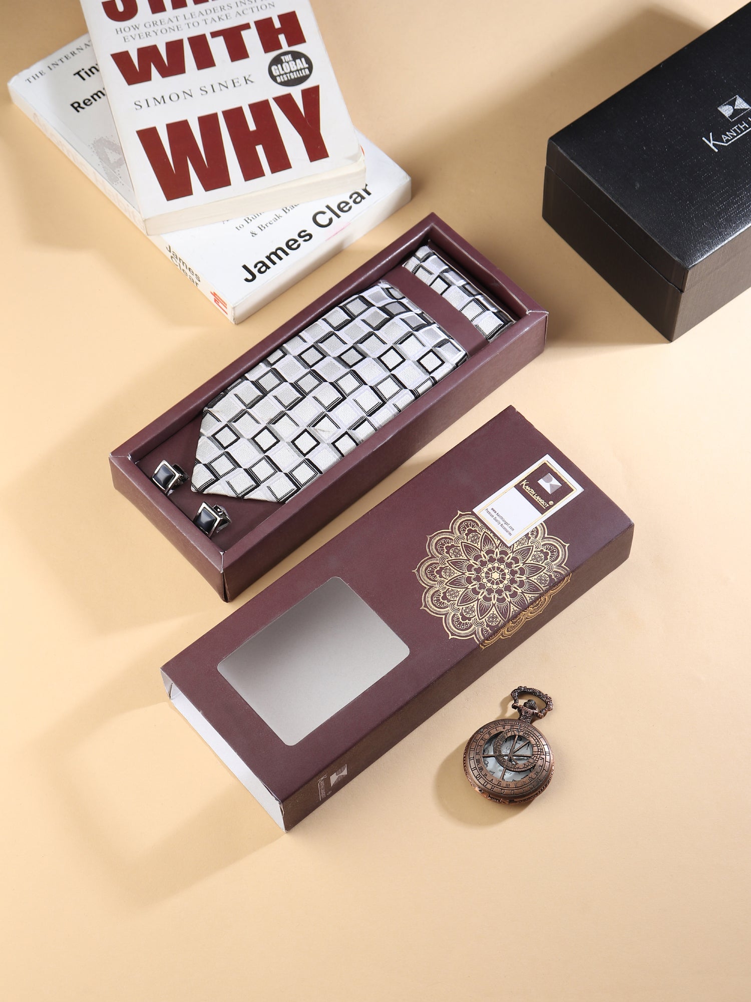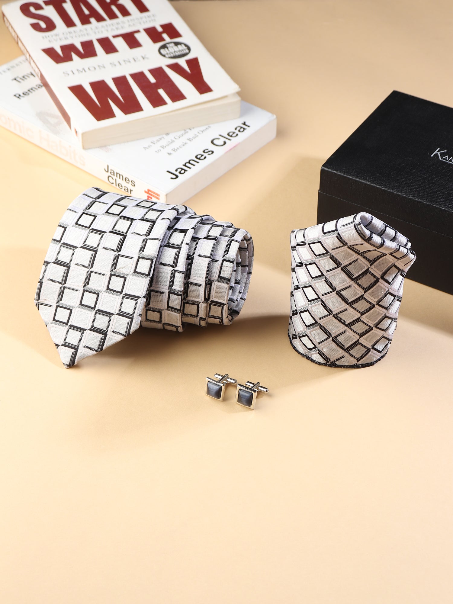 Kanthlangot Men’s 3-Piece Formal Set – Geometric Square Tie, Pocket Square & Black Stone Cufflinks (3-Inch Necktie)