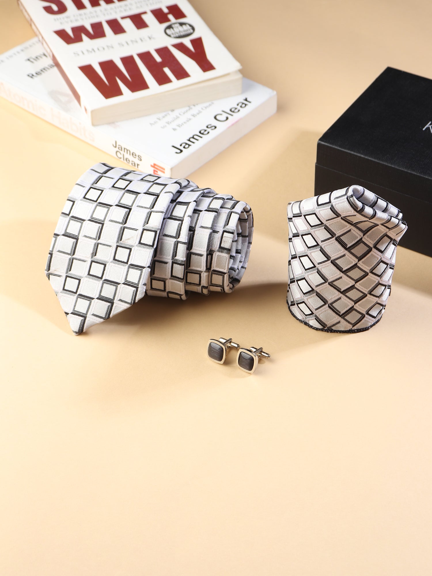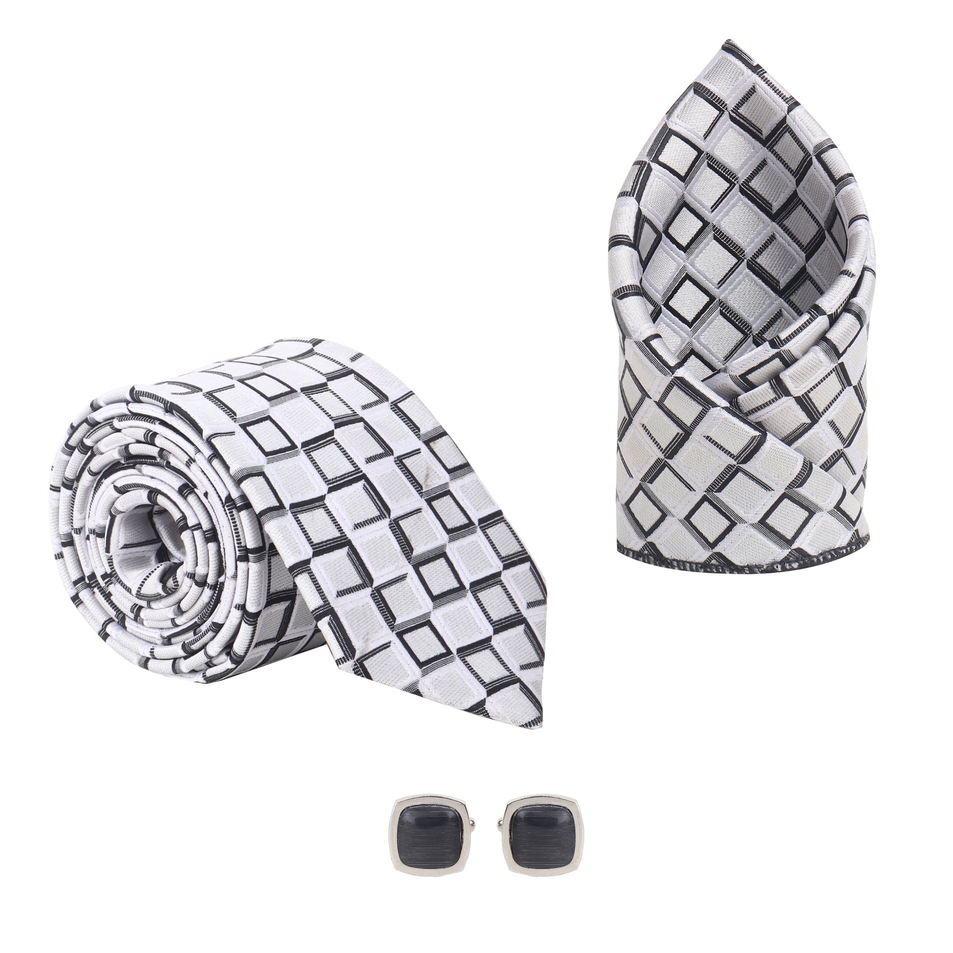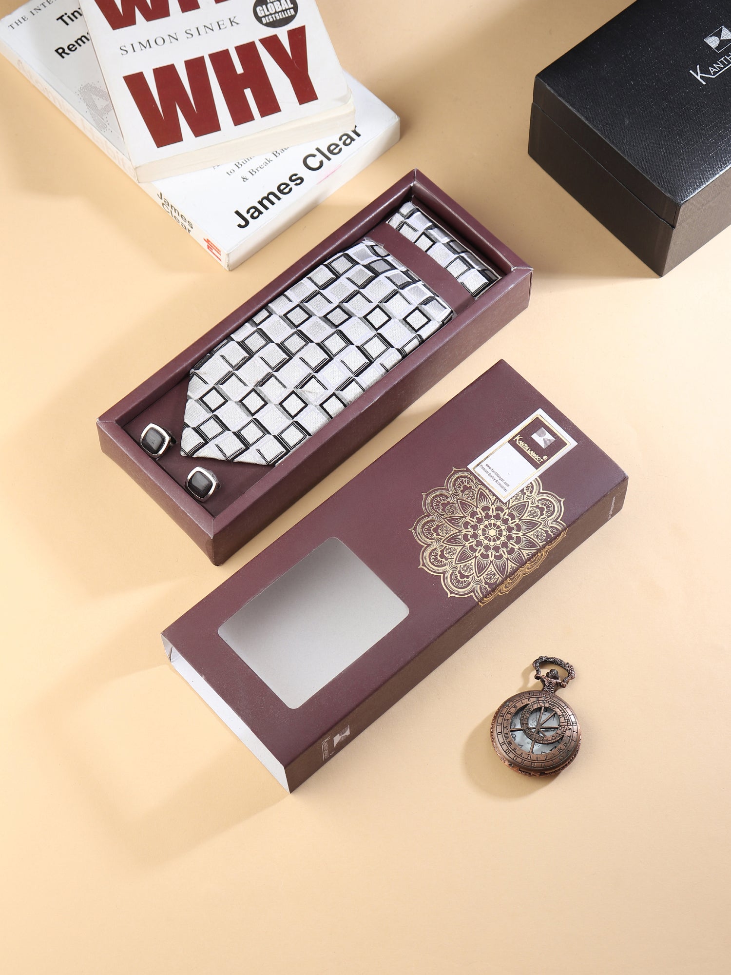 Make a confident statement with the Kanthlangot Men’s Formal Set, featuring a striking 3-inch wide tie adorned with a white and black geometric square pattern. Paired with a coordinating pocket square and elegant silver cufflinks with black stone centers, this set elevates your formal look for weddings, corporate events, and sophisticated occasions.