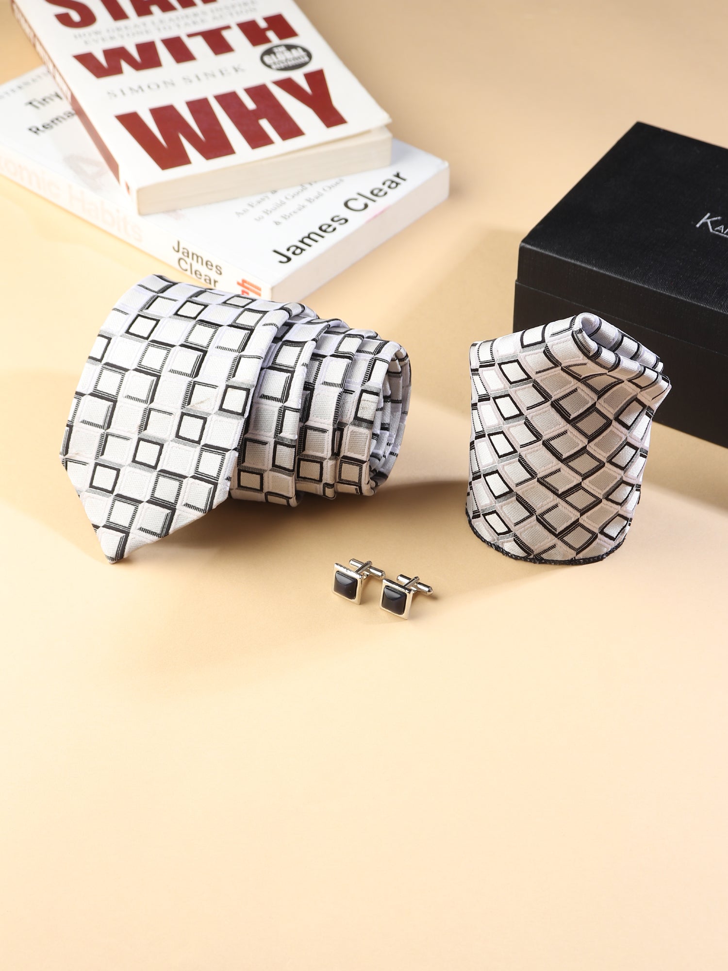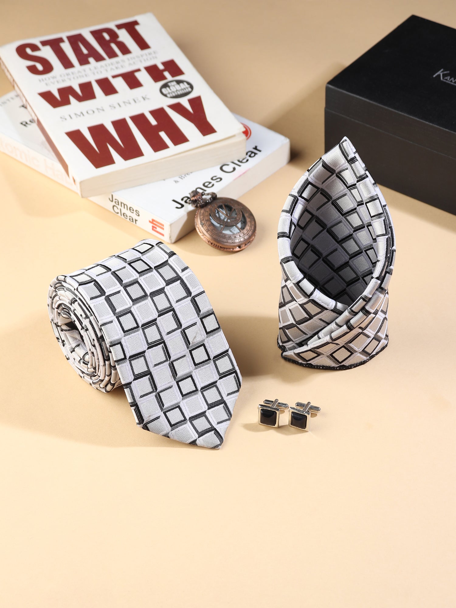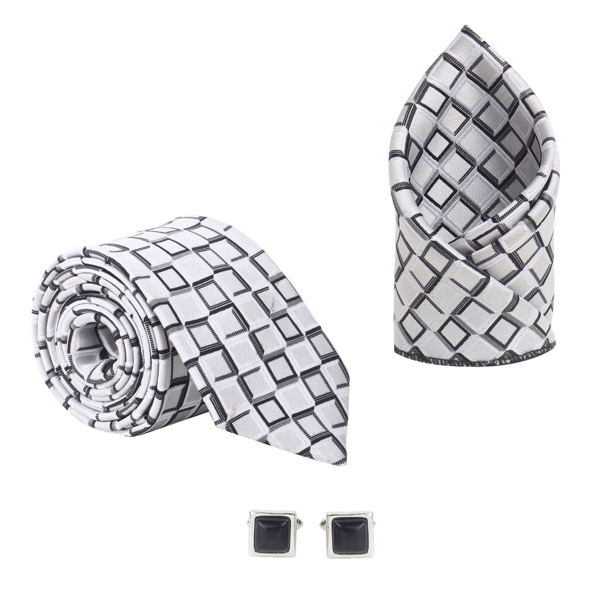 Make a confident statement with the Kanthlangot Men’s Formal Set, featuring a striking 3-inch wide tie adorned with a white and black geometric square pattern. Paired with a coordinating pocket square and elegant silver cufflinks with dark stone centers, this set elevates your formal look for weddings, corporate events, and sophisticated occasions.