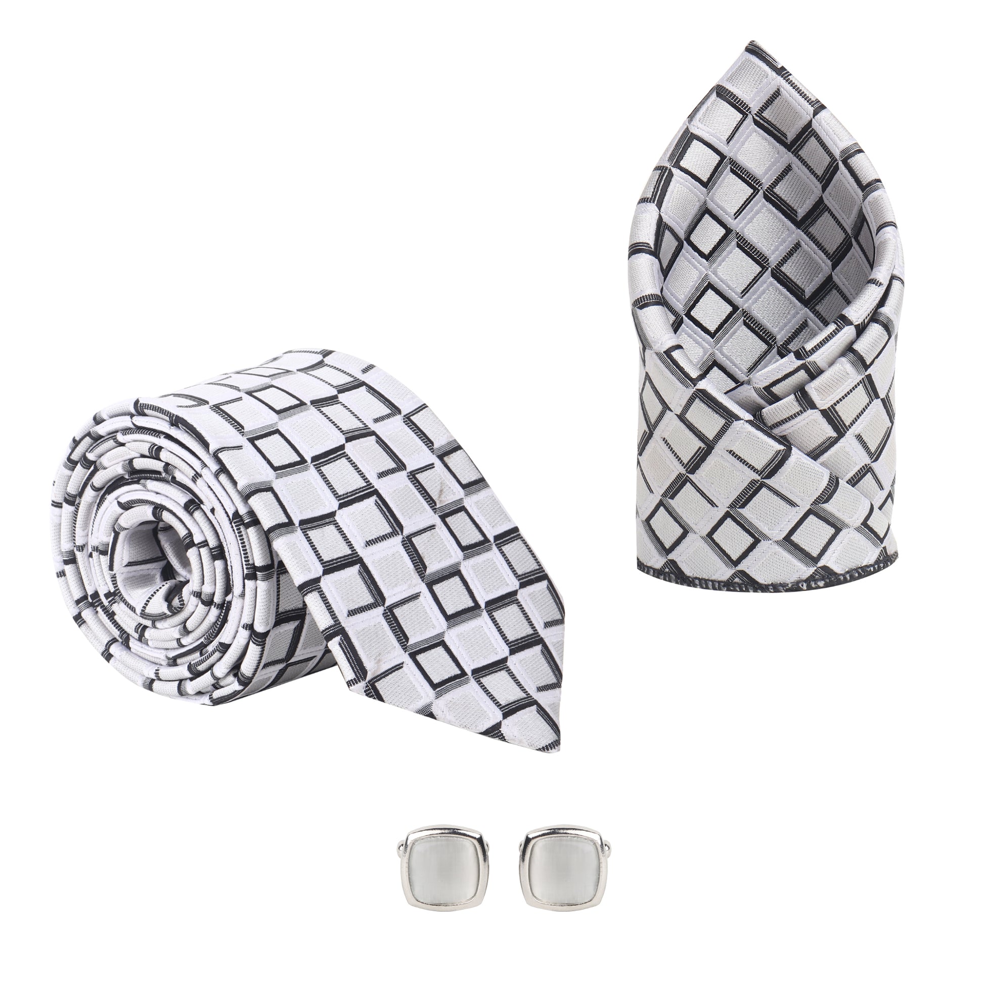 Kanthlangot Men’s 3-Piece Formal Set – Geometric Tie, Pocket Square & Light Silver Cufflinks (3-Inch Necktie)