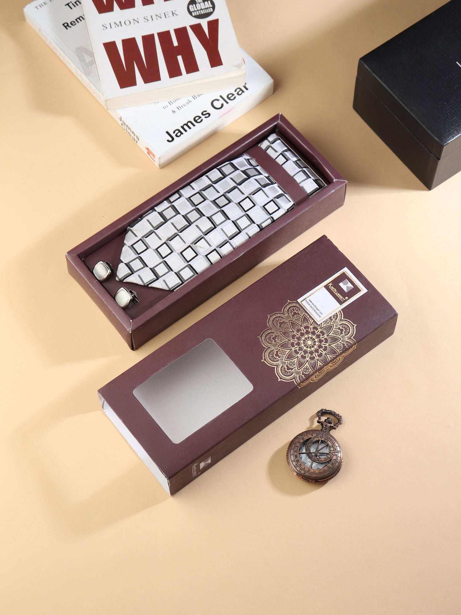 Make a refined statement at every occasion with the Kanthlangot Men’s 3-Piece Formal Set, featuring a distinctive white and black geometric square pattern tie, a matching pocket square, and elegant crystal-studded silver cufflinks.