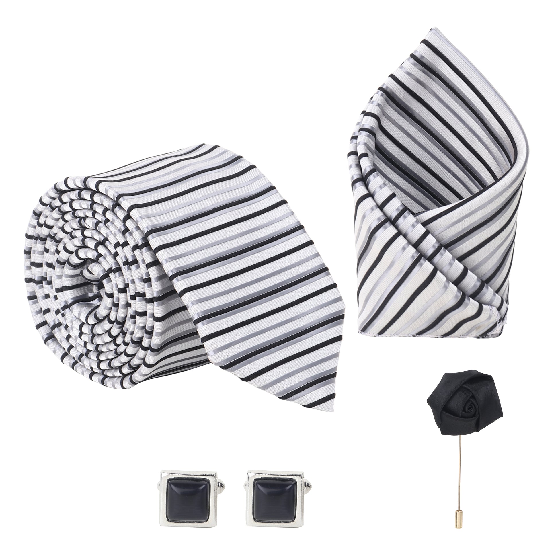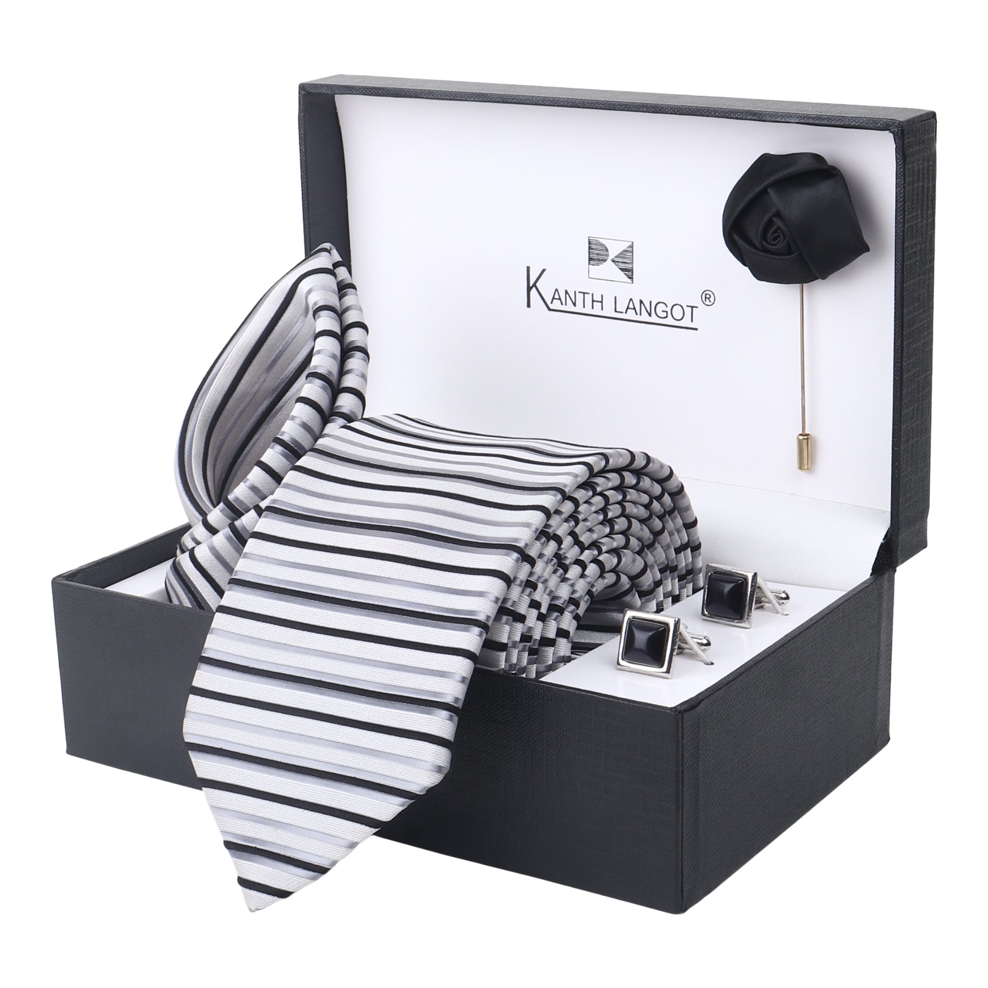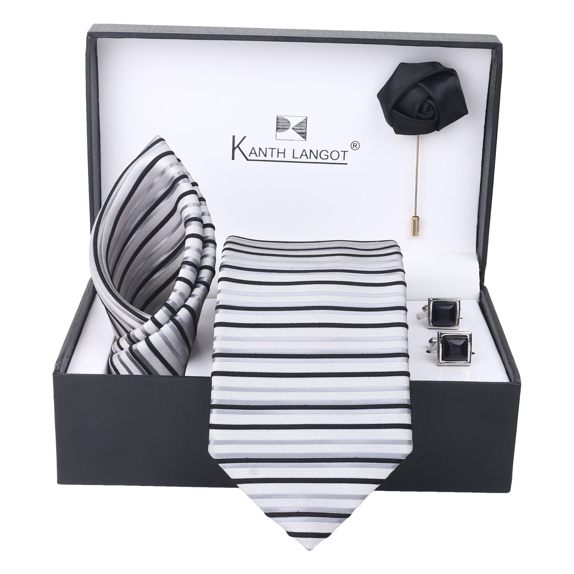 Kanthlangot Grey-White Striped Necktie Gift Set – Set of 4 with Pocket Square, Cufflinks & Black Lapel Pin