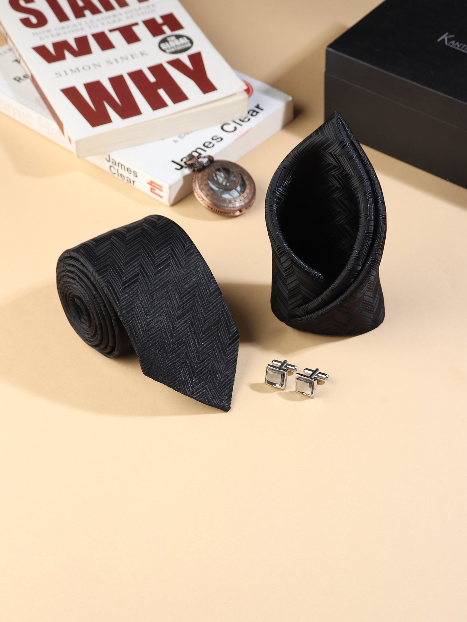 For the modern gentleman who values subtle sophistication, the Kanthlangot Men’s Formal Set is the perfect finishing touch. This trio features a rich black herringbone tie, a coordinated pocket square, and square silver cufflinks with a refined light stone center that catches the light with elegance.