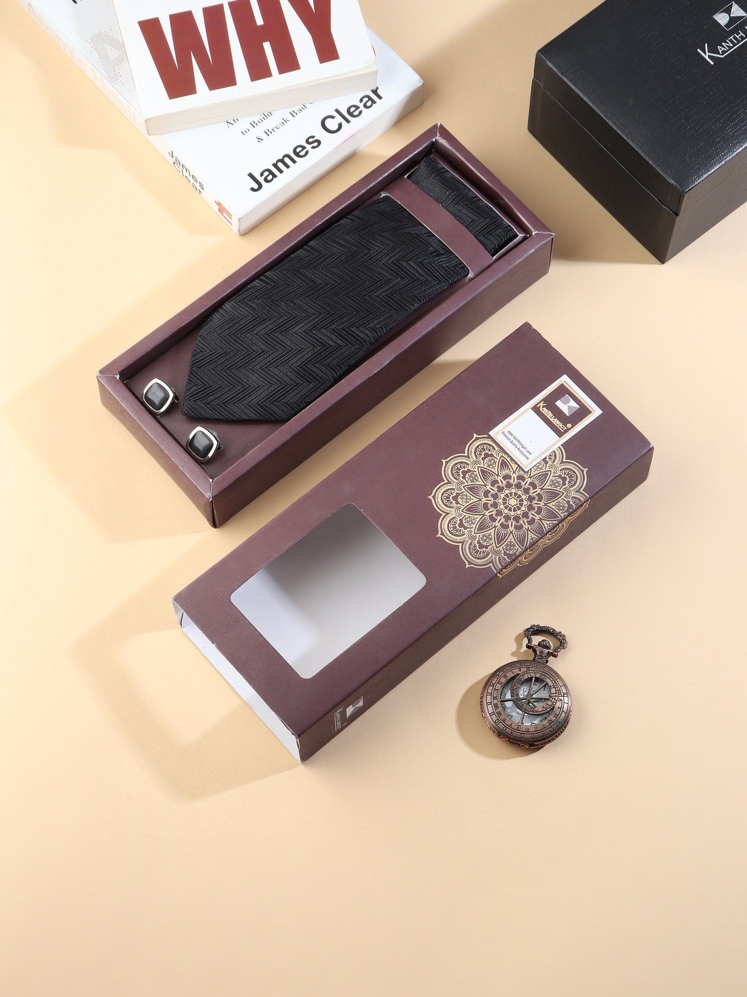 Minimalism meets depth in the Kanthlangot Men’s Formal Set, made for modern gentlemen who appreciate understated style. Featuring a textured black herringbone tie, a matching pocket square, and rounded silver cufflinks with a matte black stone center, this set balances classic tailoring with bold finesse.