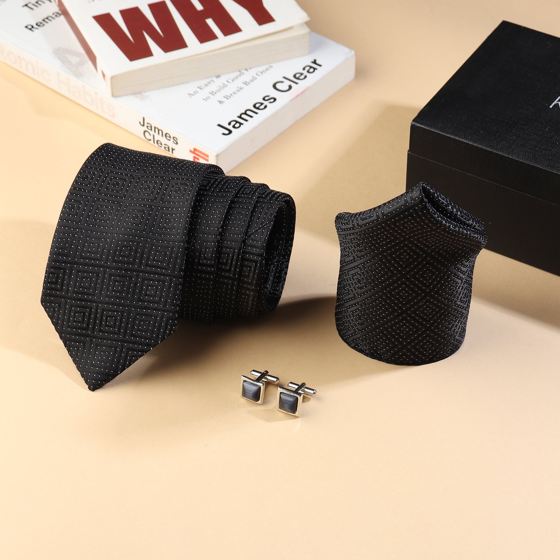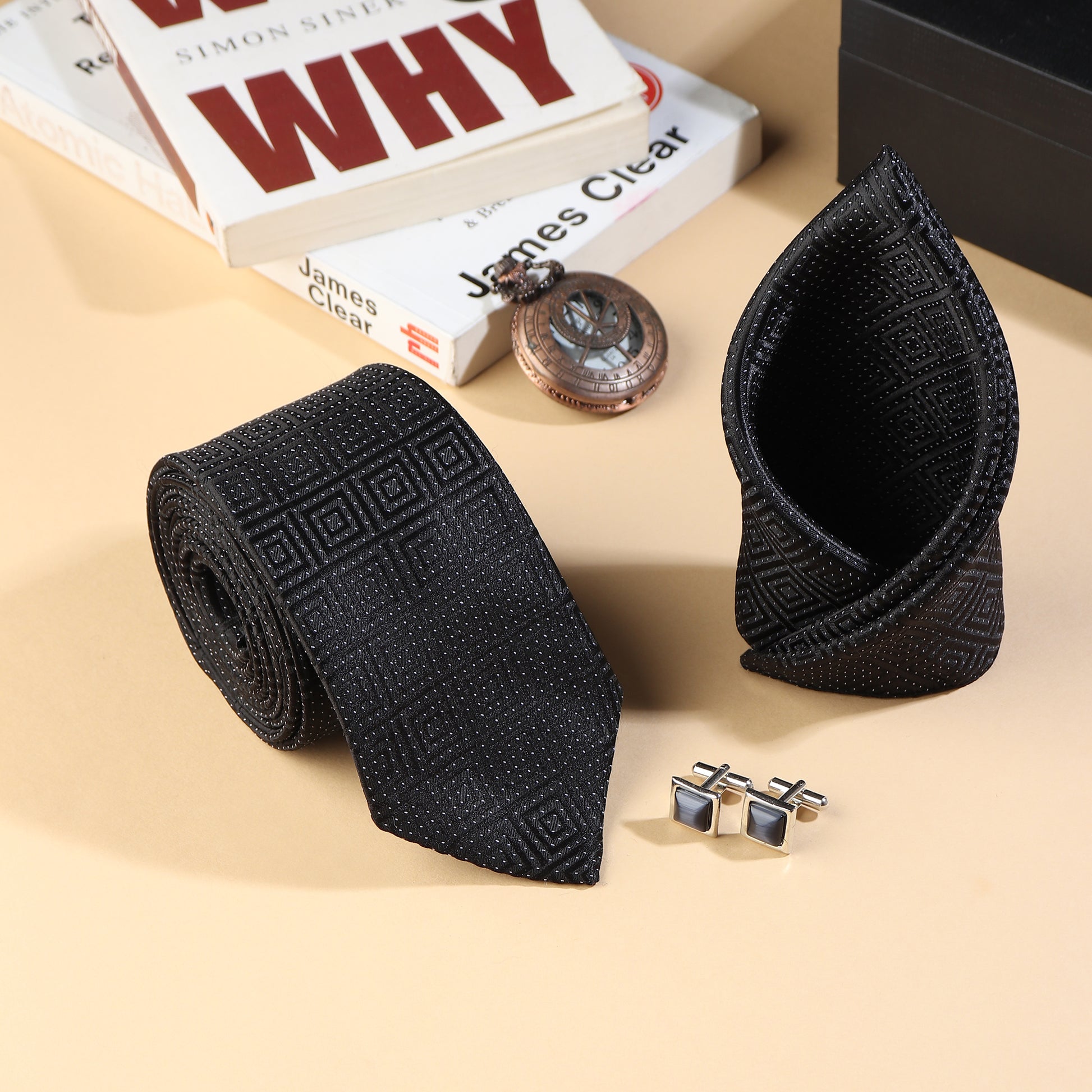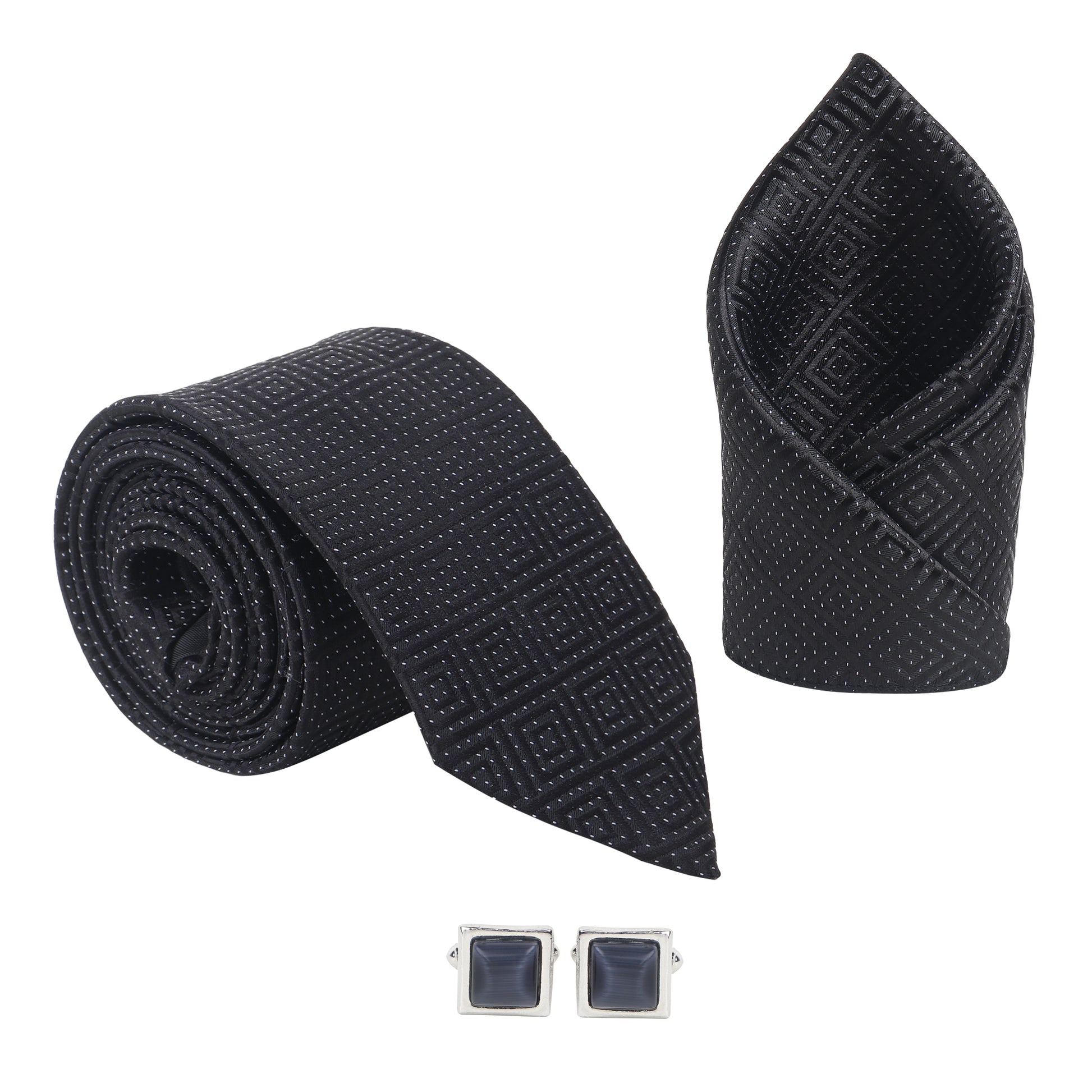 Kanthlangot Men’s 3-Piece Formal Set – Black Maze-Pattern Tie, Pocket Square & Grey Cat’s Eye Cufflinks (3-Inch Necktie)