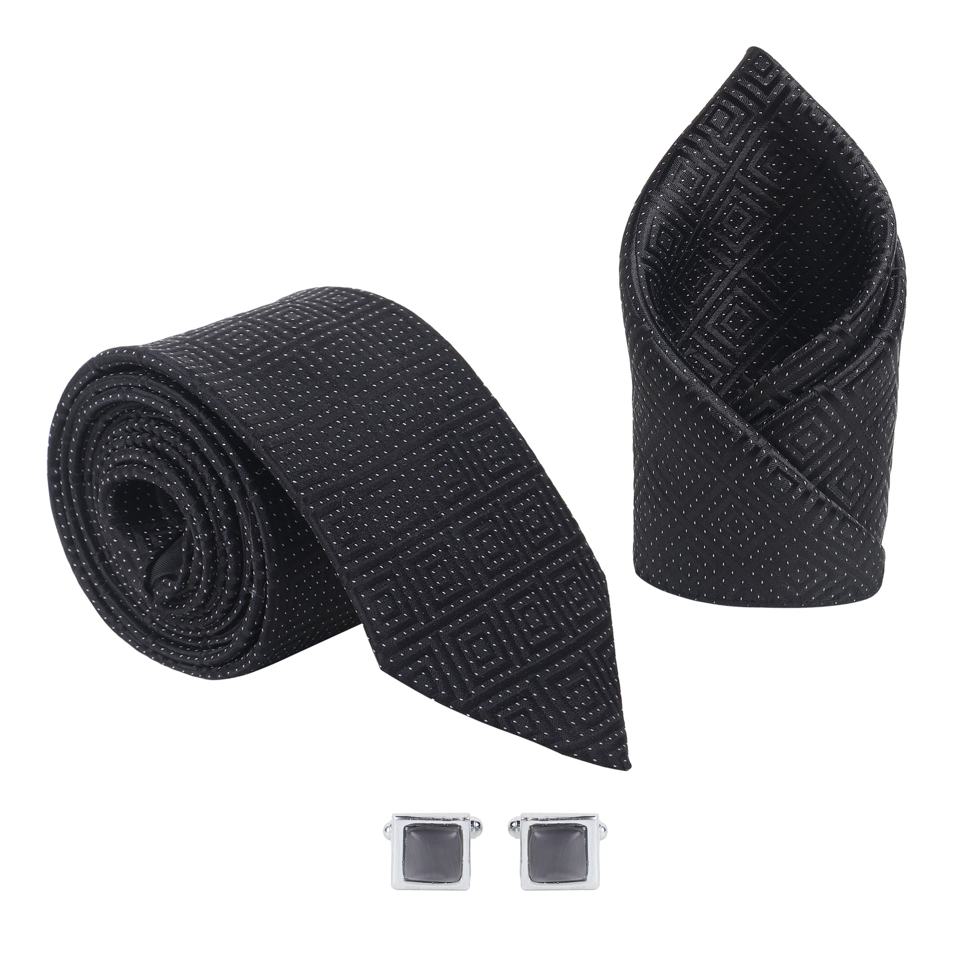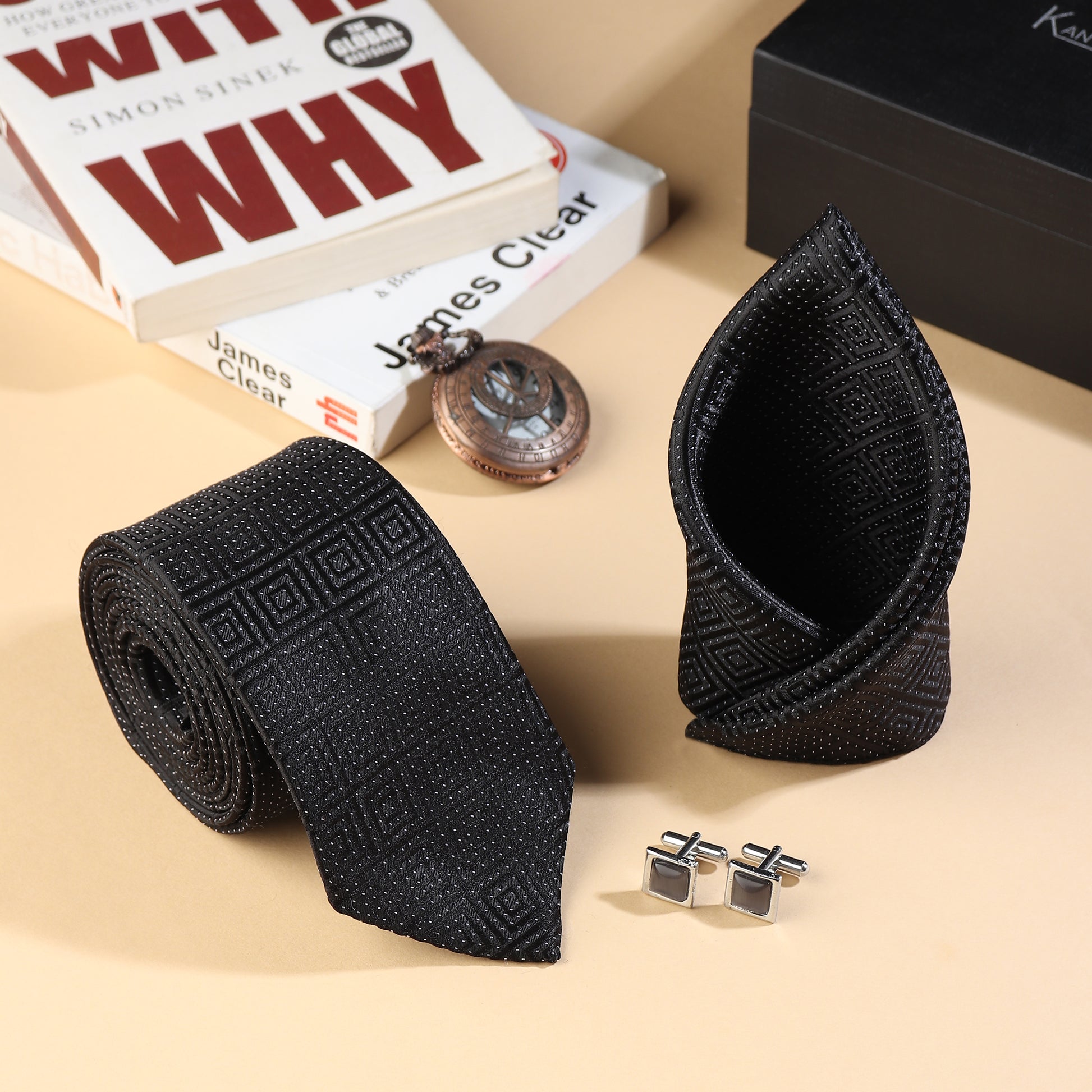 Kanthlangot Men’s 3-Piece Formal Set – Black Maze-Texture Tie, Pocket Square & Polished Grey Cufflinks (3-Inch Necktie)