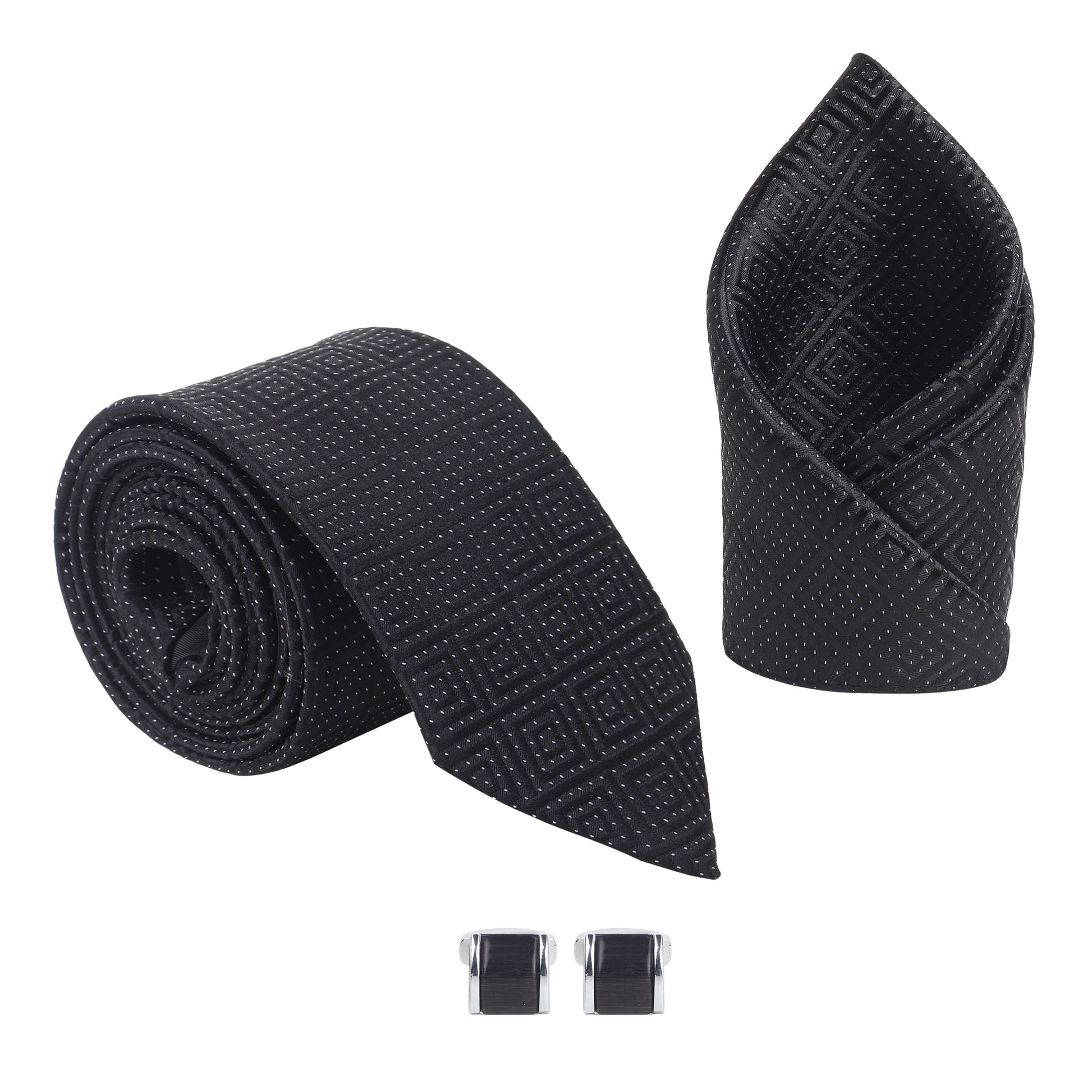 Crafted from wrinkle-resistant microfiber, the tie and pocket square deliver elegance without effort. The cufflinks offer a confident finish with a masculine, angular silhouette—perfect for gifting or personal styling.