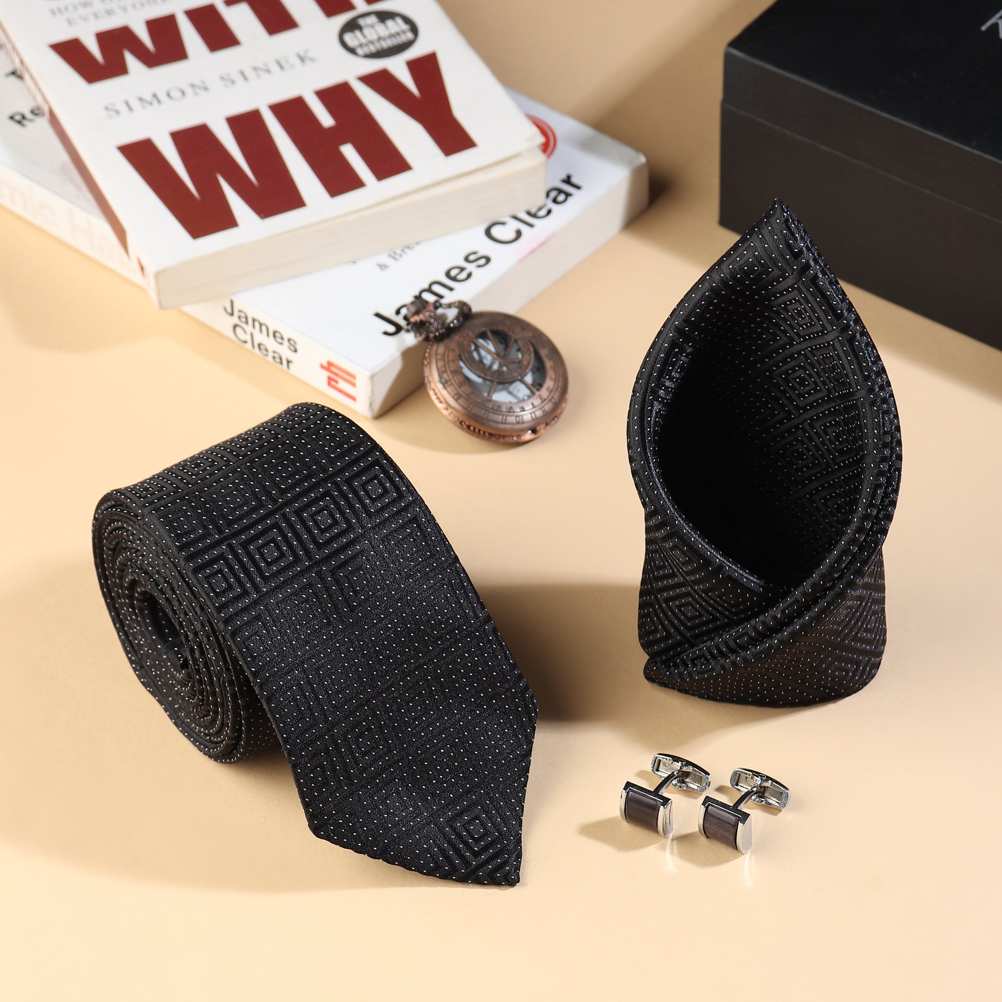 Kanthlangot Men’s 3-Piece Formal Set – Black Maze-Pattern Tie, Pocket Square & Rectangular Dark Cufflinks (3-Inch Necktie)