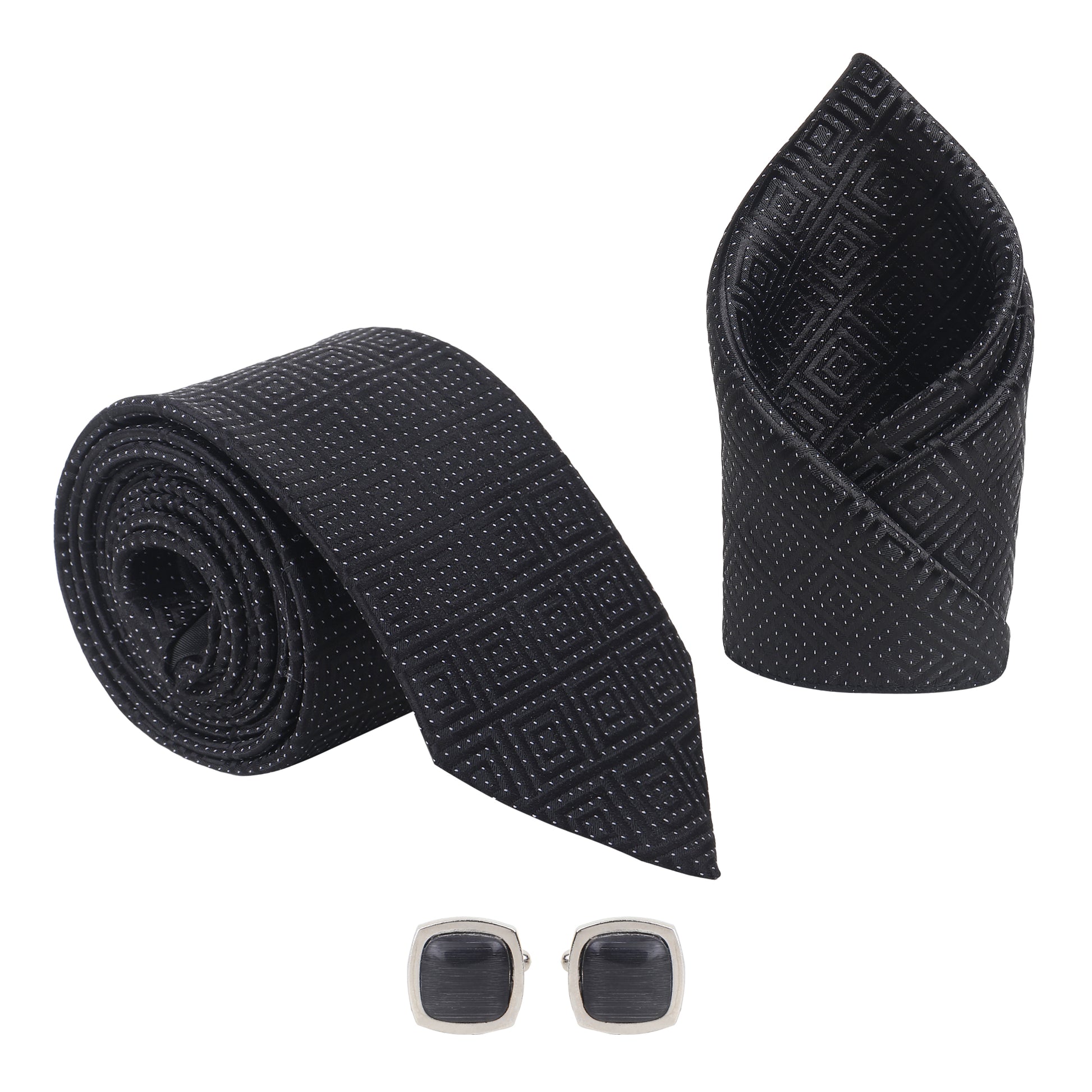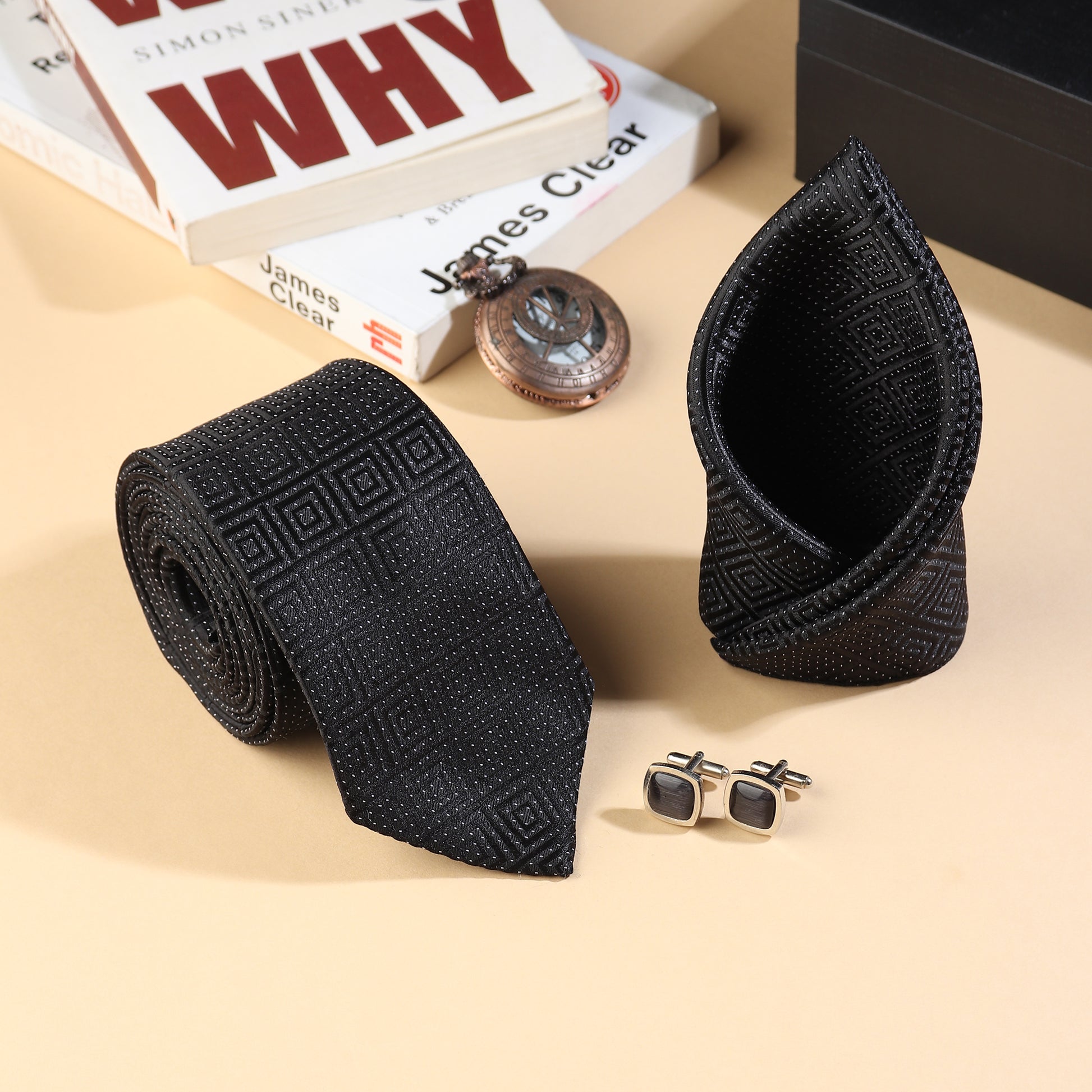 Kanthlangot Men’s 3-Piece Formal Set – Black Maze-Pattern Tie, Pocket Square & Brushed Black Cufflinks (3-Inch Necktie)