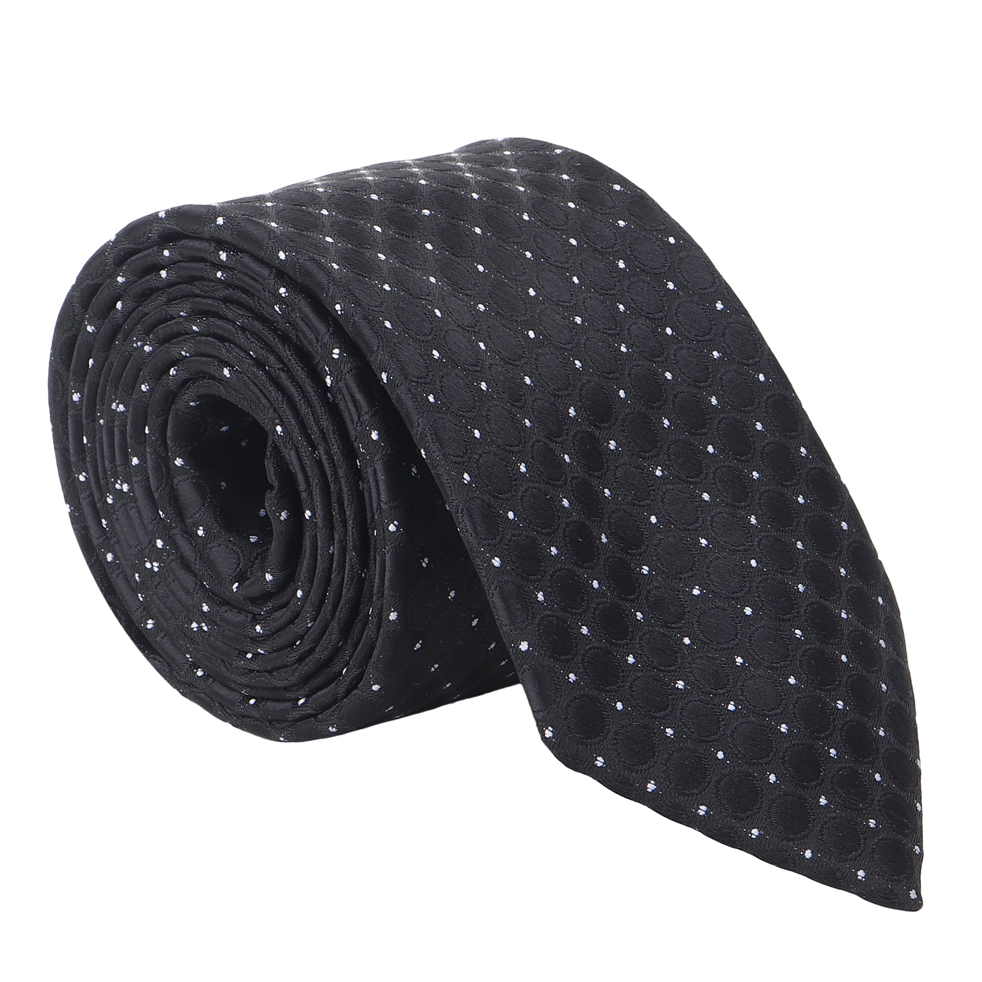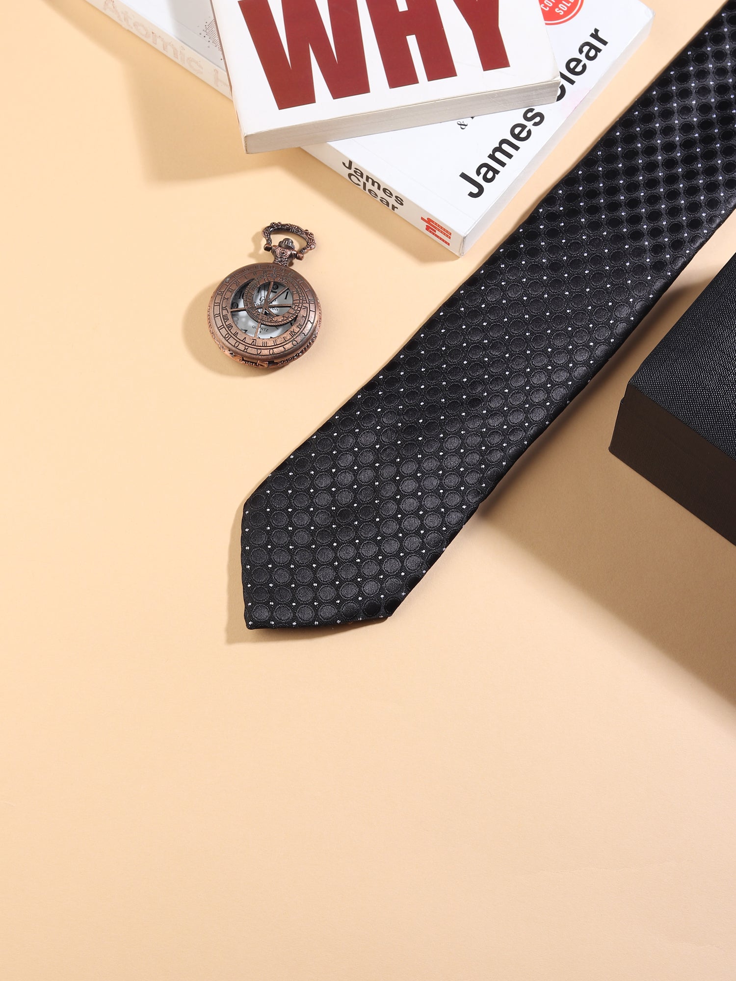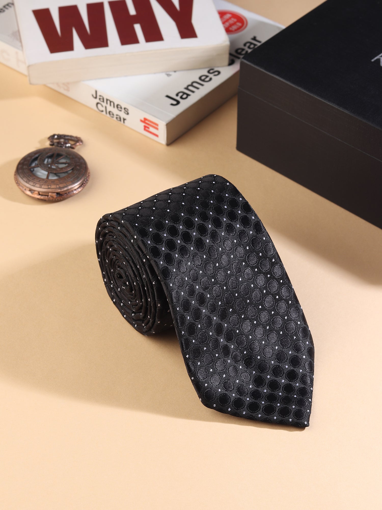 Elevate your formal attire with the Black Textured Necktie by Kanthlangot. This tie features a sophisticated circular texture complemented by subtle white dots, making it a perfect choice for both professional and evening wear.