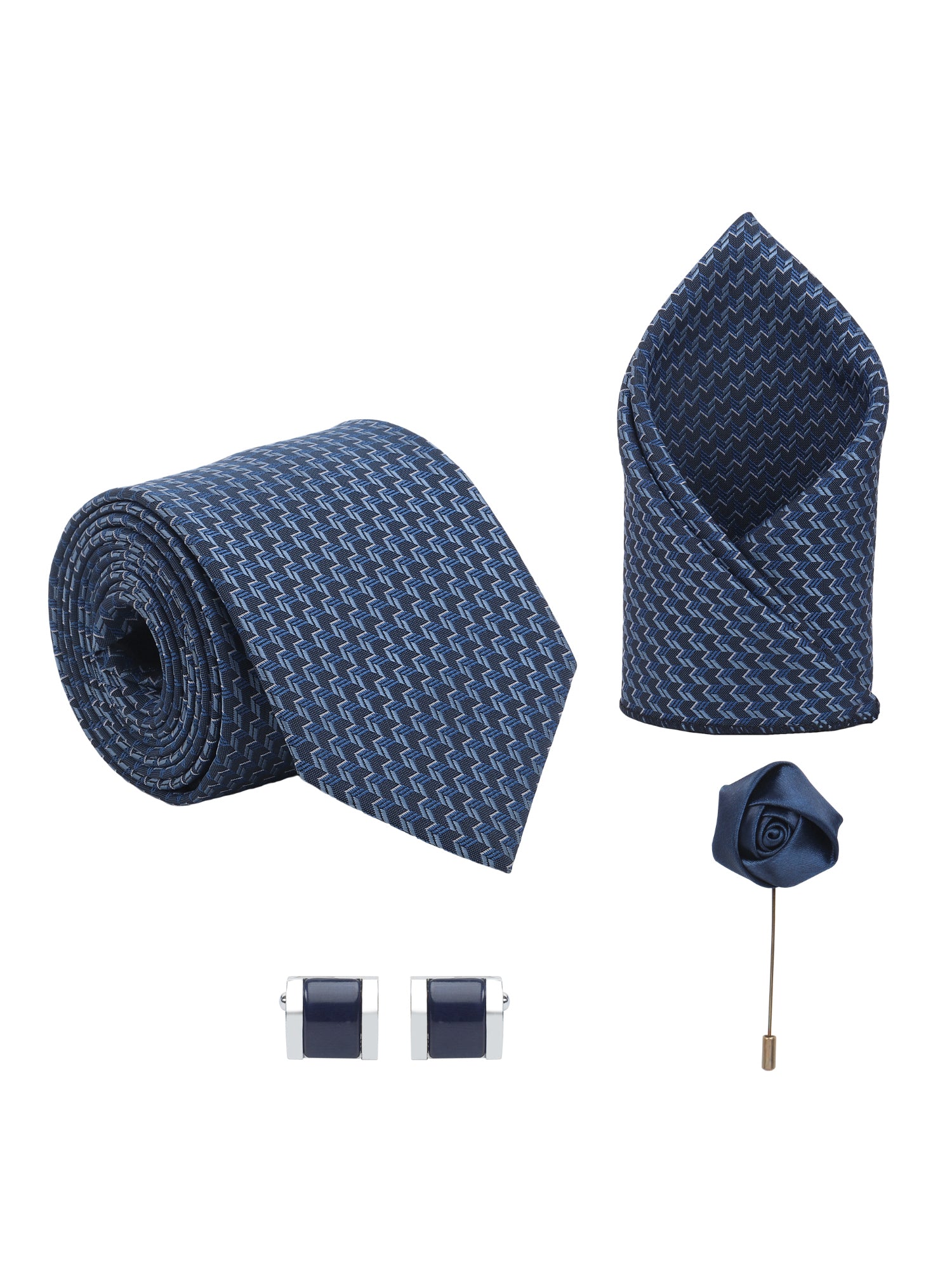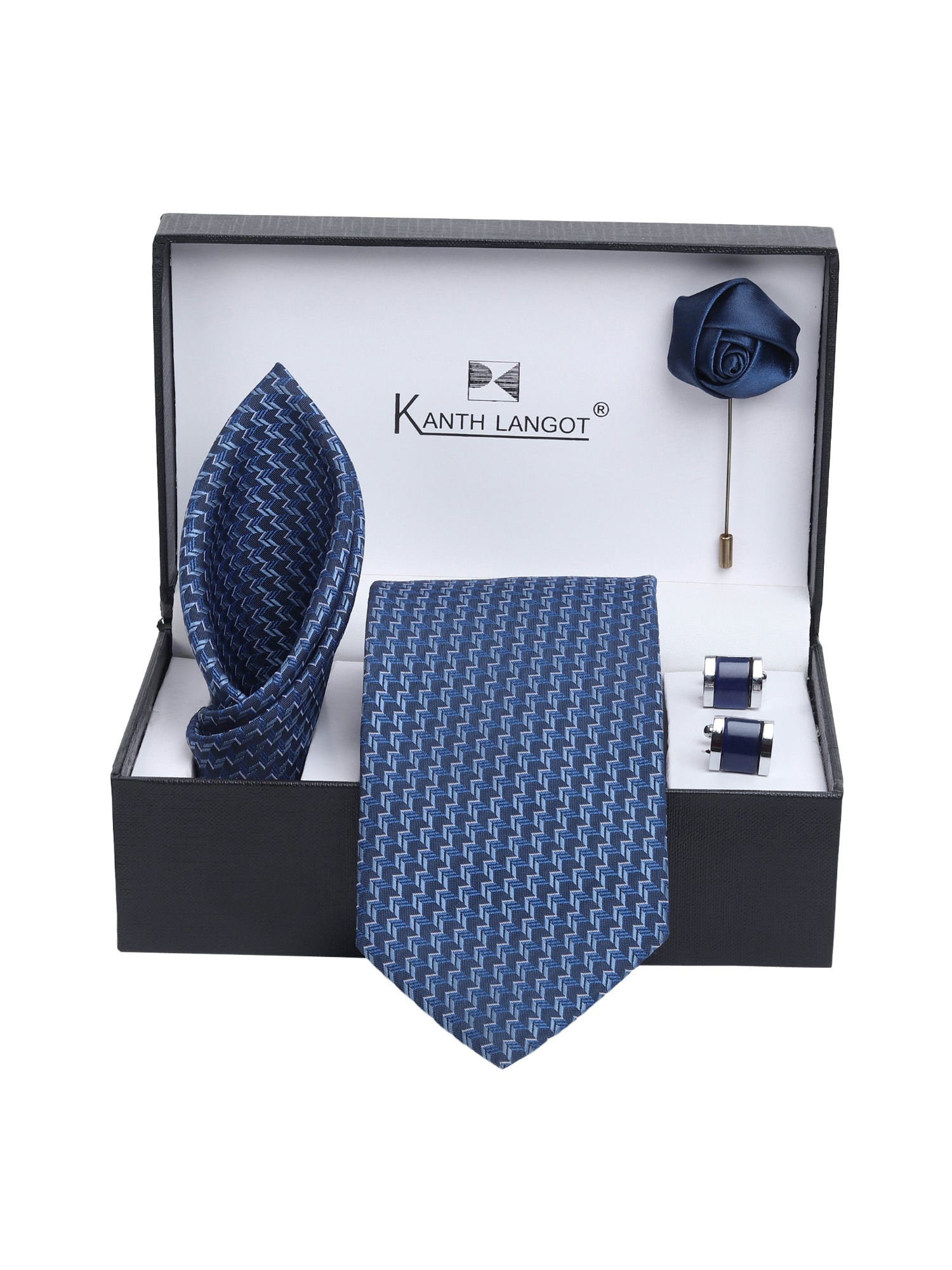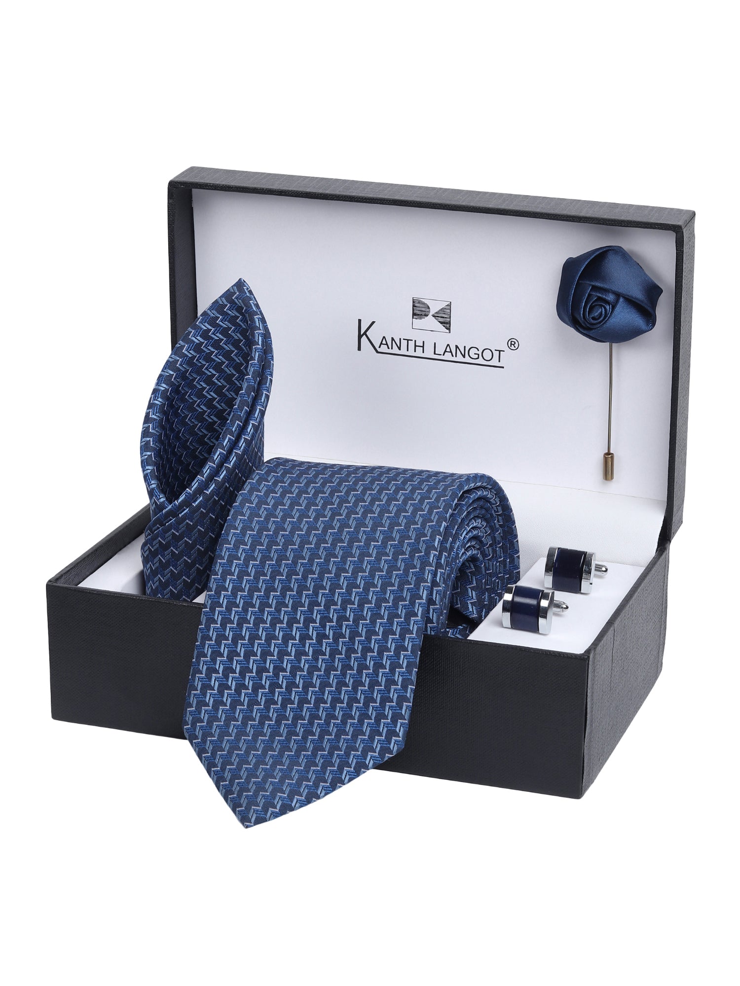 Kanthlangot Men’s Set of 4: Blue Zig-Zag Tie, Pocket Square, Cufflinks & Lapel Pin (Premium Gift Box)