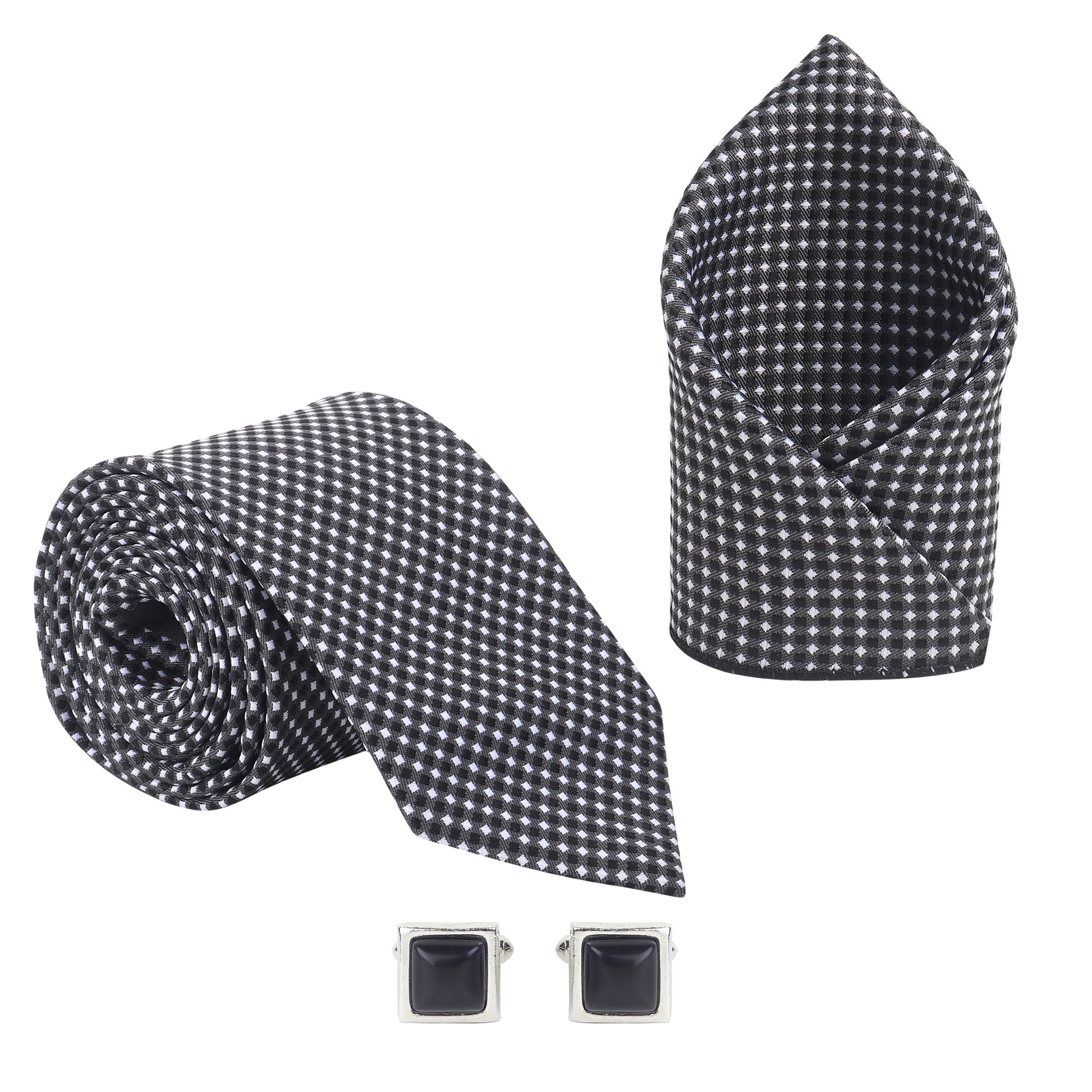 Kanthlangot Men’s 3-Piece Formal Set – Black Micro-Check Tie, Pocket Square & Premium Black Stone Cufflinks (3-Inch Necktie)
