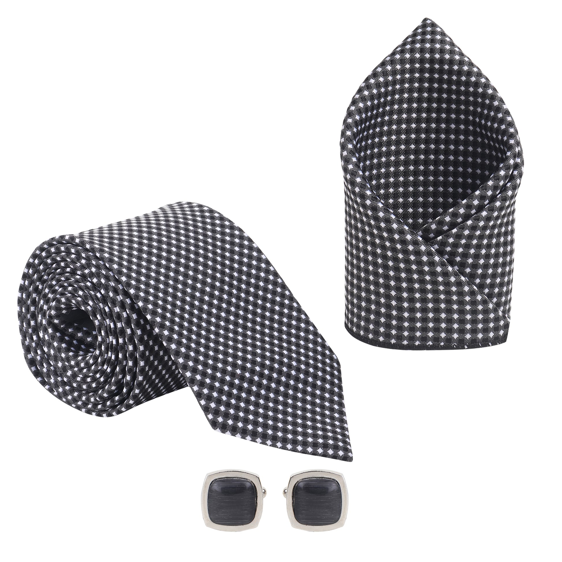 Kanthlangot Men’s 3-Piece Formal Set – Black Micro-Check Tie, Pocket Square & Rounded Stone Cufflinks (3-Inch Necktie)