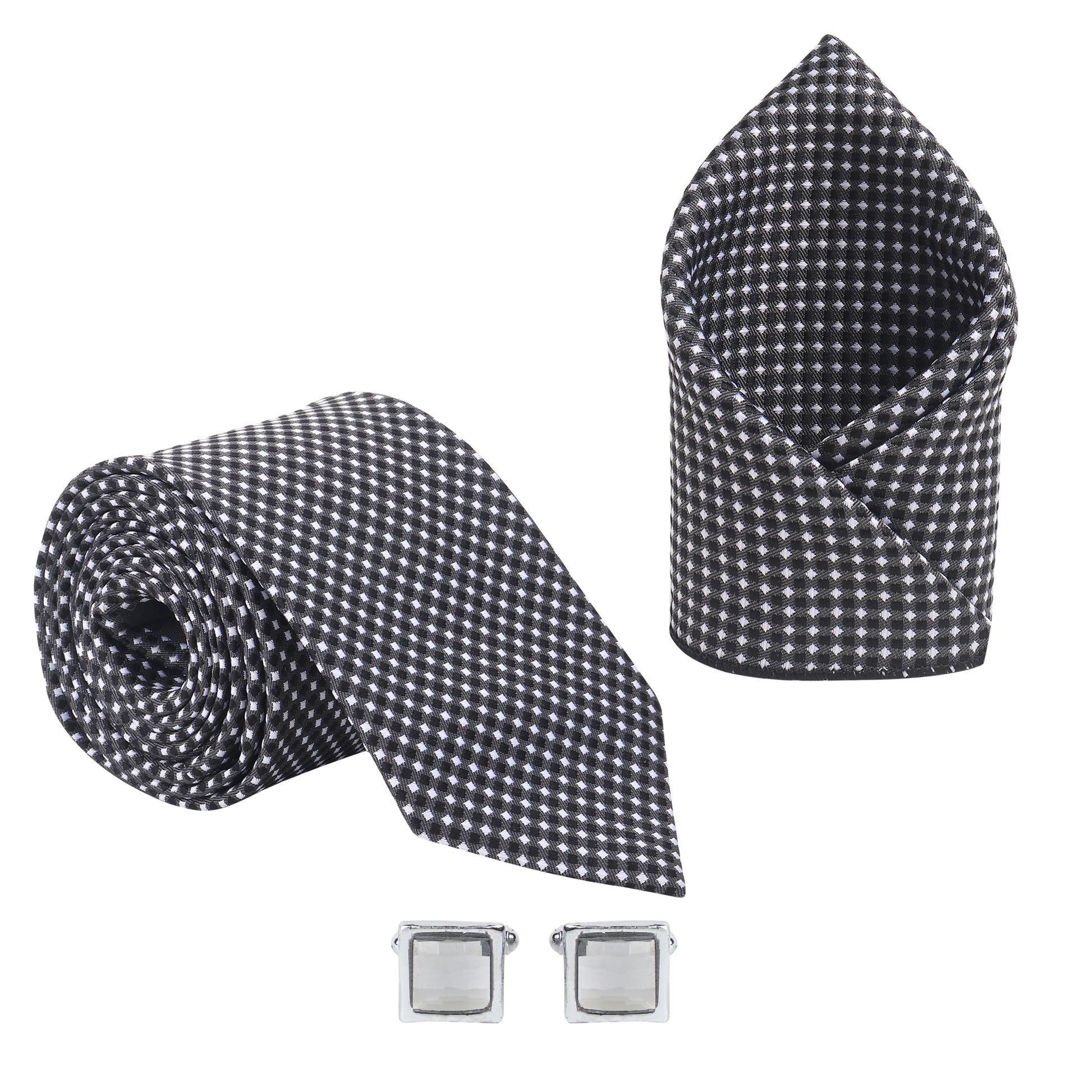 Kanthlangot Men’s 3-Piece Formal Set – Black Micro-Check Tie, Pocket Square & Silver Crystal Cufflinks (3-Inch Necktie)