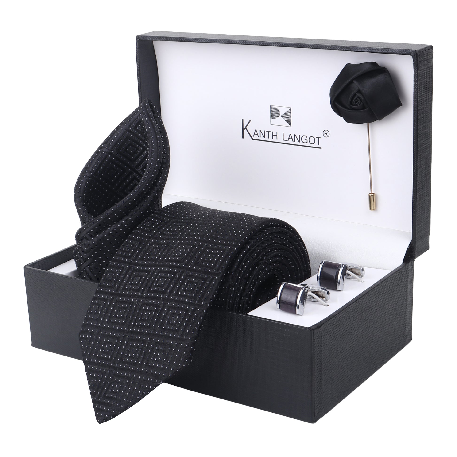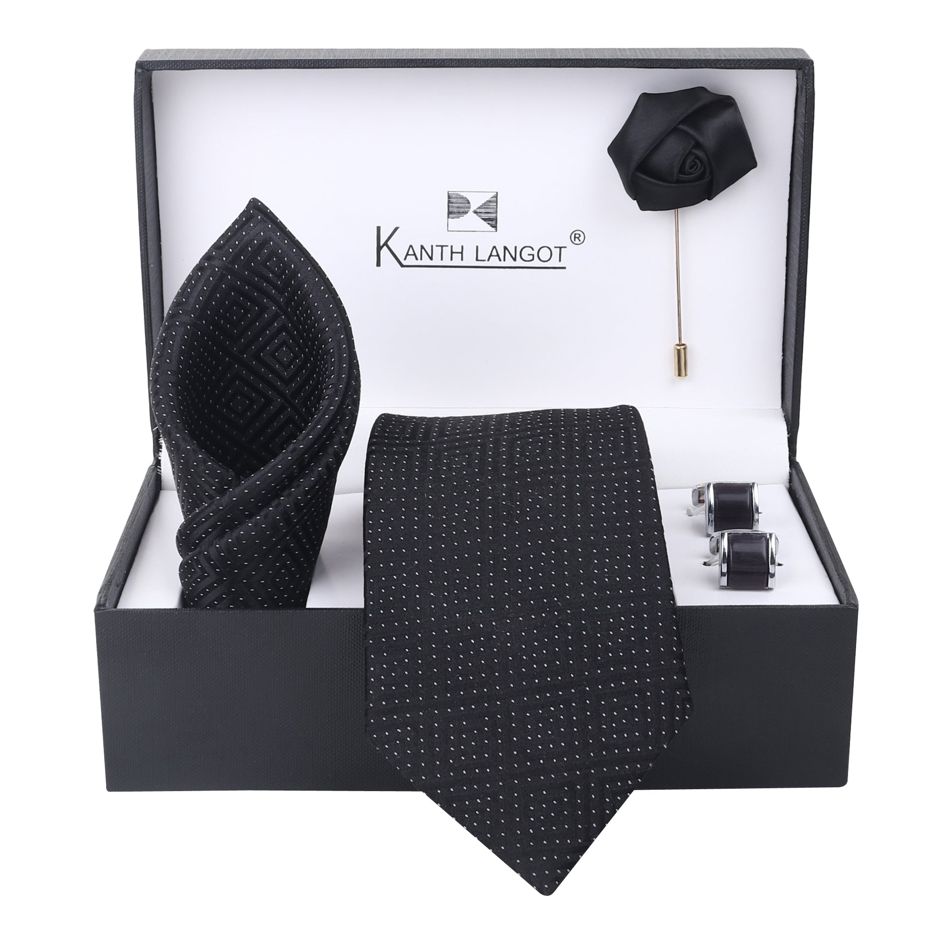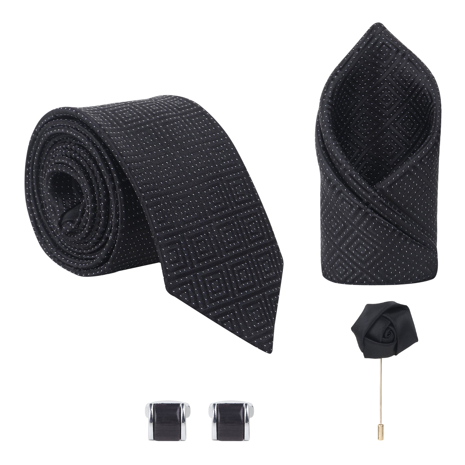 Kanthlangot Black Micro Dot Tie Set with Pocket Square, Cufflinks & Lapel Pin – Set of 4