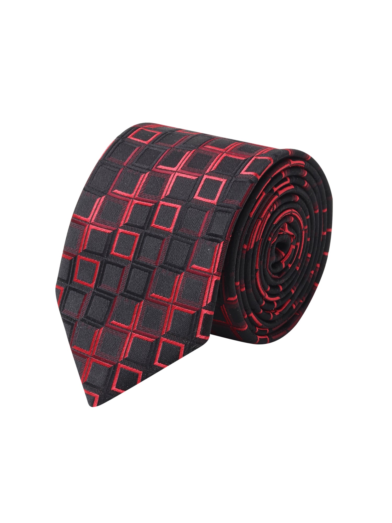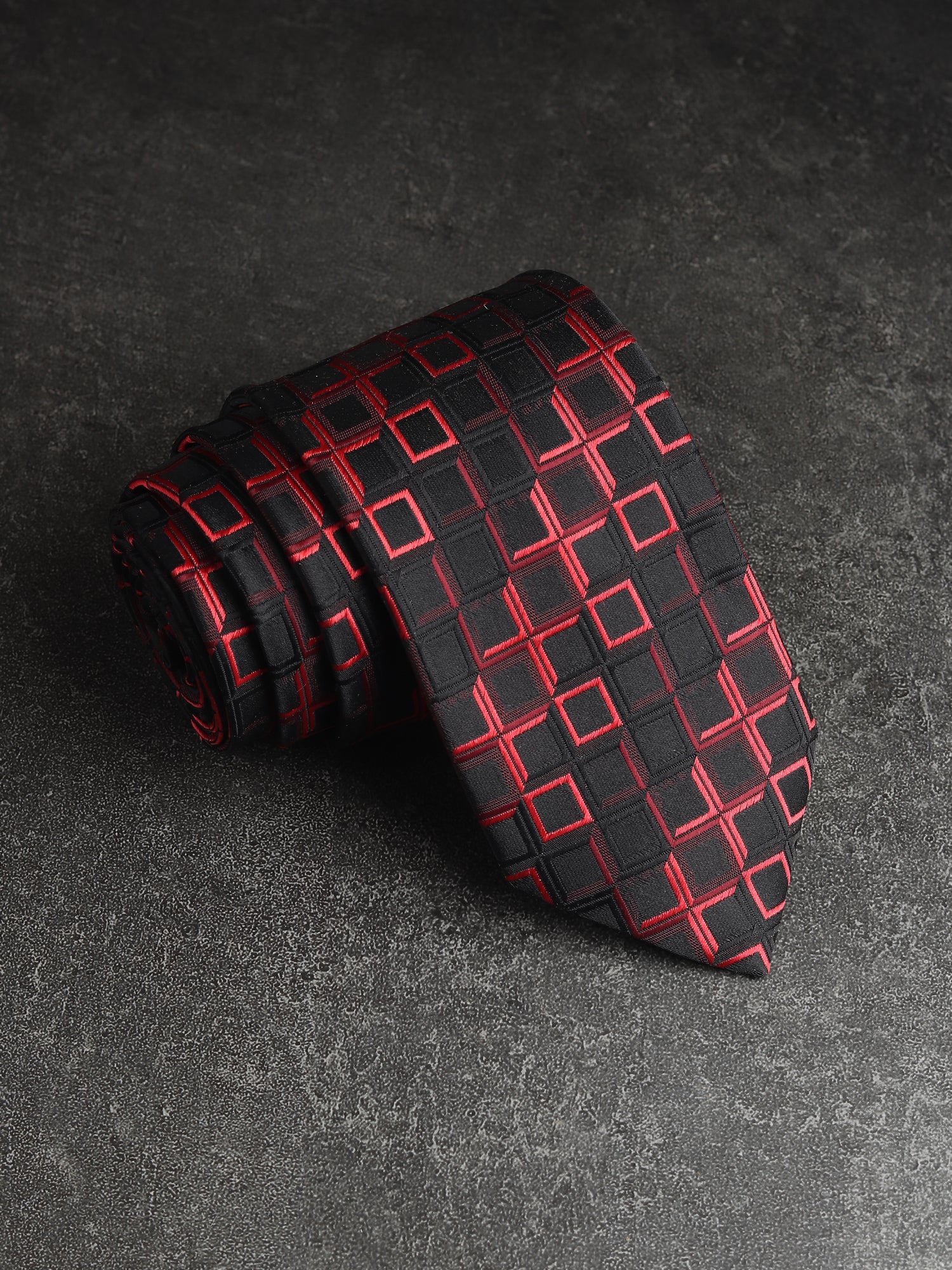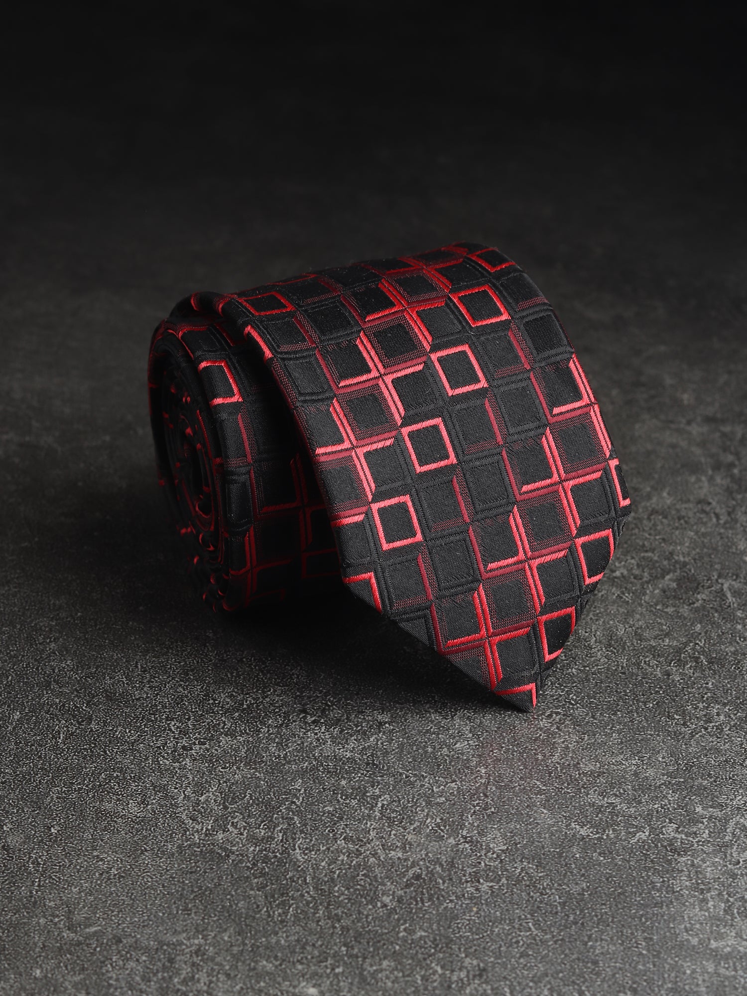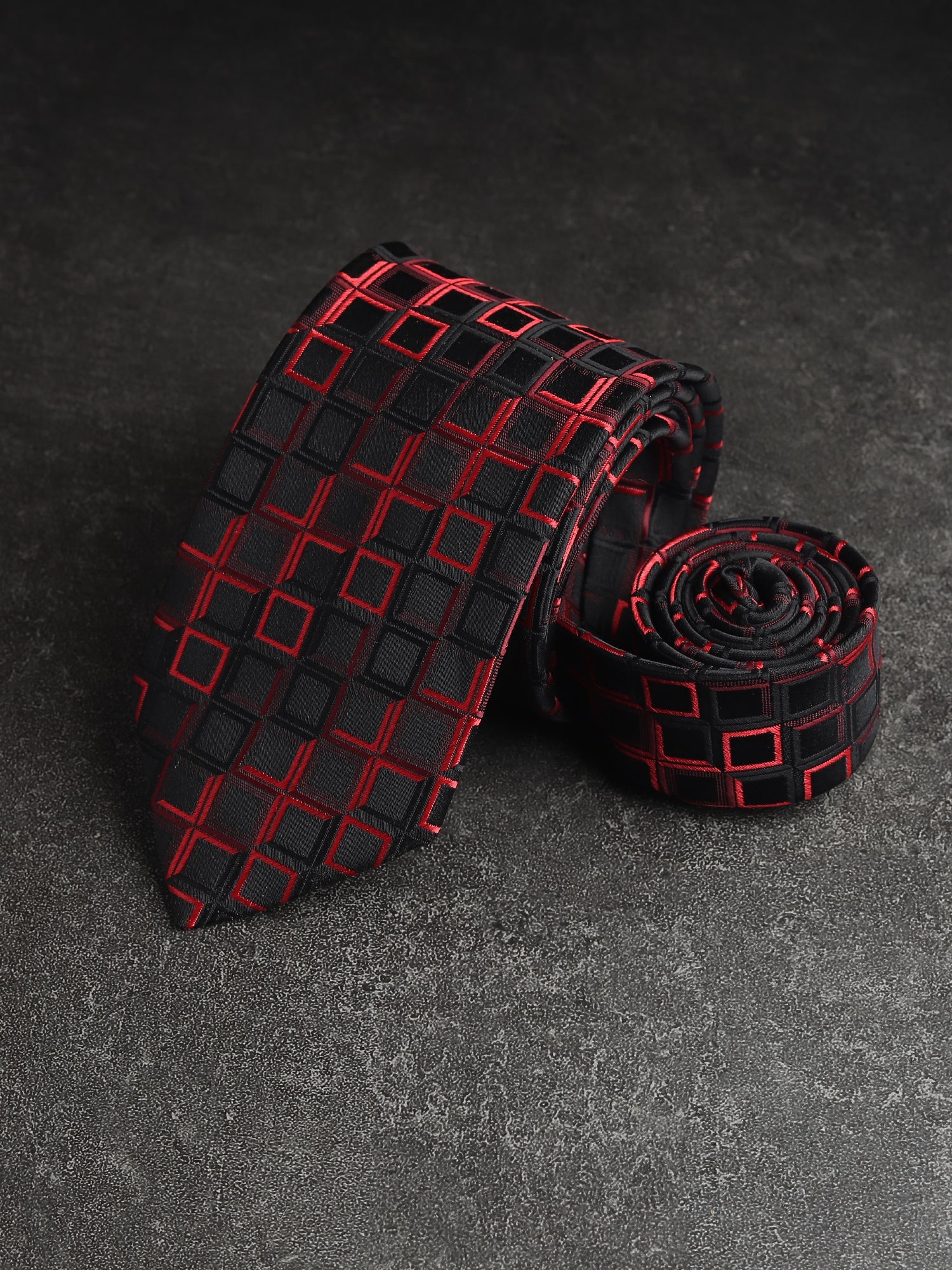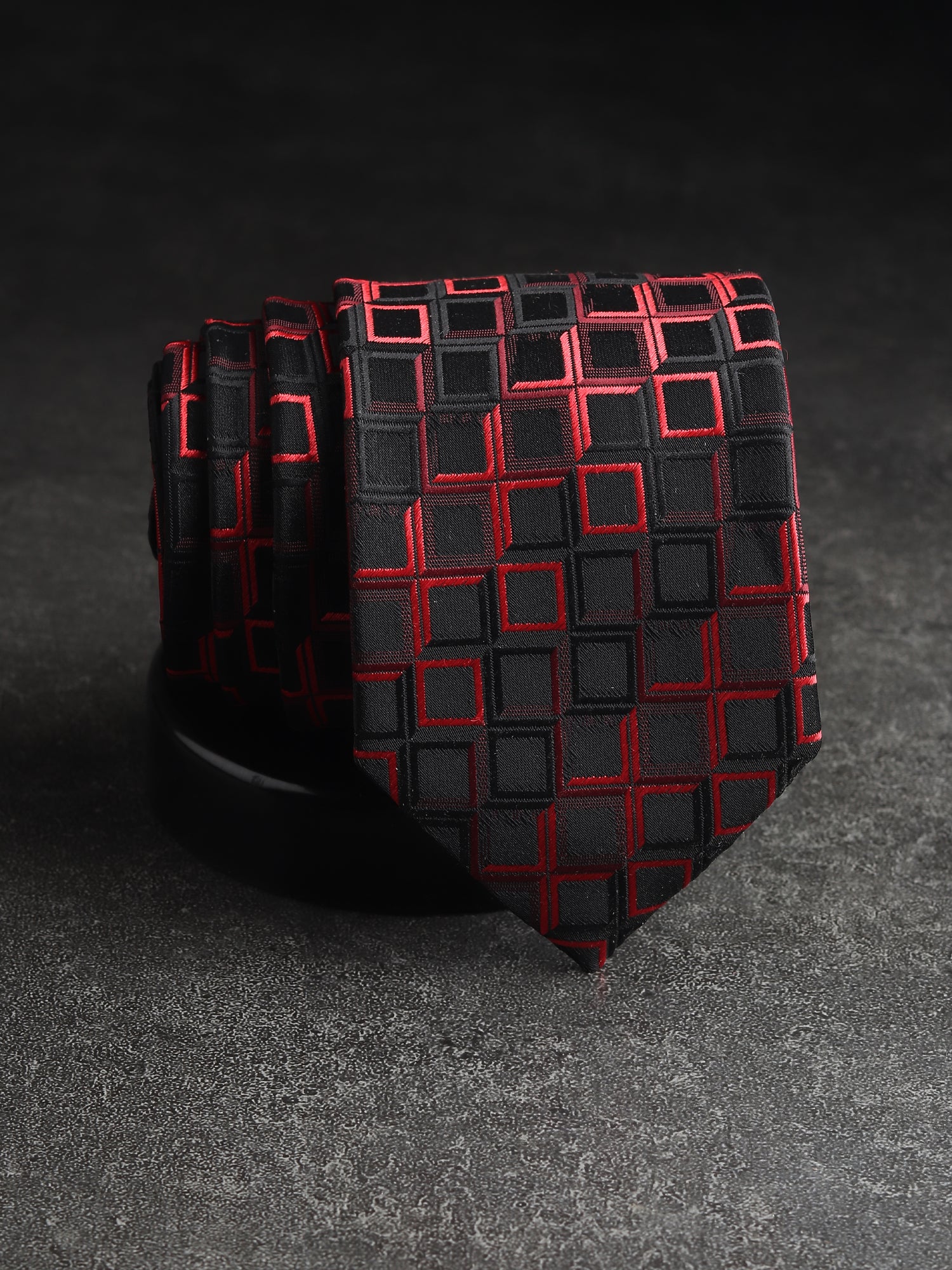 Kanthlangot Modern Woven Necktie – Black & Red Square Pattern