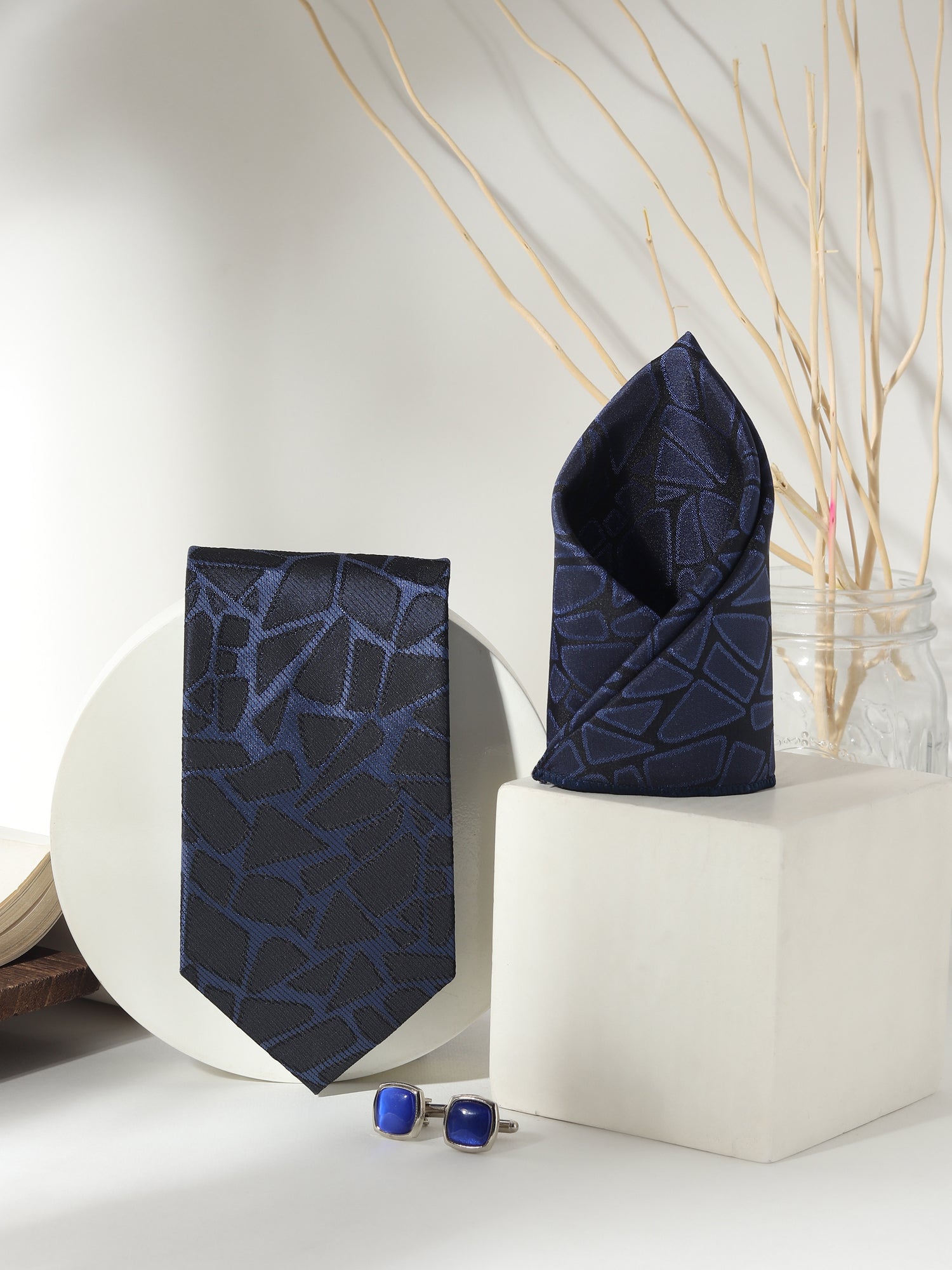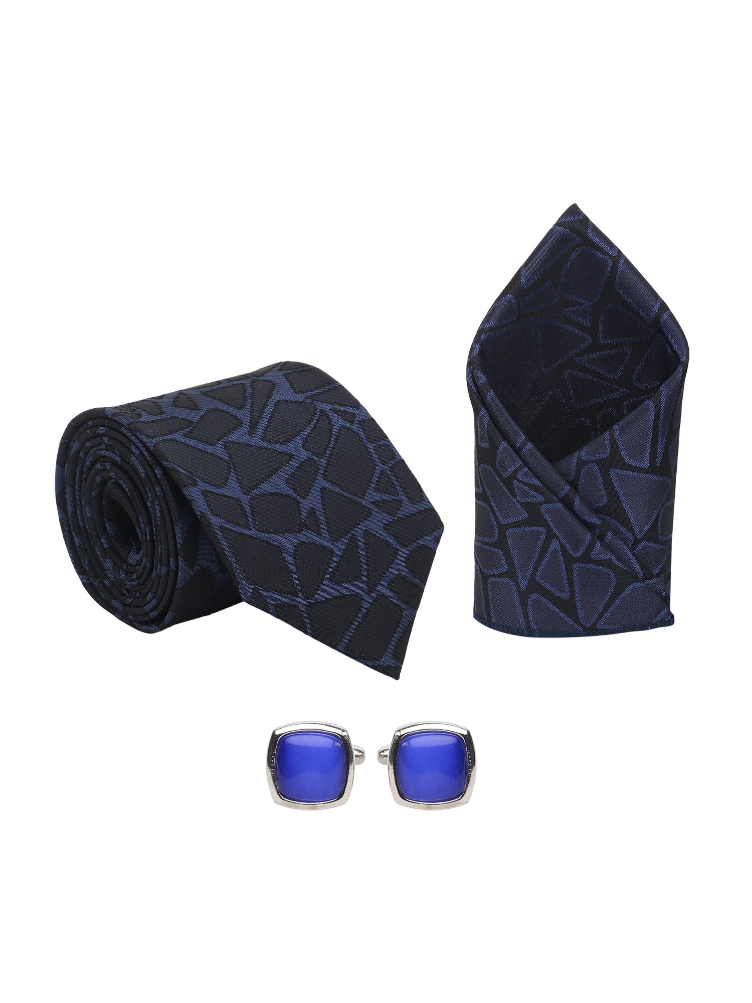 Kanthlangot Men’s 3-Piece Formal Set – Navy Abstract Tie, Pocket Square & Cobalt Blue Cufflinks (3-Inch Necktie)