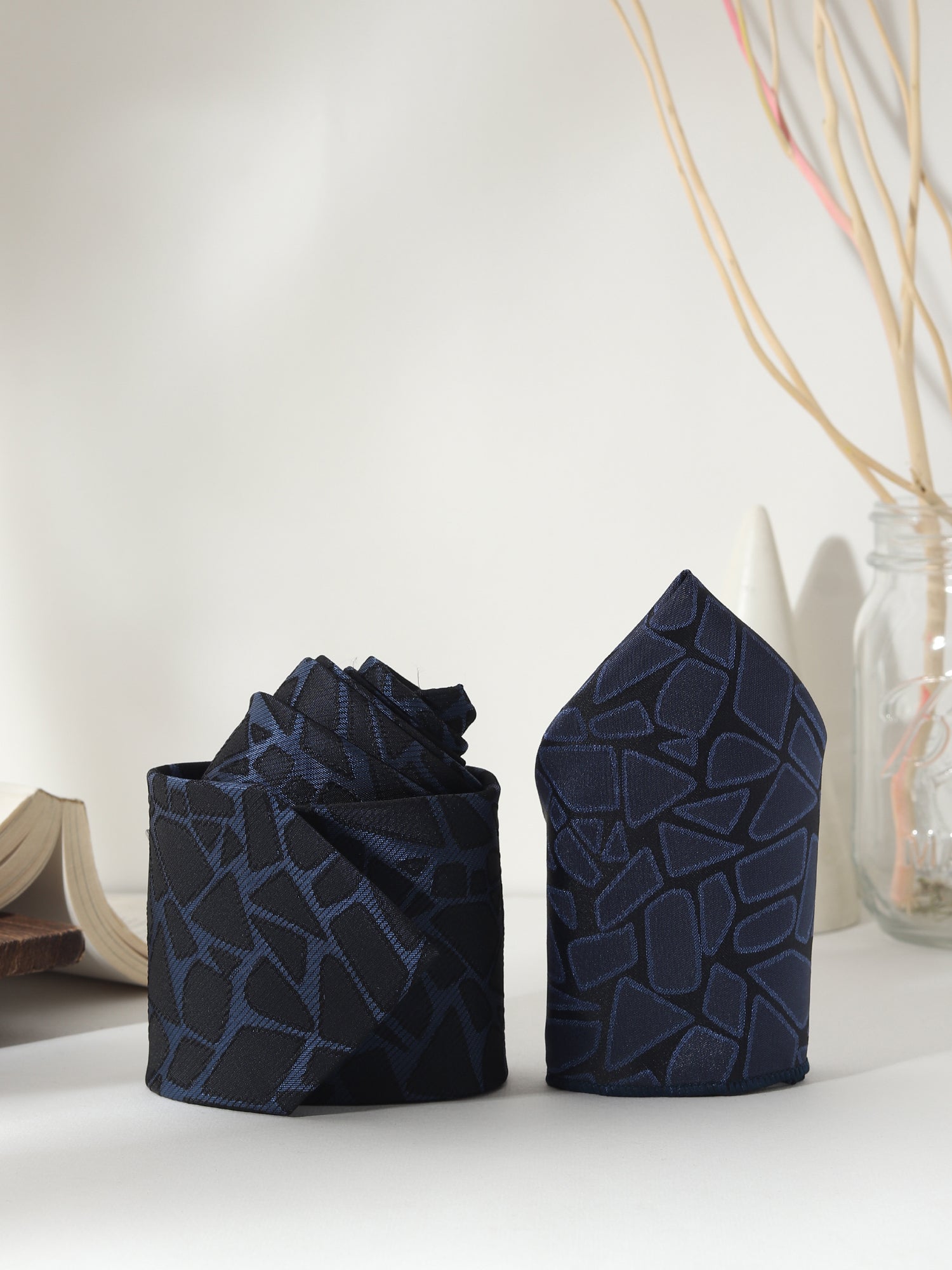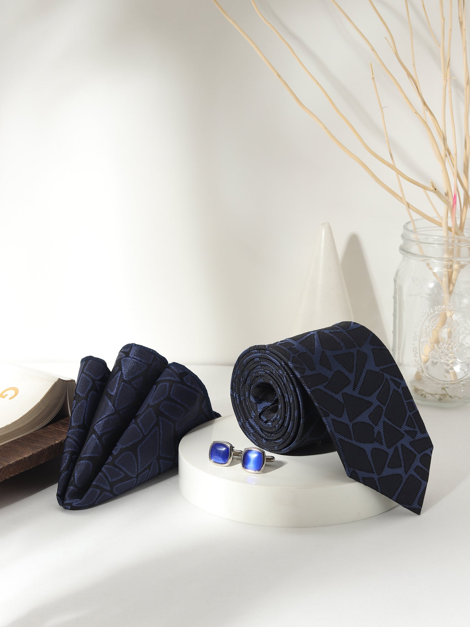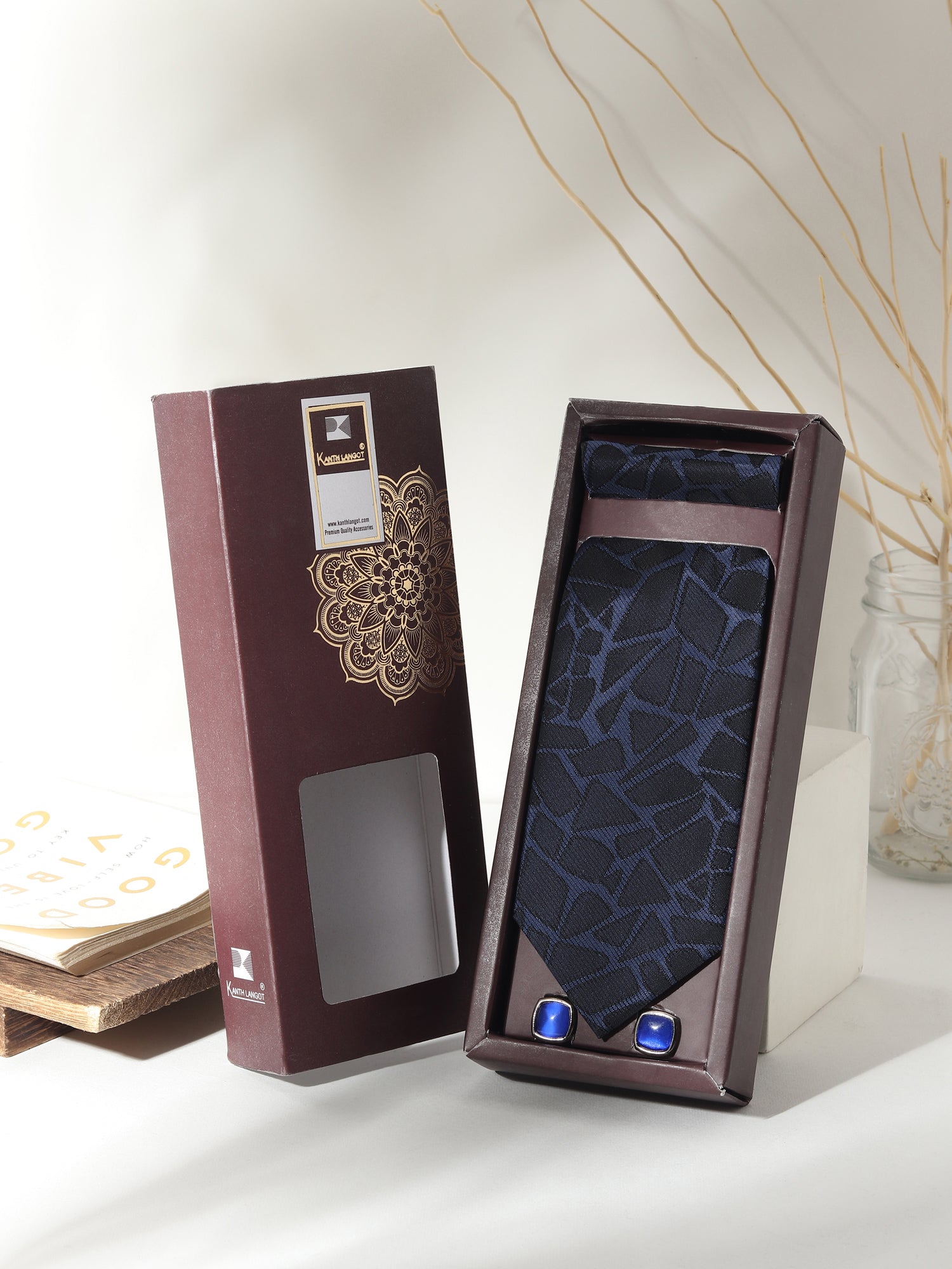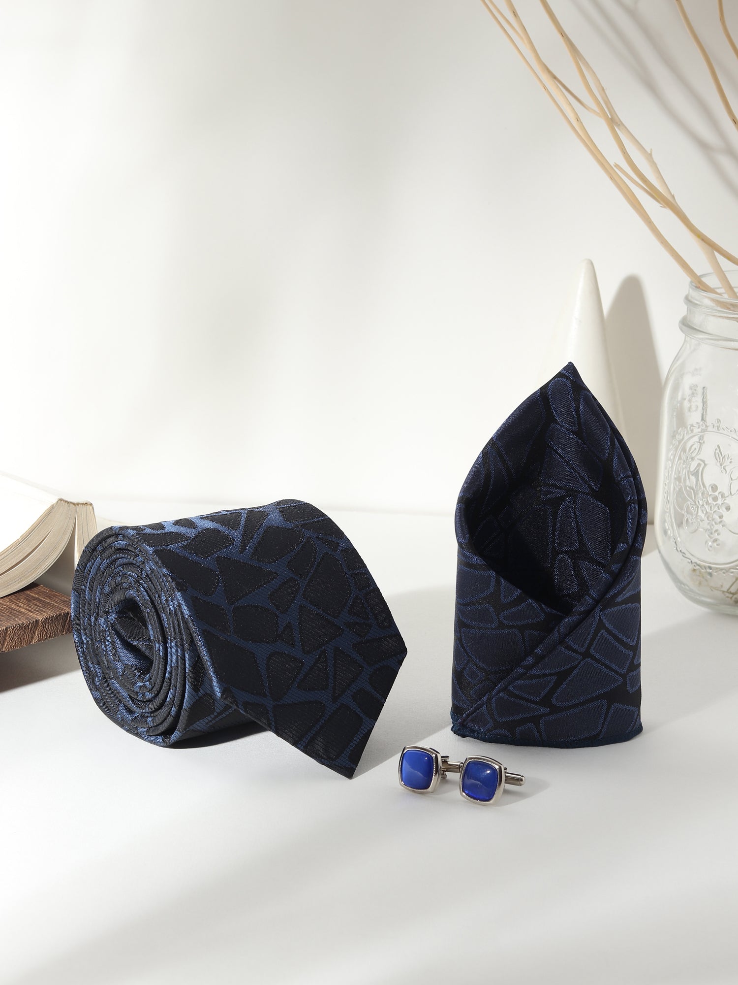Designed for distinction, this Kanthlangot Men’s Formal Set includes a navy tie with a black abstract mosaic pattern, a matching pocket square, and silver cufflinks featuring bold cobalt blue enamel inlay. The combination offers vibrant sophistication—perfect for Indian weddings, cocktail parties, or premium gifting.