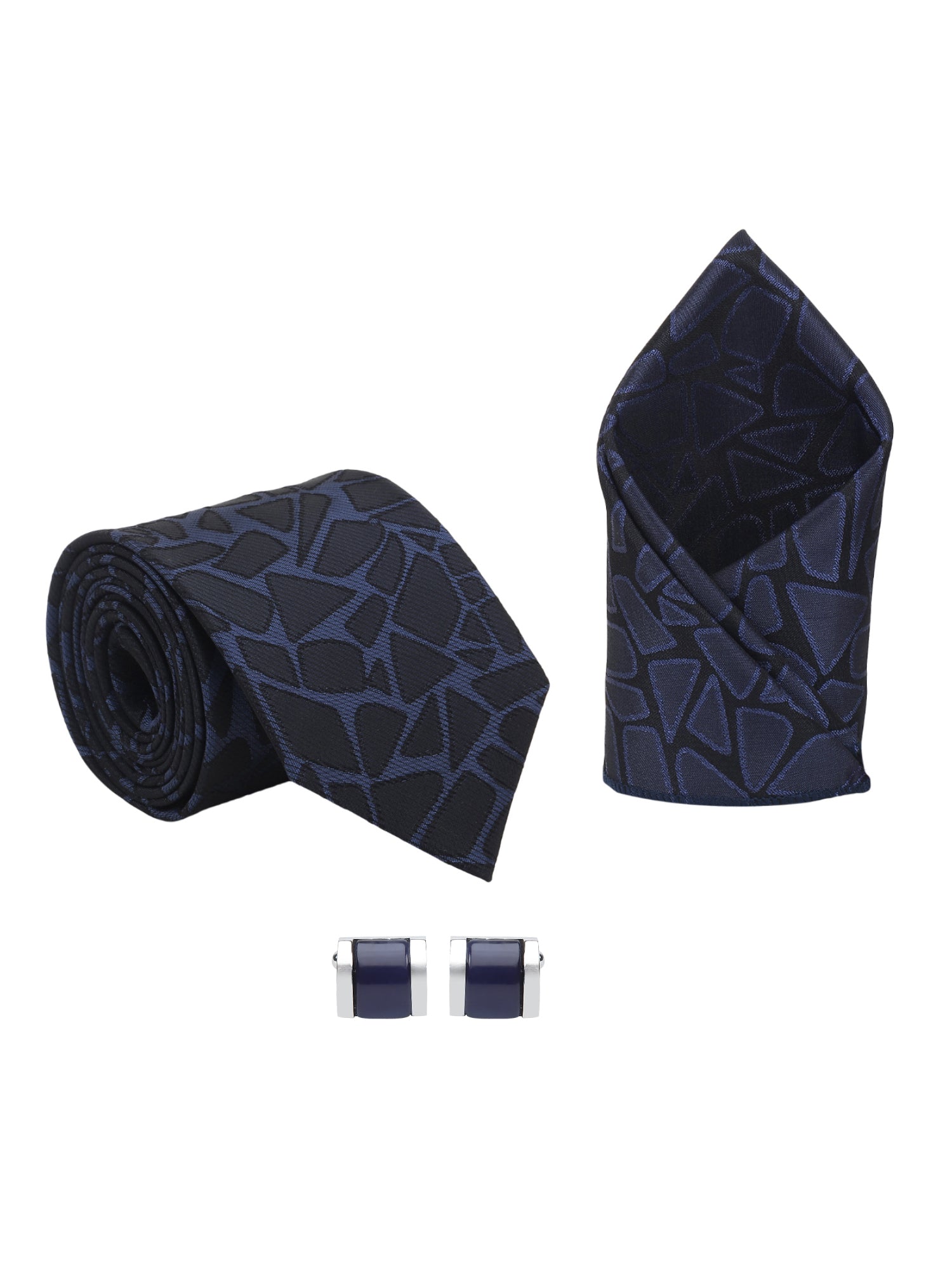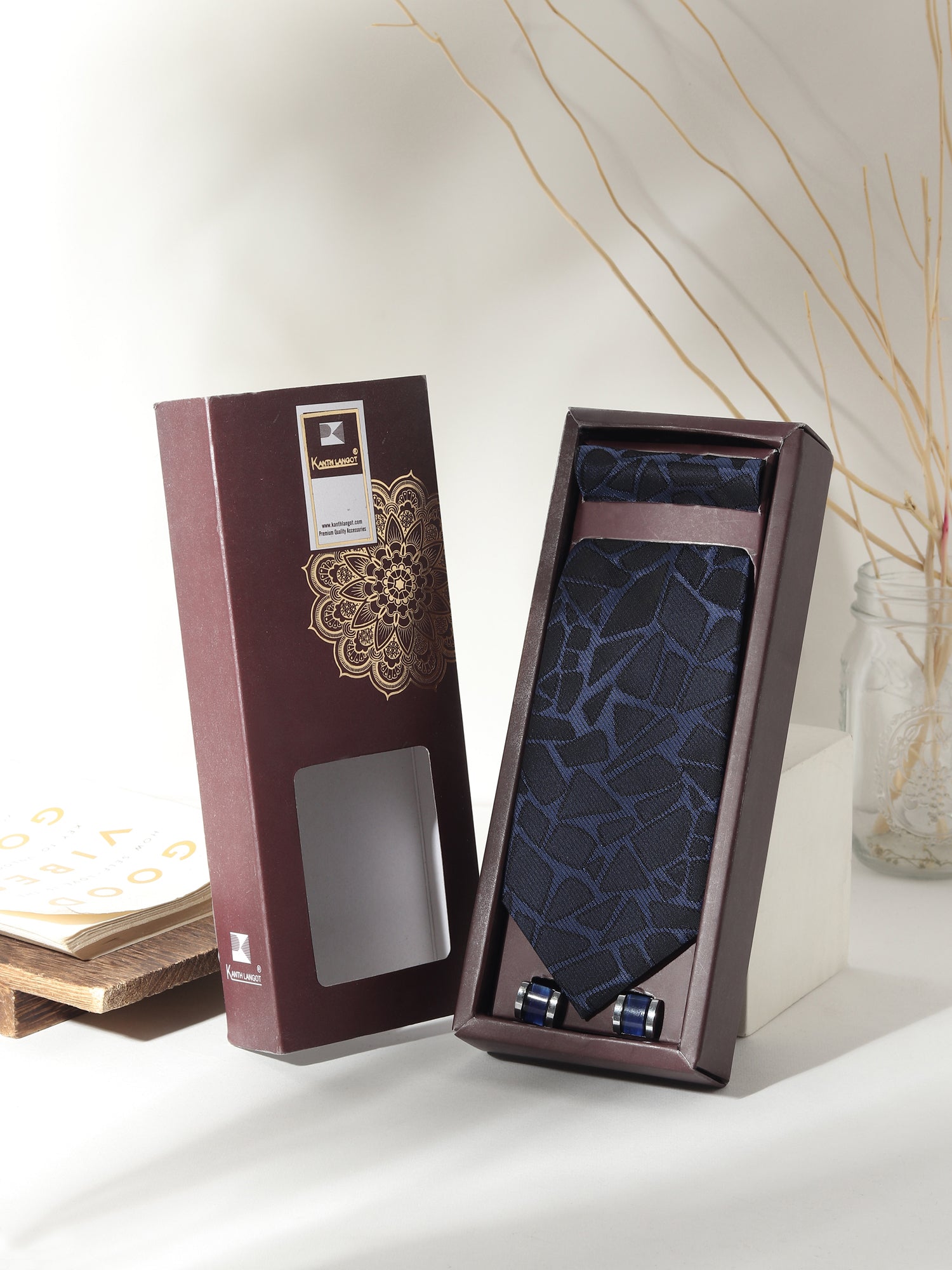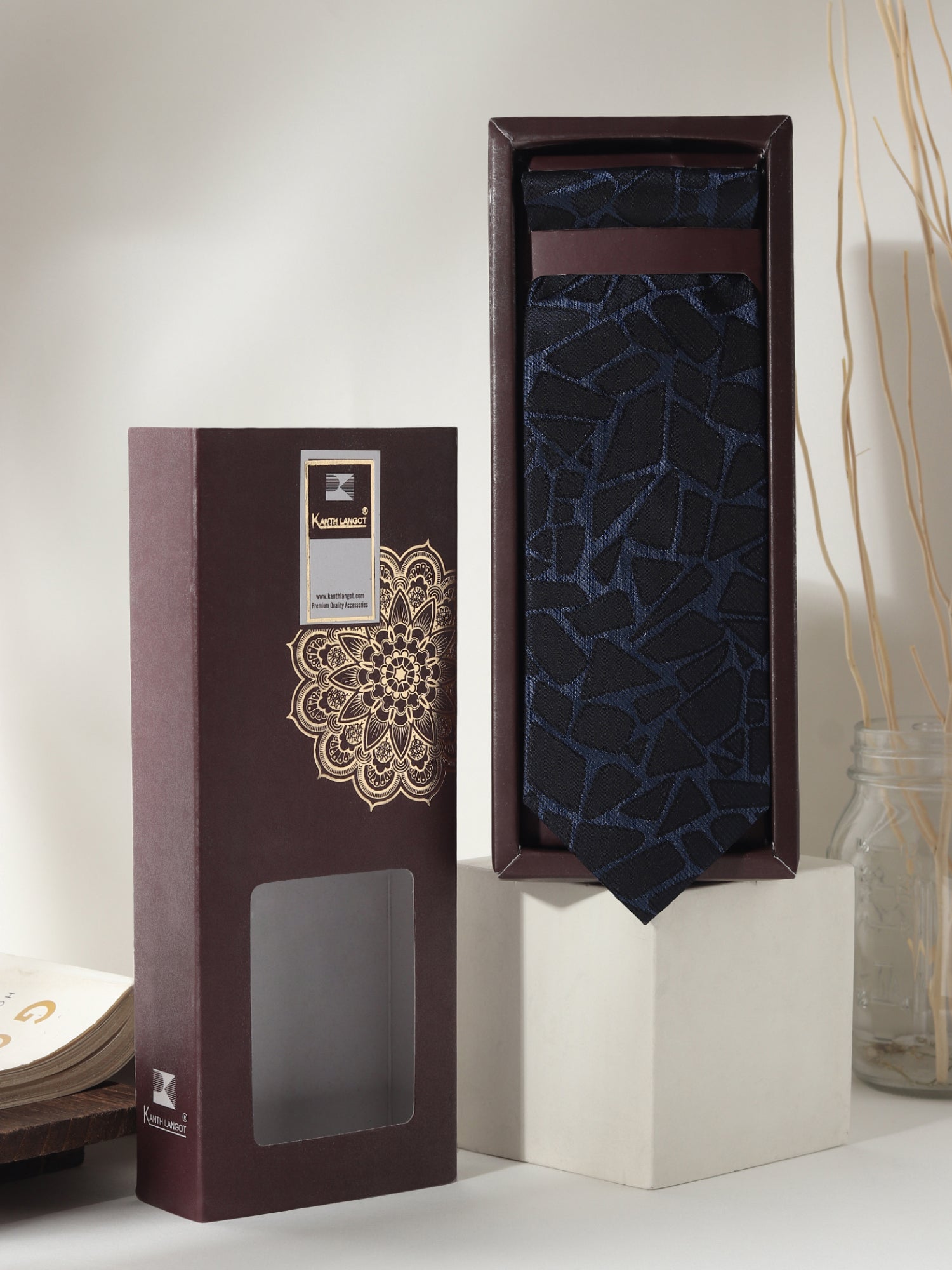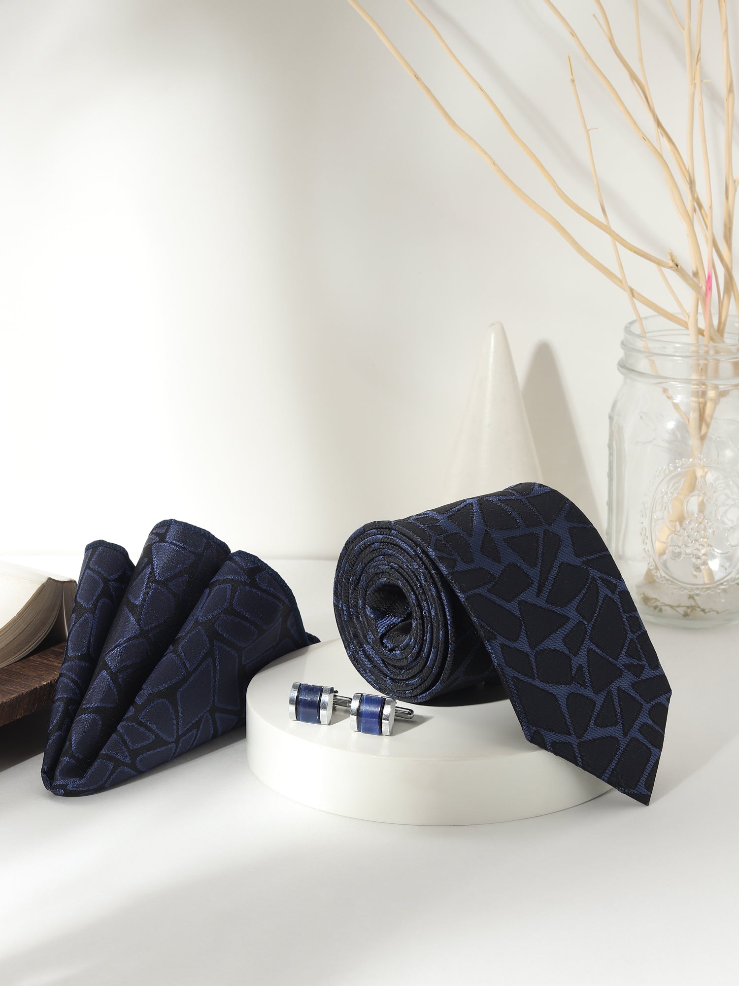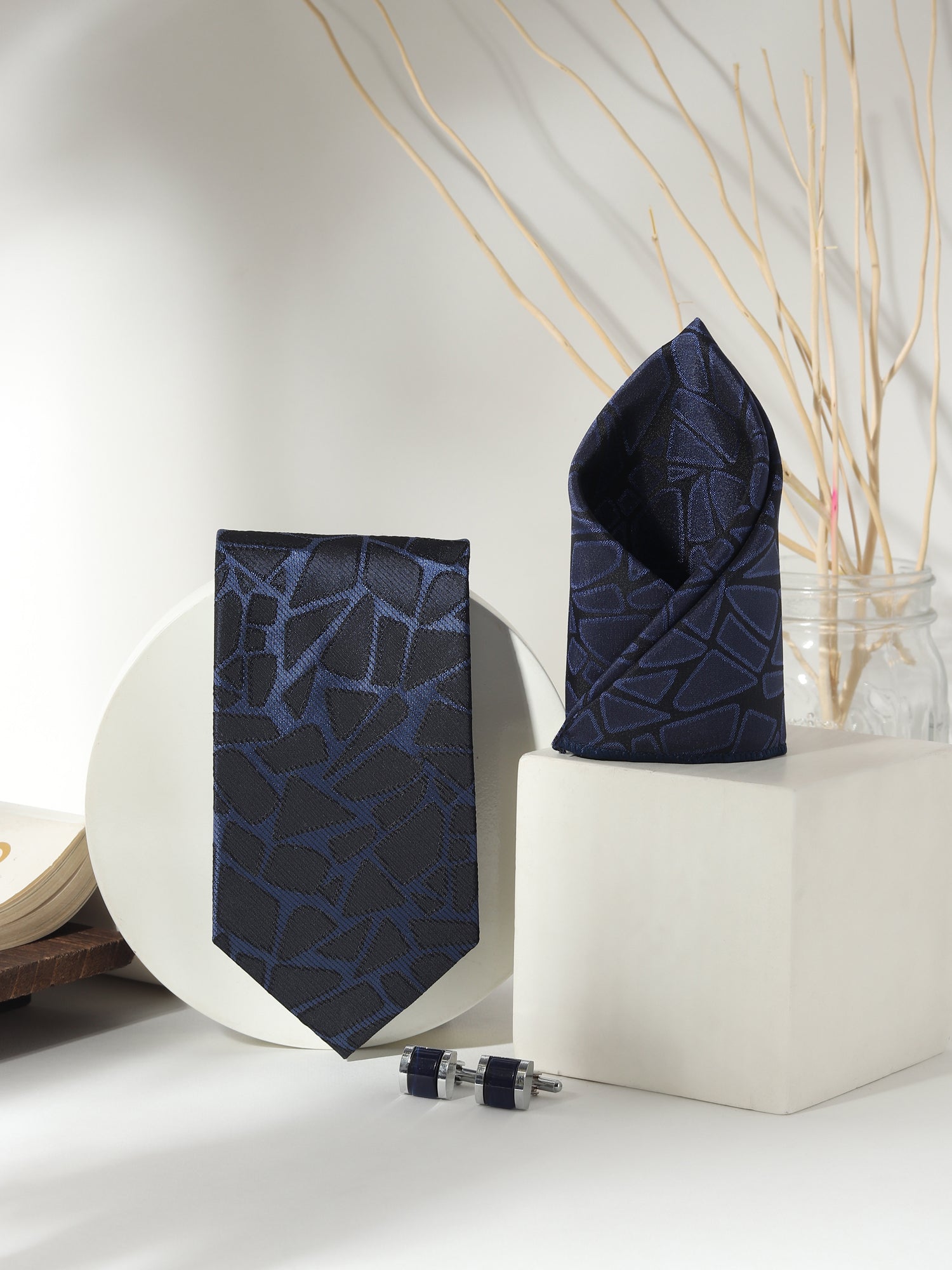 Kanthlangot Men’s 3-Piece Formal Set – Navy Abstract Pattern Tie, Pocket Square & Deep Navy Enamel Cufflinks (3-Inch Necktie)