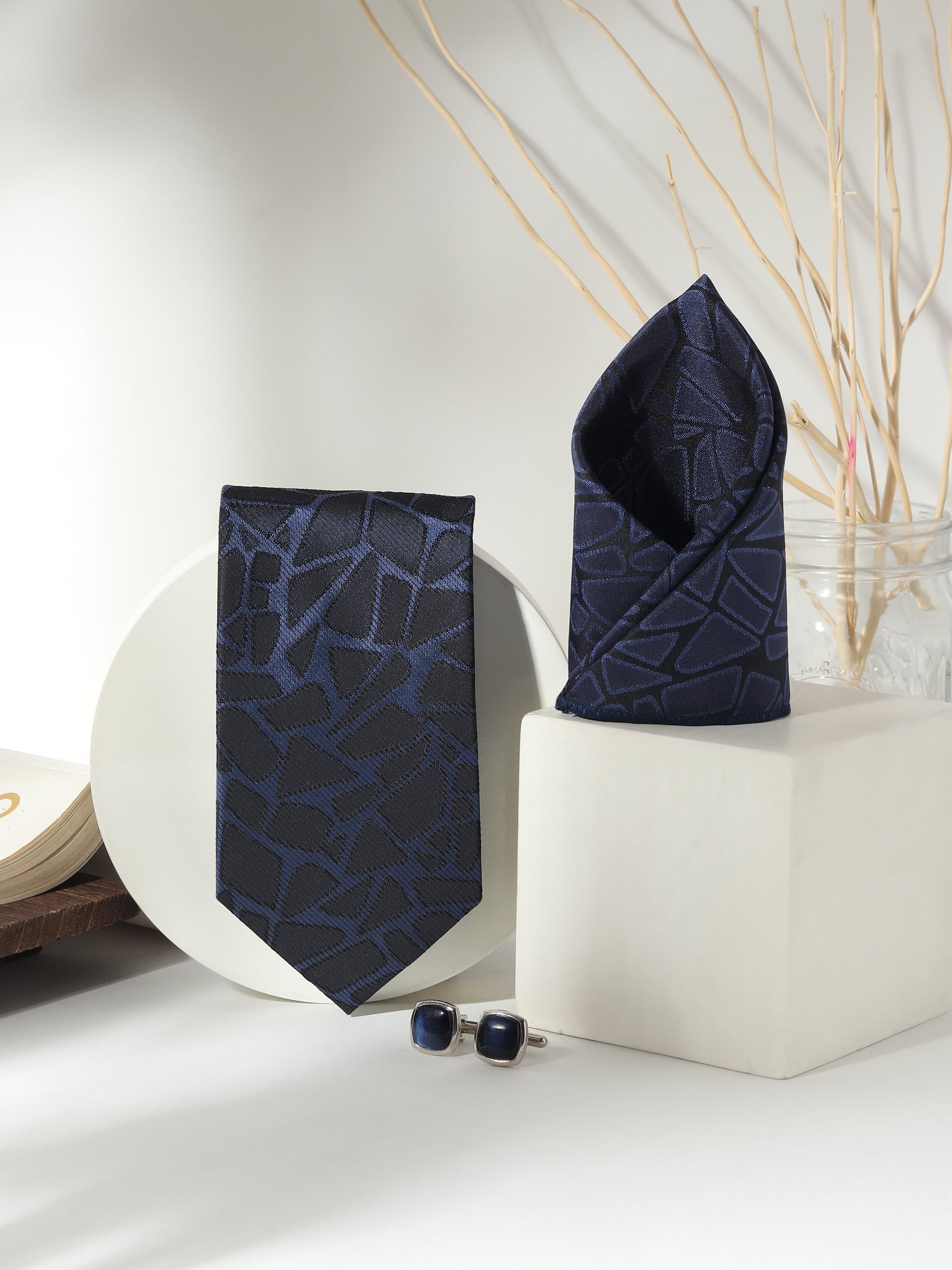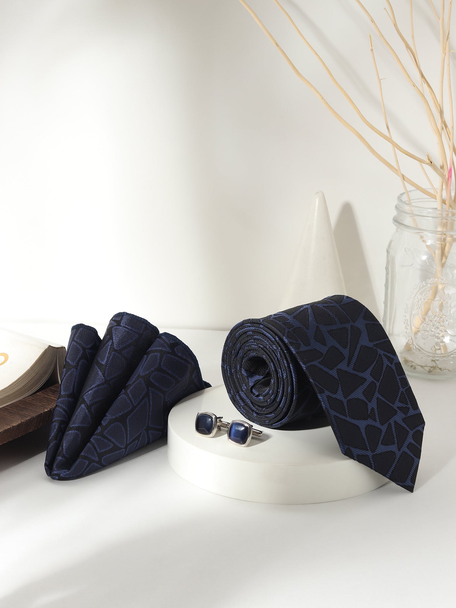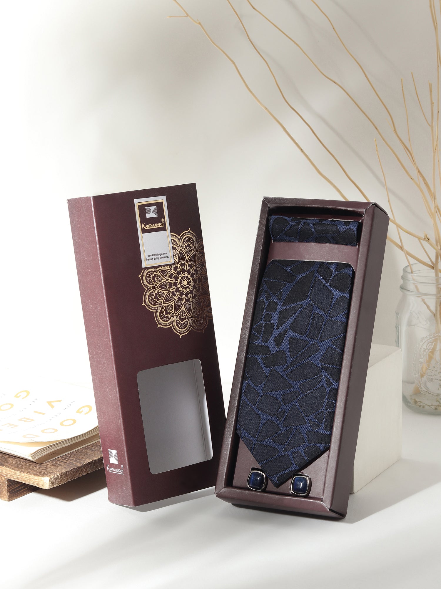 Kanthlangot Men’s 3-Piece Formal Set – Navy Abstract Tie, Pocket Square & Deep Navy Enamel Cufflinks (3-Inch Necktie)