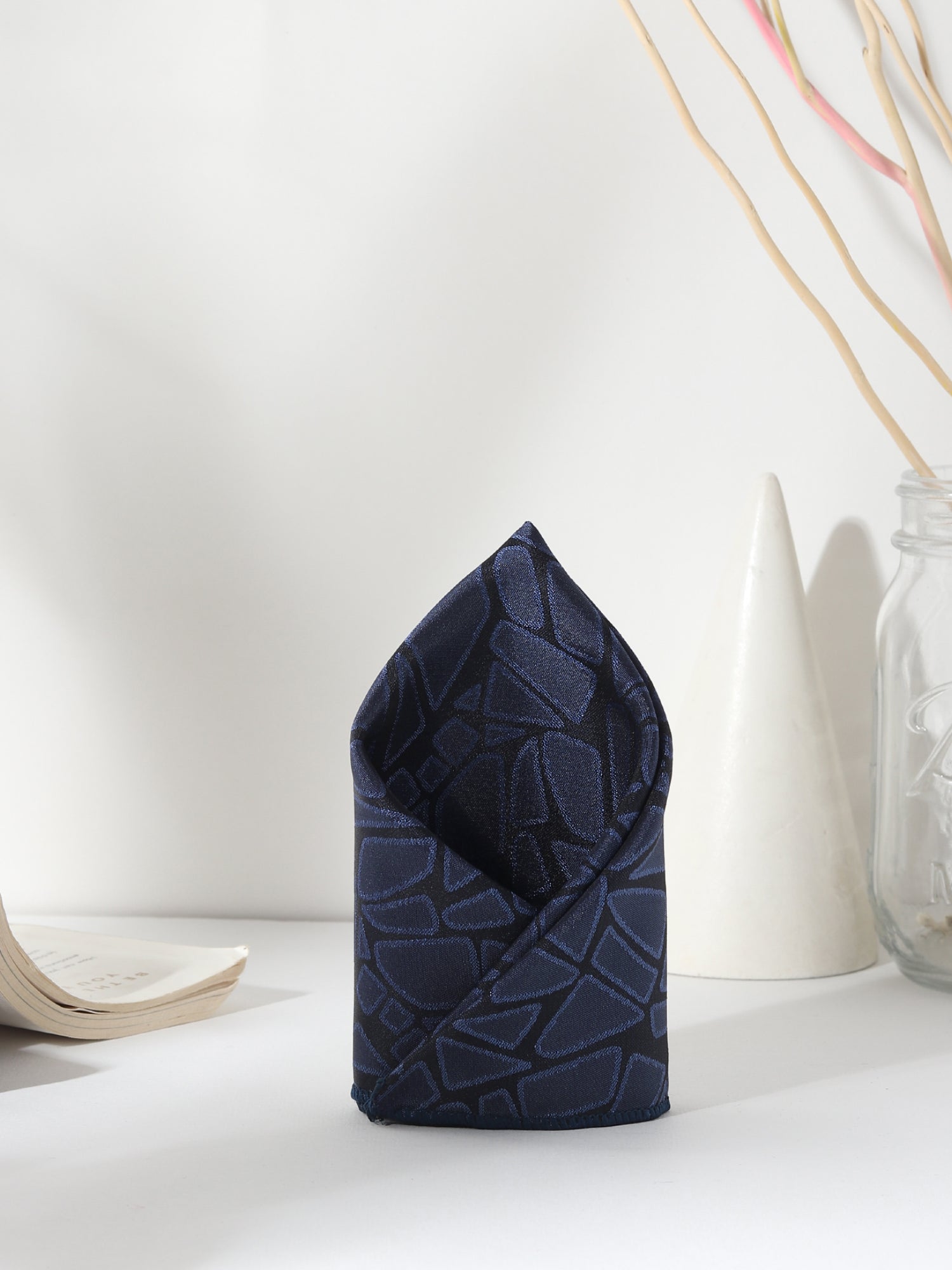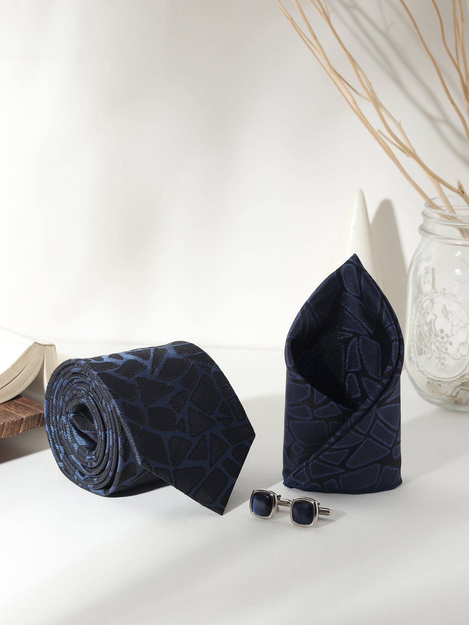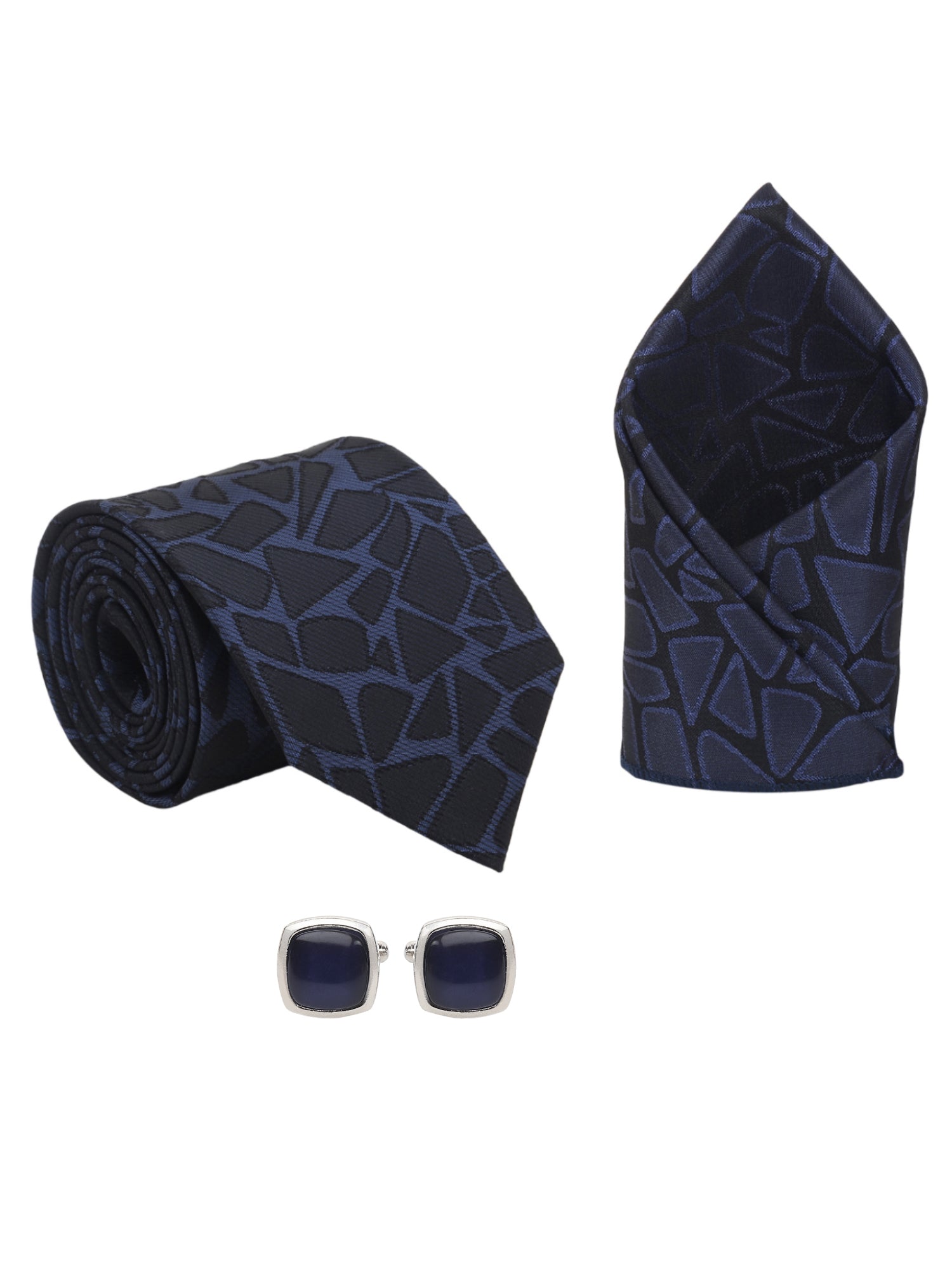 Kanthlangot Men’s 3-Piece Formal Set – Navy Abstract Tie, Pocket Square & Deep Navy Enamel Cufflinks (3-Inch Necktie)