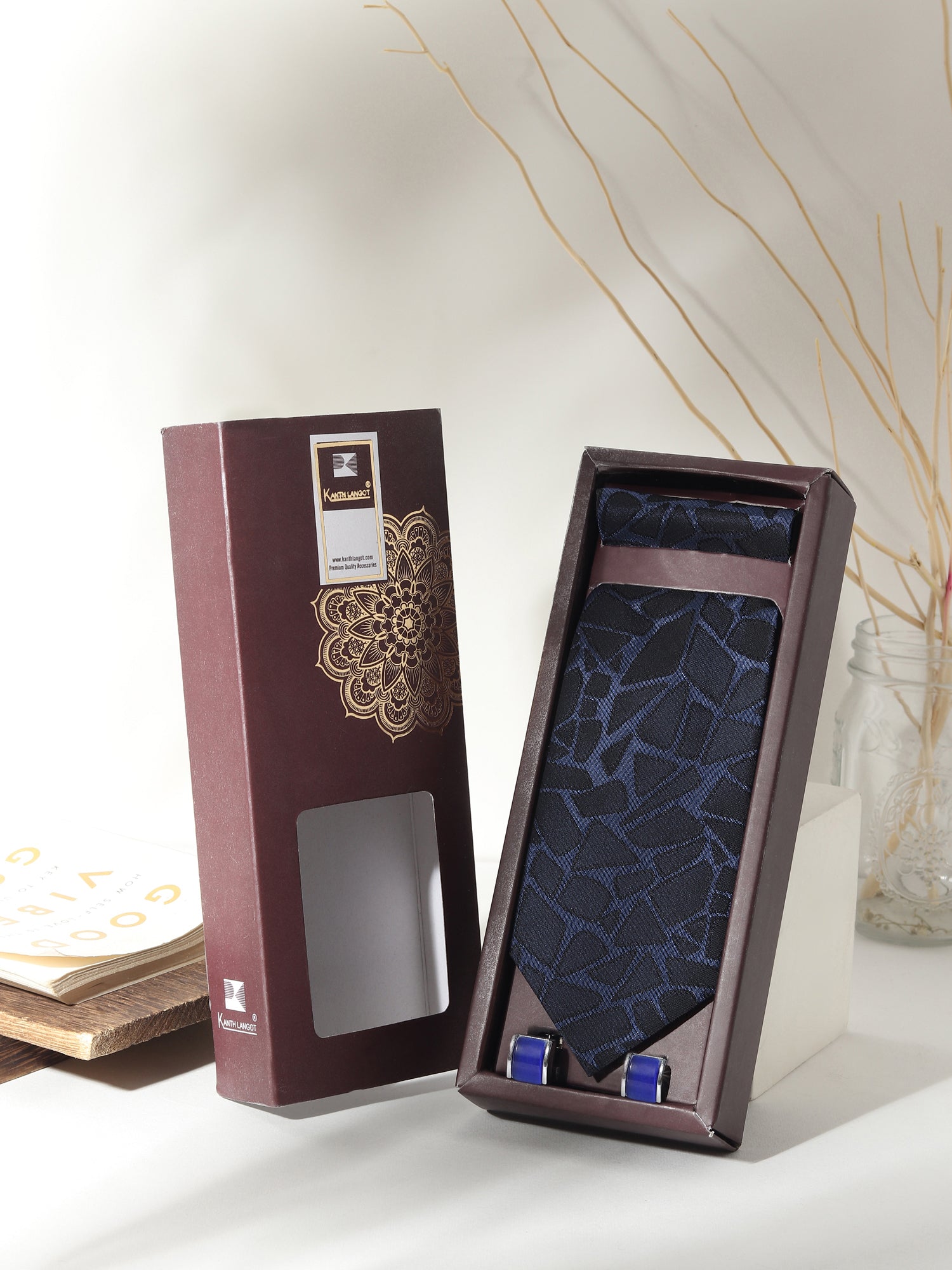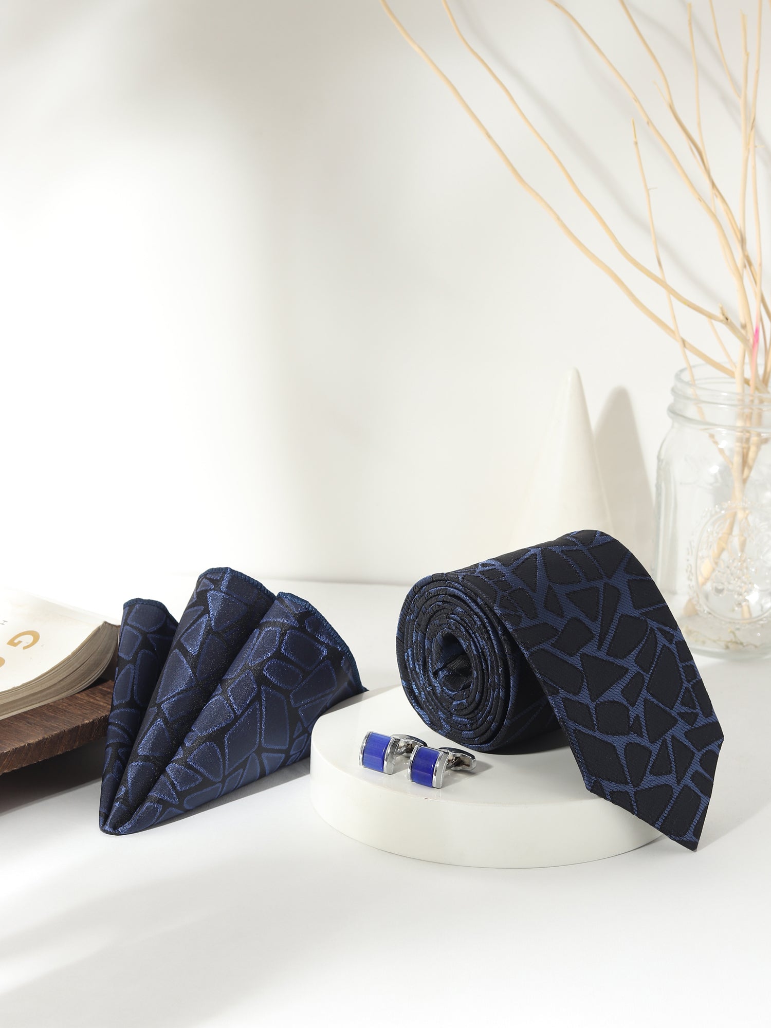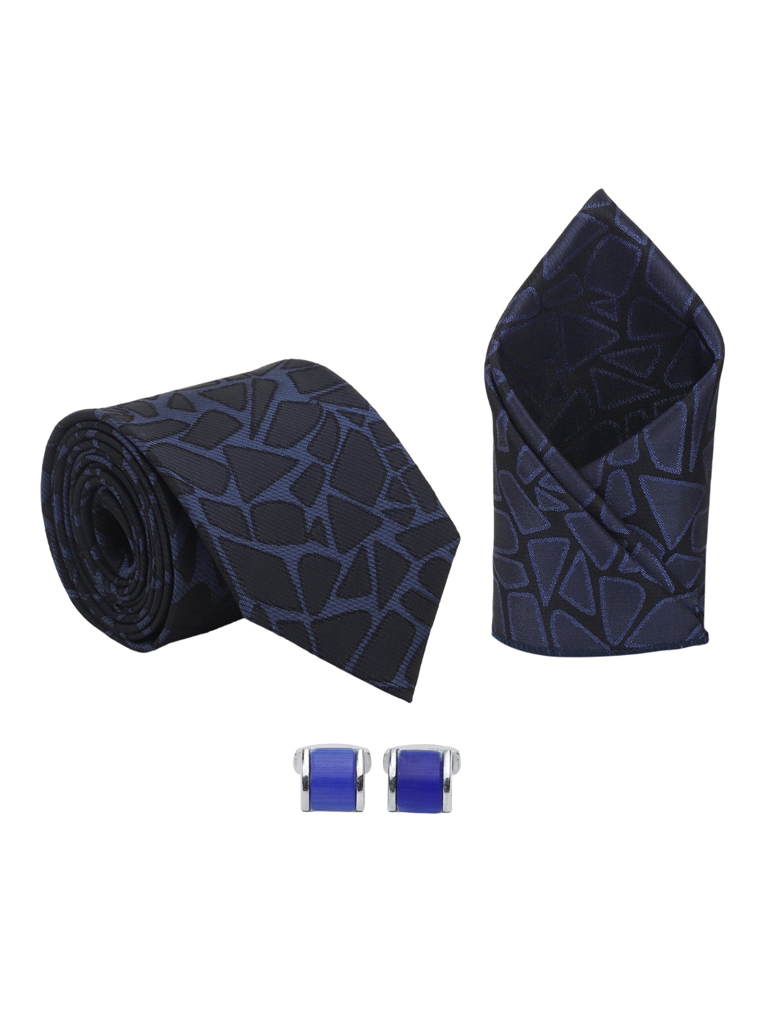 Unleash bold sophistication with this Kanthlangot Men’s Formal Set, featuring a navy tie overlaid with dynamic black abstract patterning, a matching pocket square, and statement silver cufflinks inlaid with royal blue enamel. Designed to stand out in refined company, this set fuses deep color with geometric intrigue for men who prefer confident formalwear.