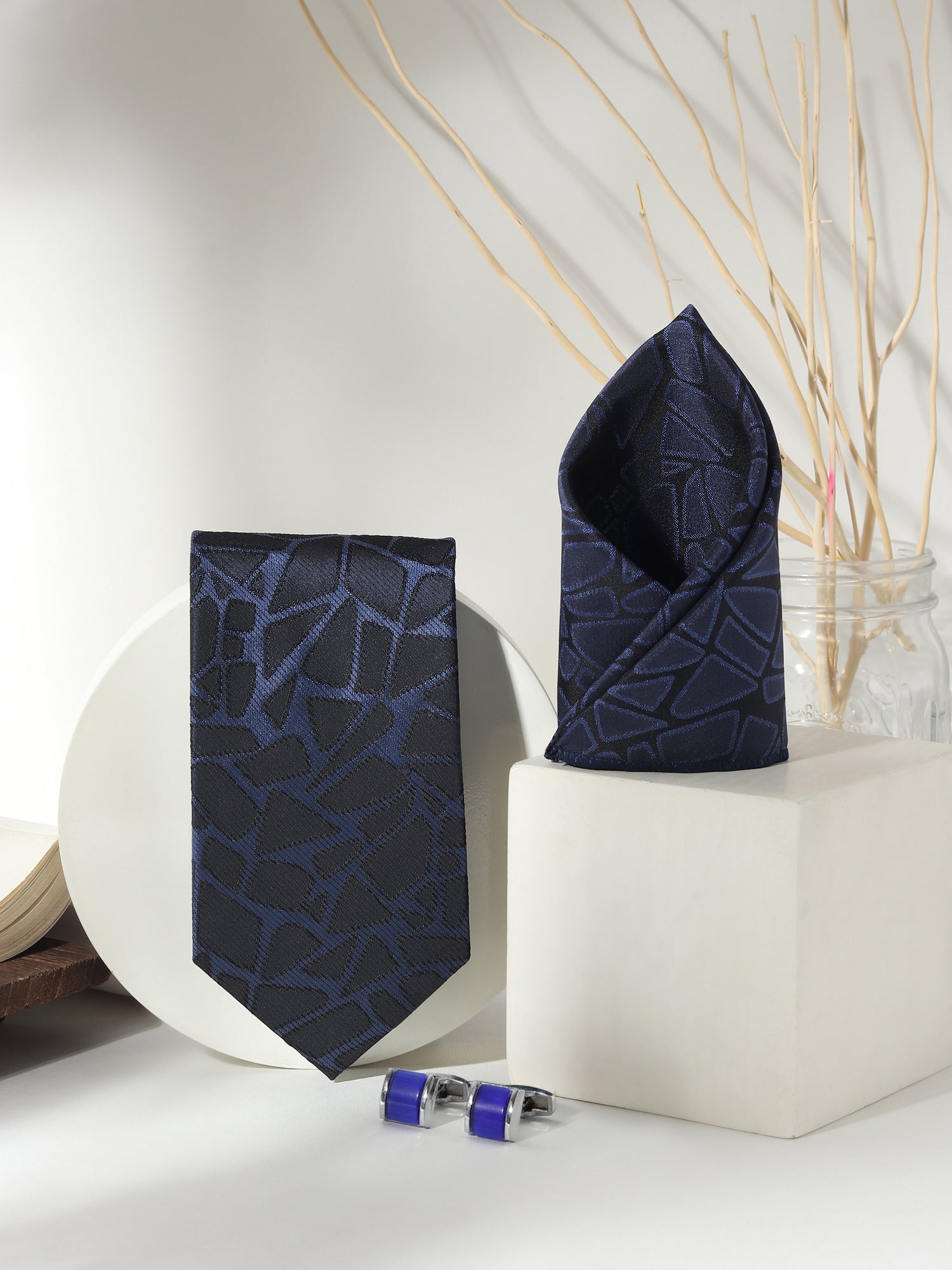 Kanthlangot Men’s 3-Piece Formal Set – Navy Abstract Tie, Pocket Square & Royal Blue Cufflinks (3-Inch Necktie)