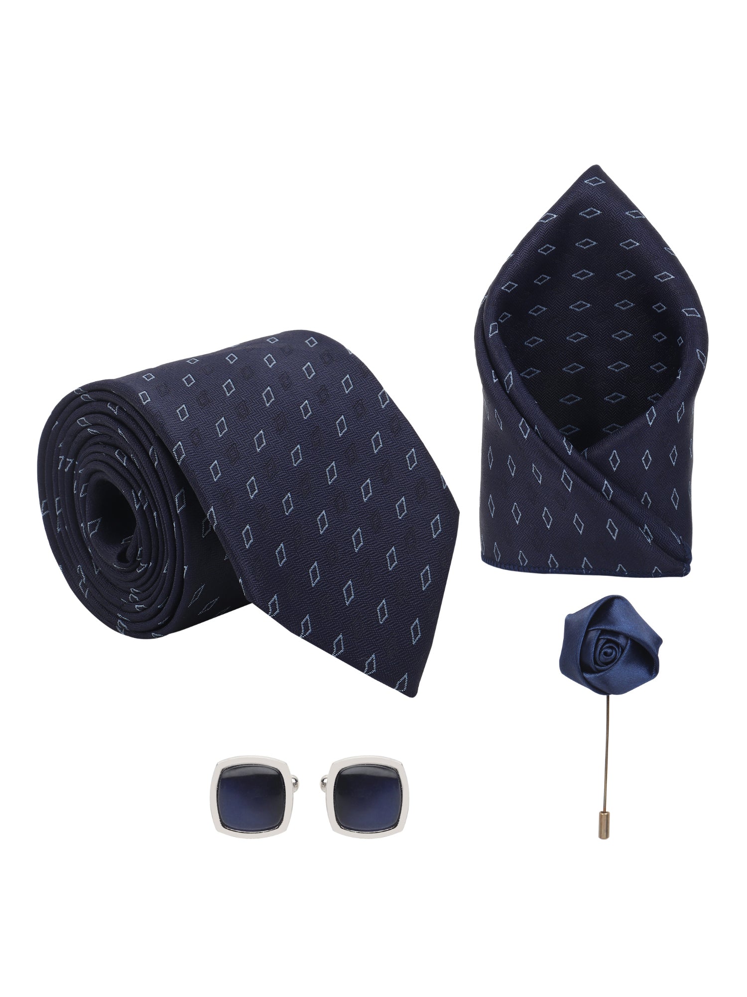 Premium navy blue necktie gift set with diamond design, pocket square, cufflinks & lapel pin. Ideal for gifting and formal wear.