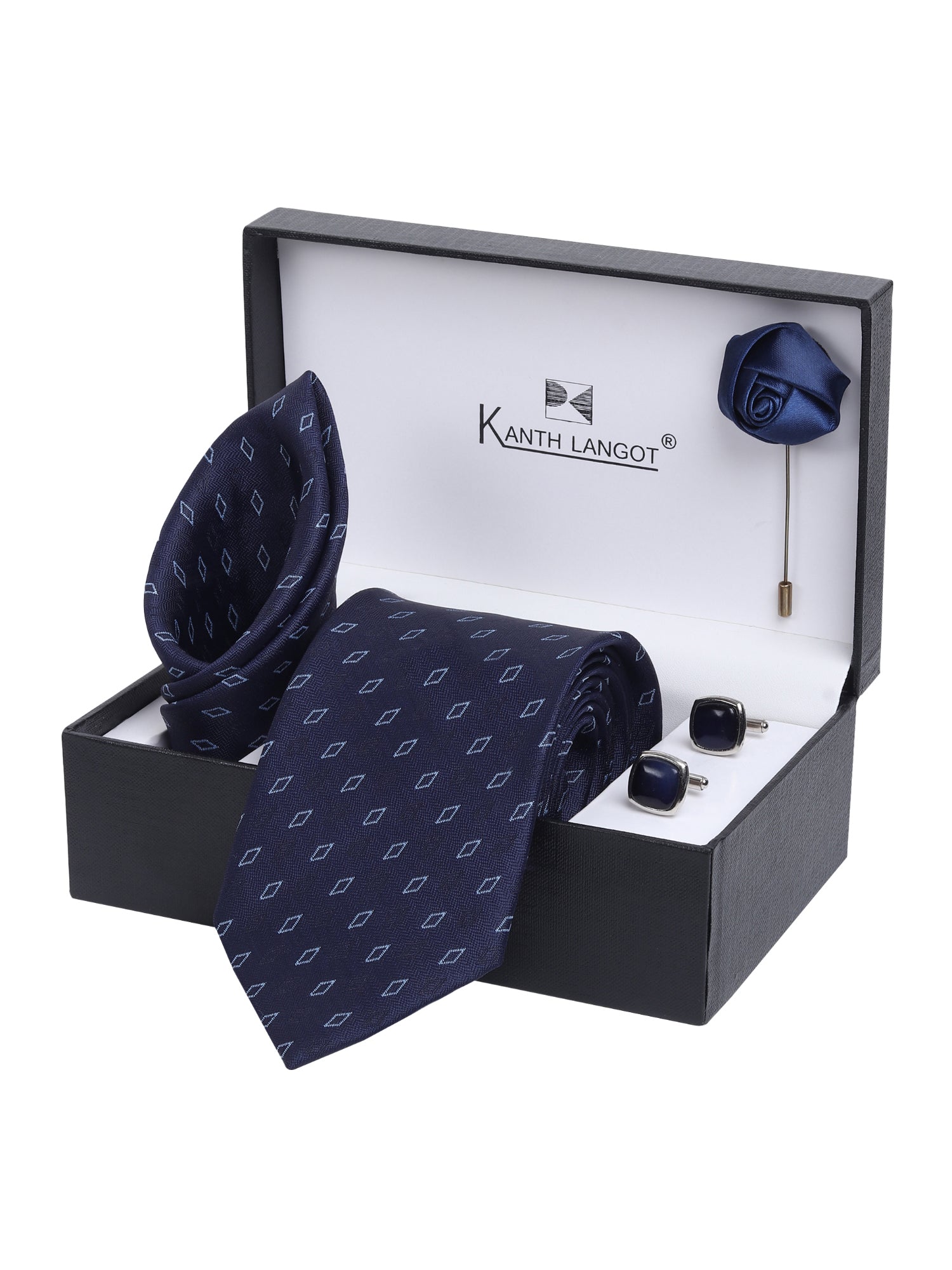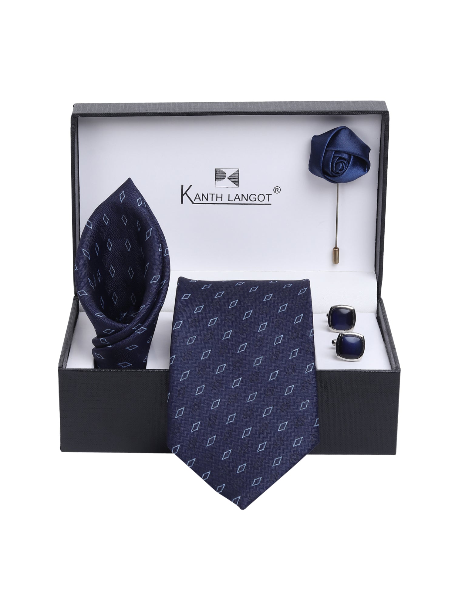 Kanthlangot Navy Blue Diamond Necktie Gift Set with Pocket Square, Cufflinks & Lapel Pin