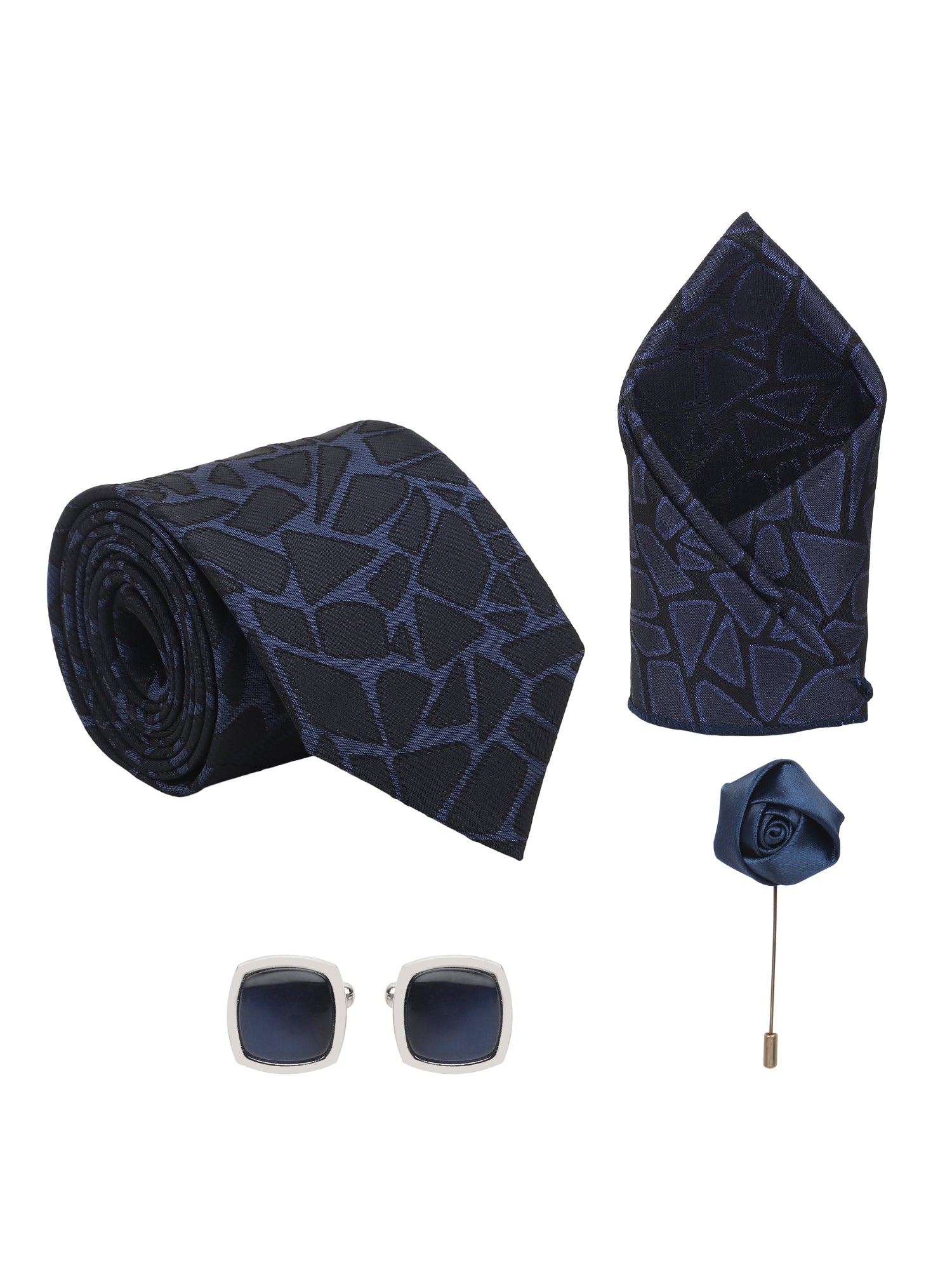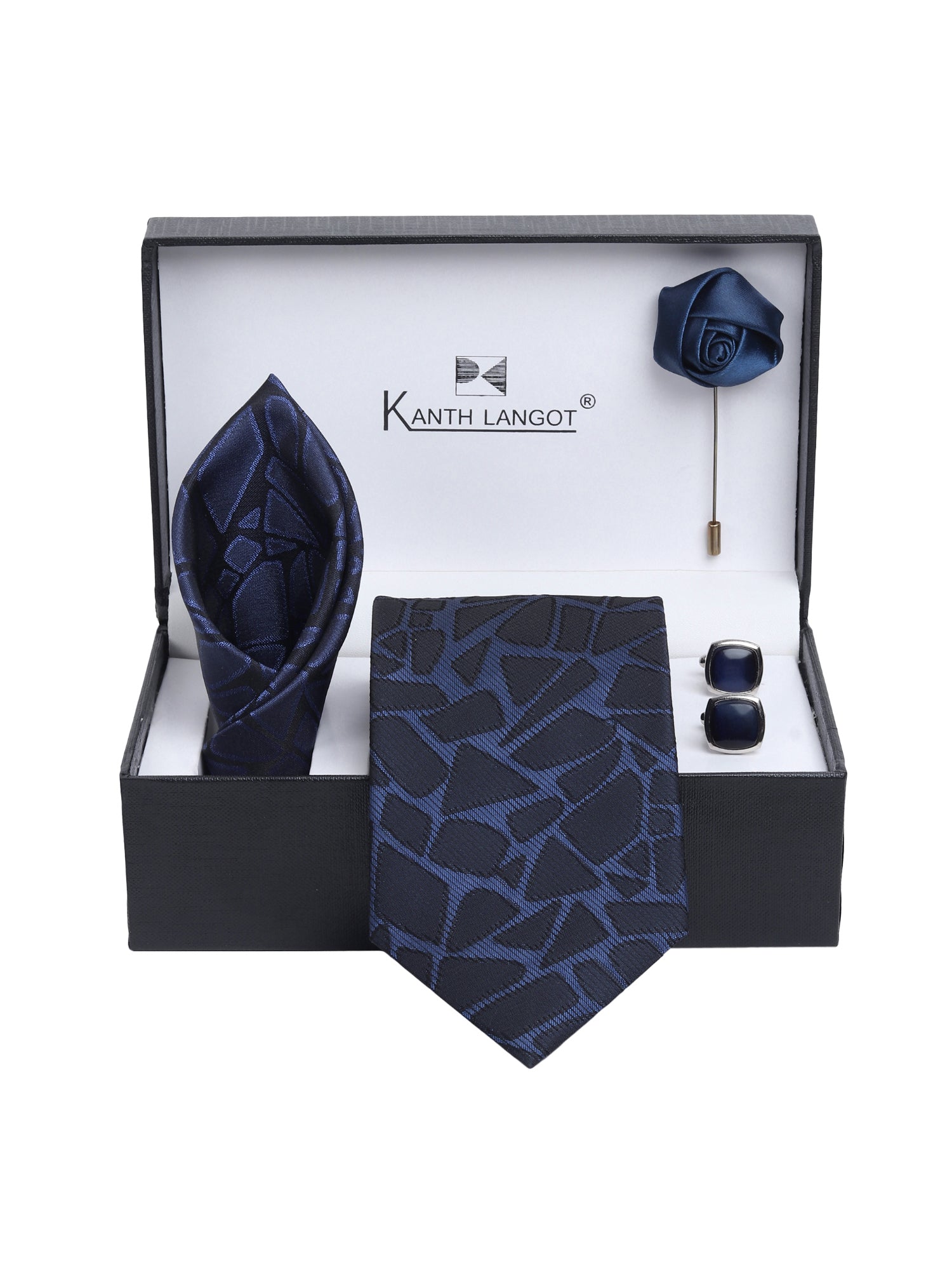 Kanthlangot Navy Blue Geometric Tie Gift Set with Pocket Square, Cufflinks & Lapel Pin