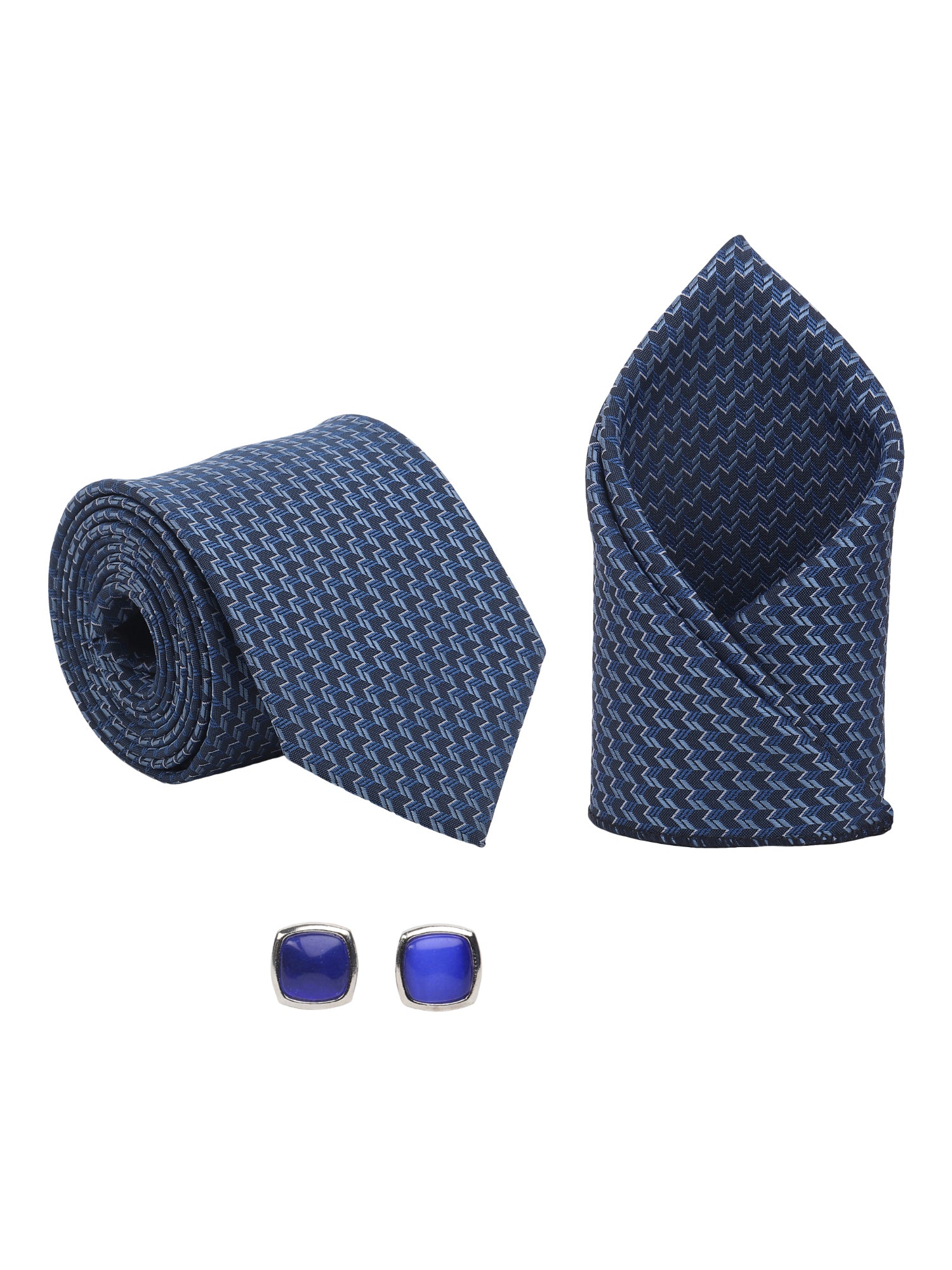 Kanthlangot Men’s 3-Piece Navy Chevron Tie Set with Pocket Square & Royal Blue Cushion Cufflinks (3-Inch Necktie)