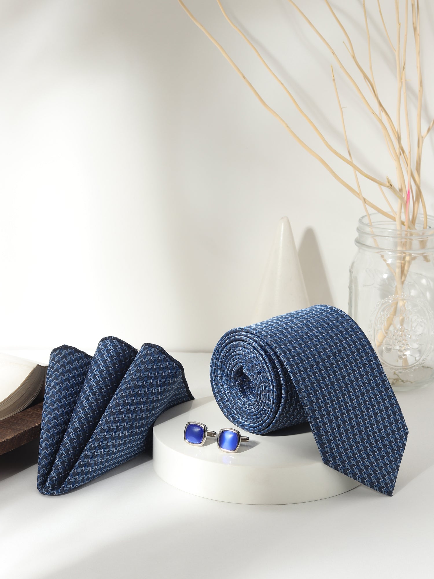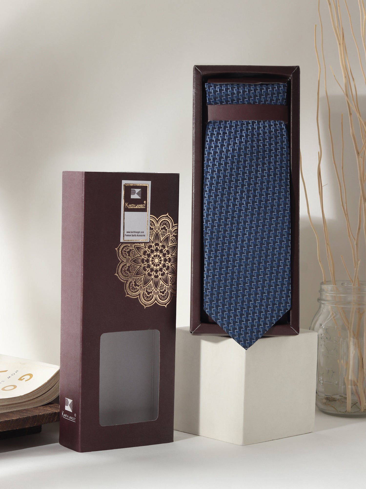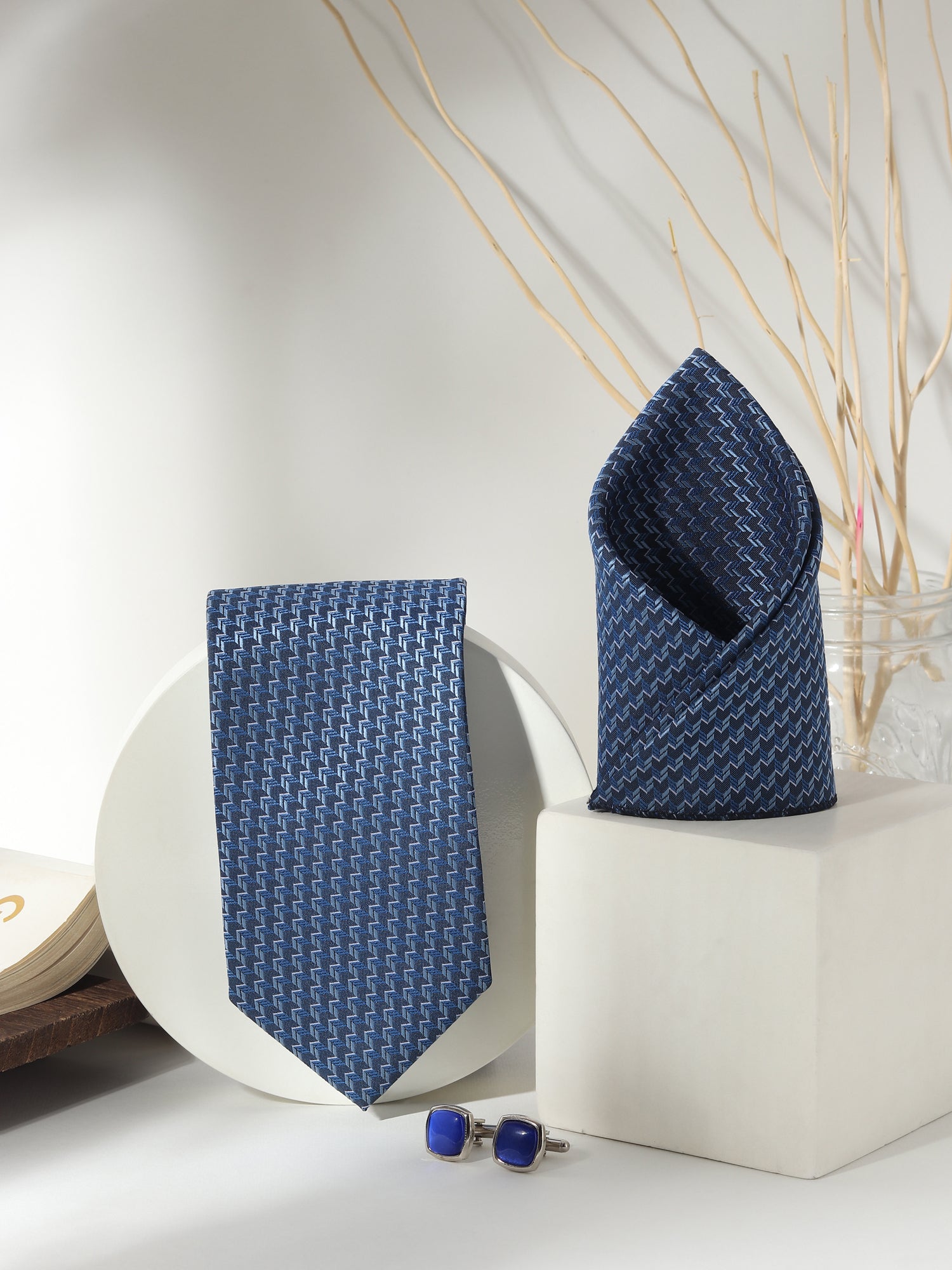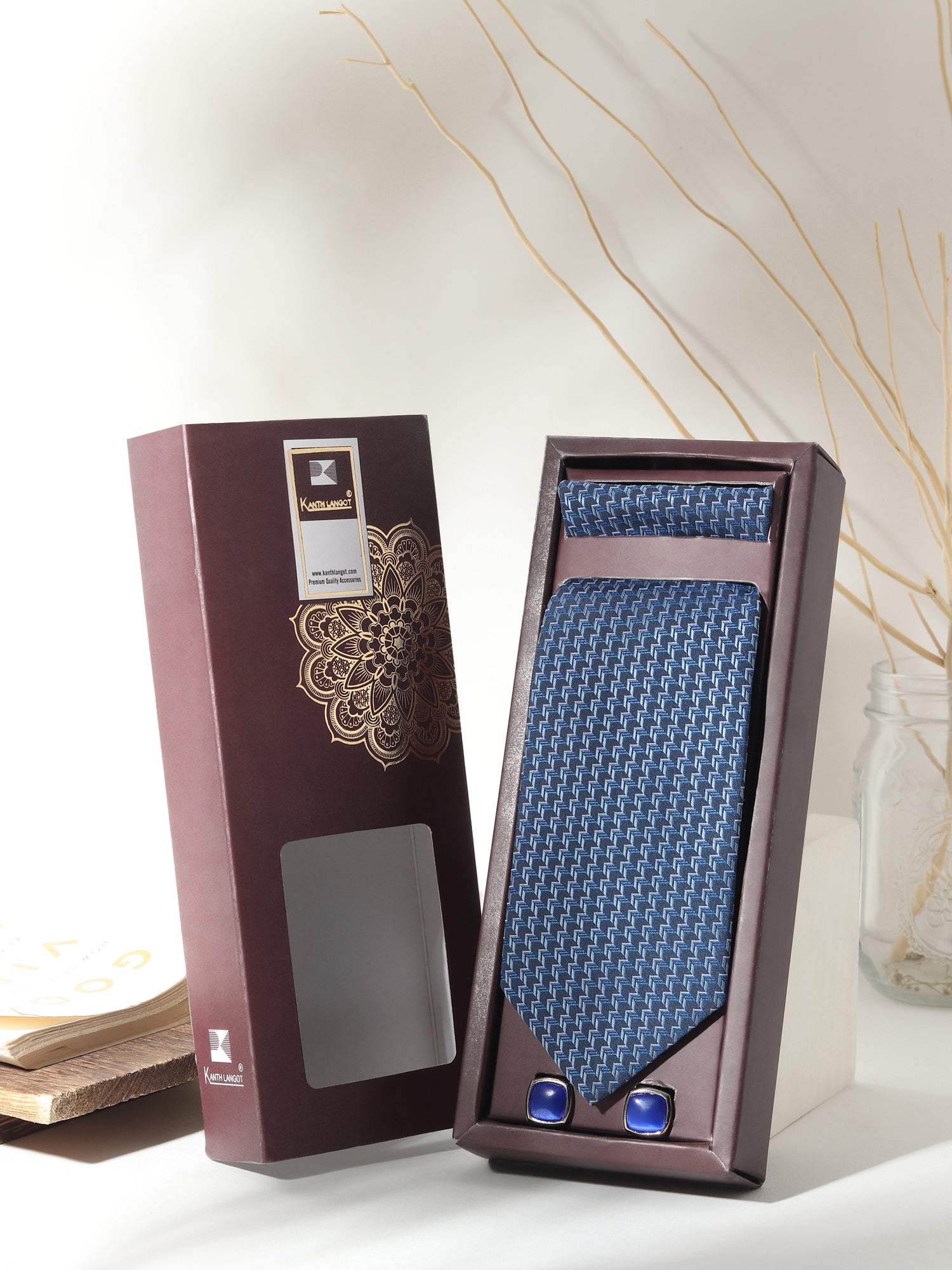 Step into timeless refinement with this Kanthlangot navy chevron weave necktie set. The understated pattern delivers texture without distraction, while the cushion-cut royal blue cufflinks inject a polished pop of color. A smart choice for boardrooms, banquets, and beyond.
