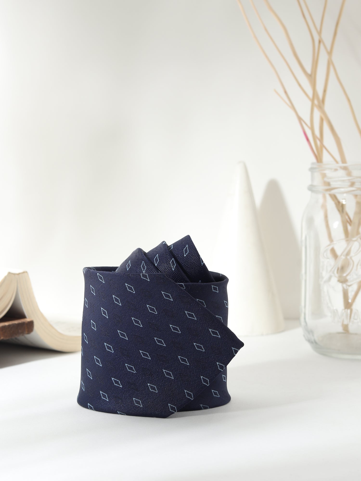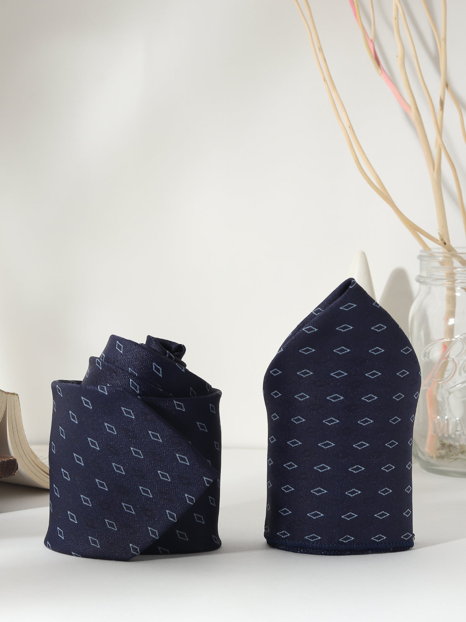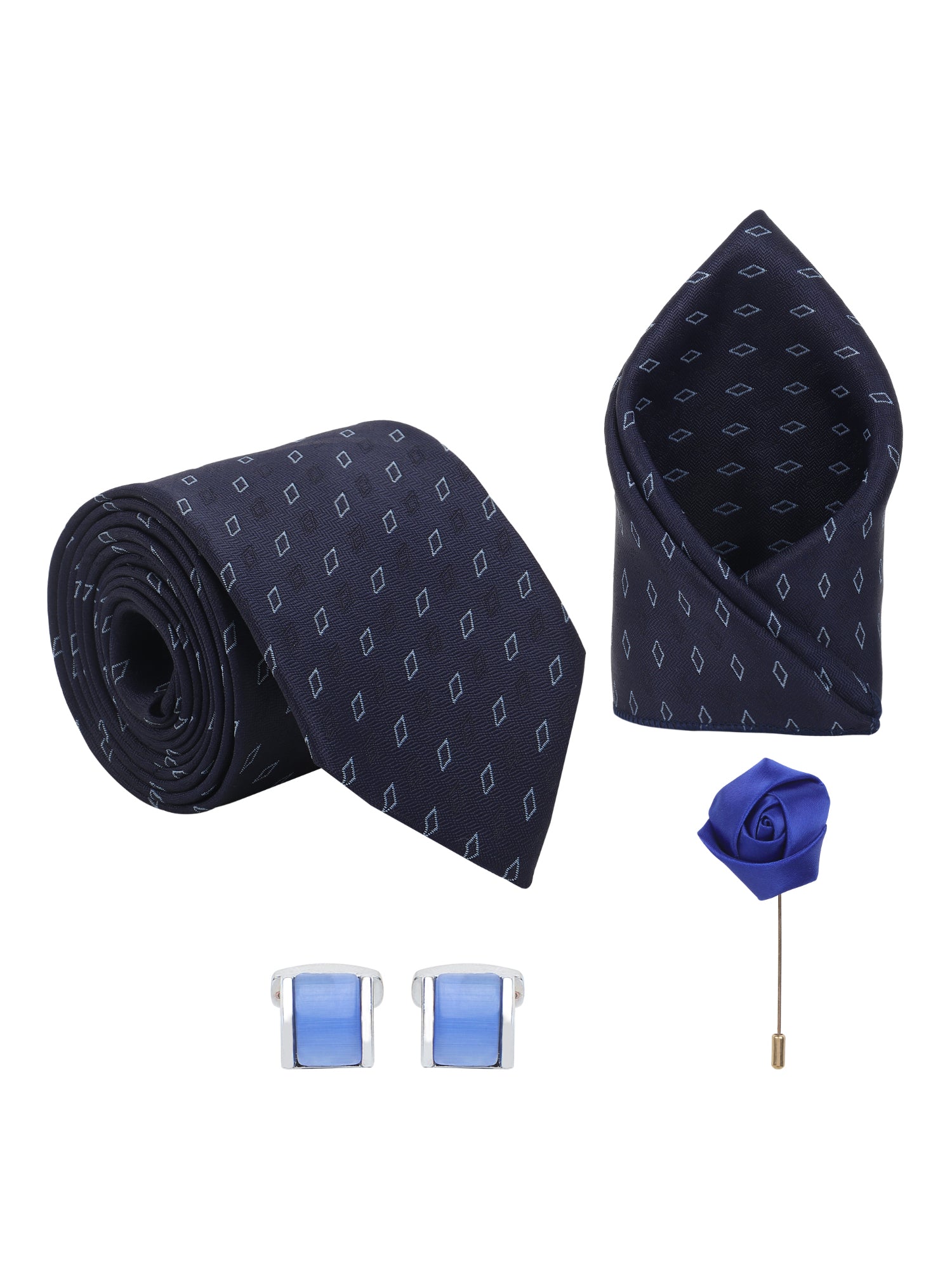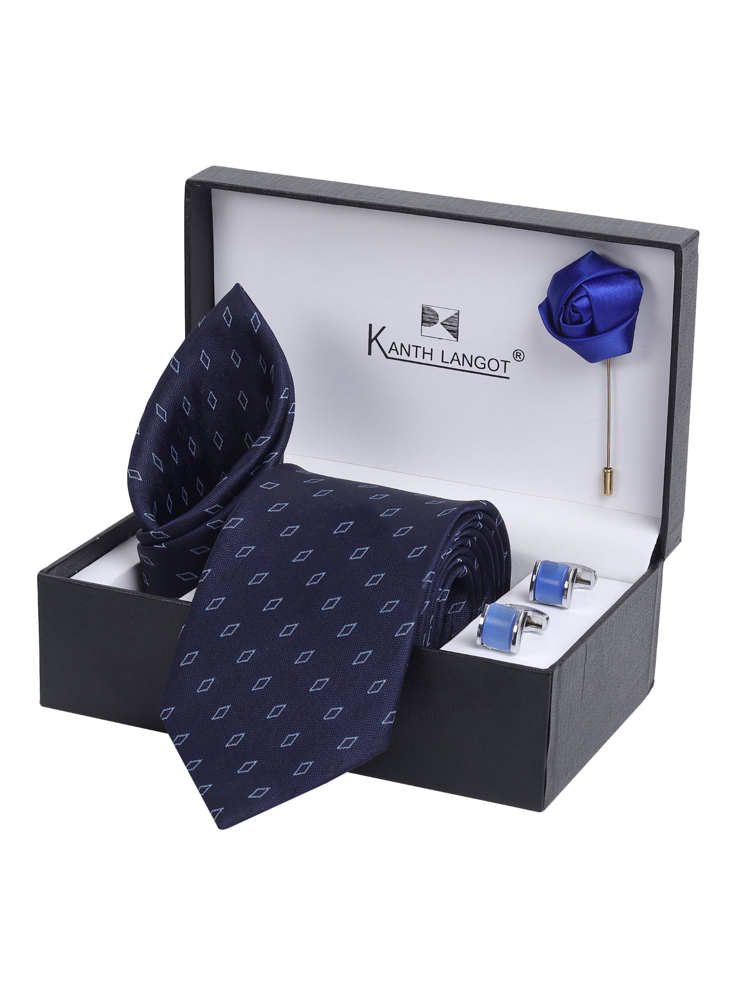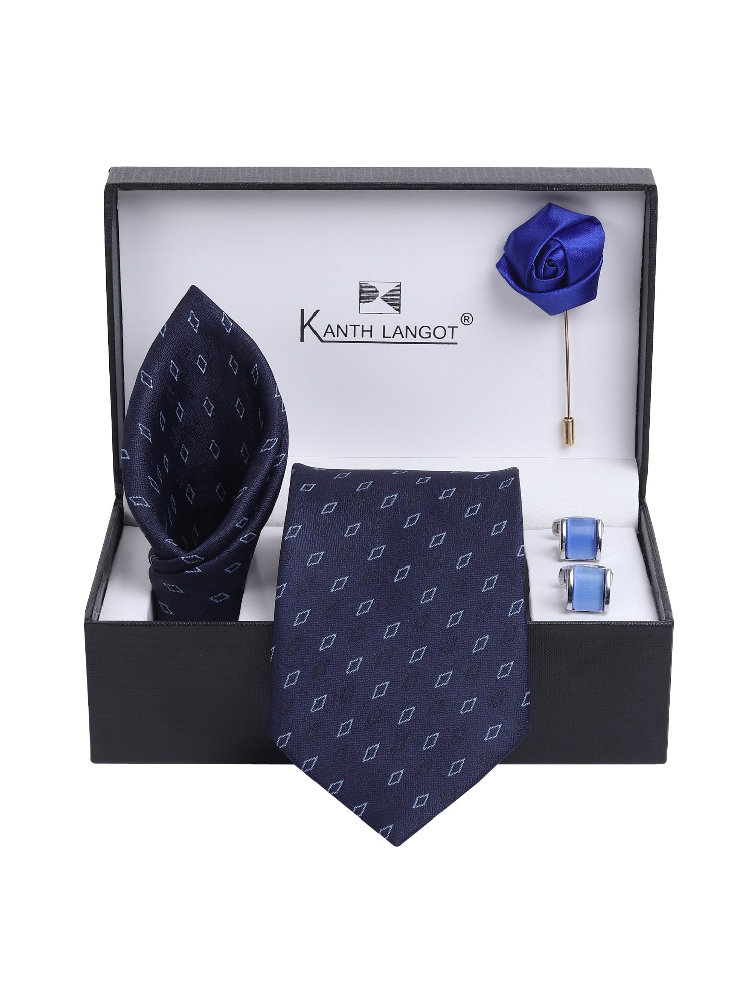 Kanthlangot Navy Diamond Motif Necktie Set with Pocket Square, Cufflinks & Lapel Pin