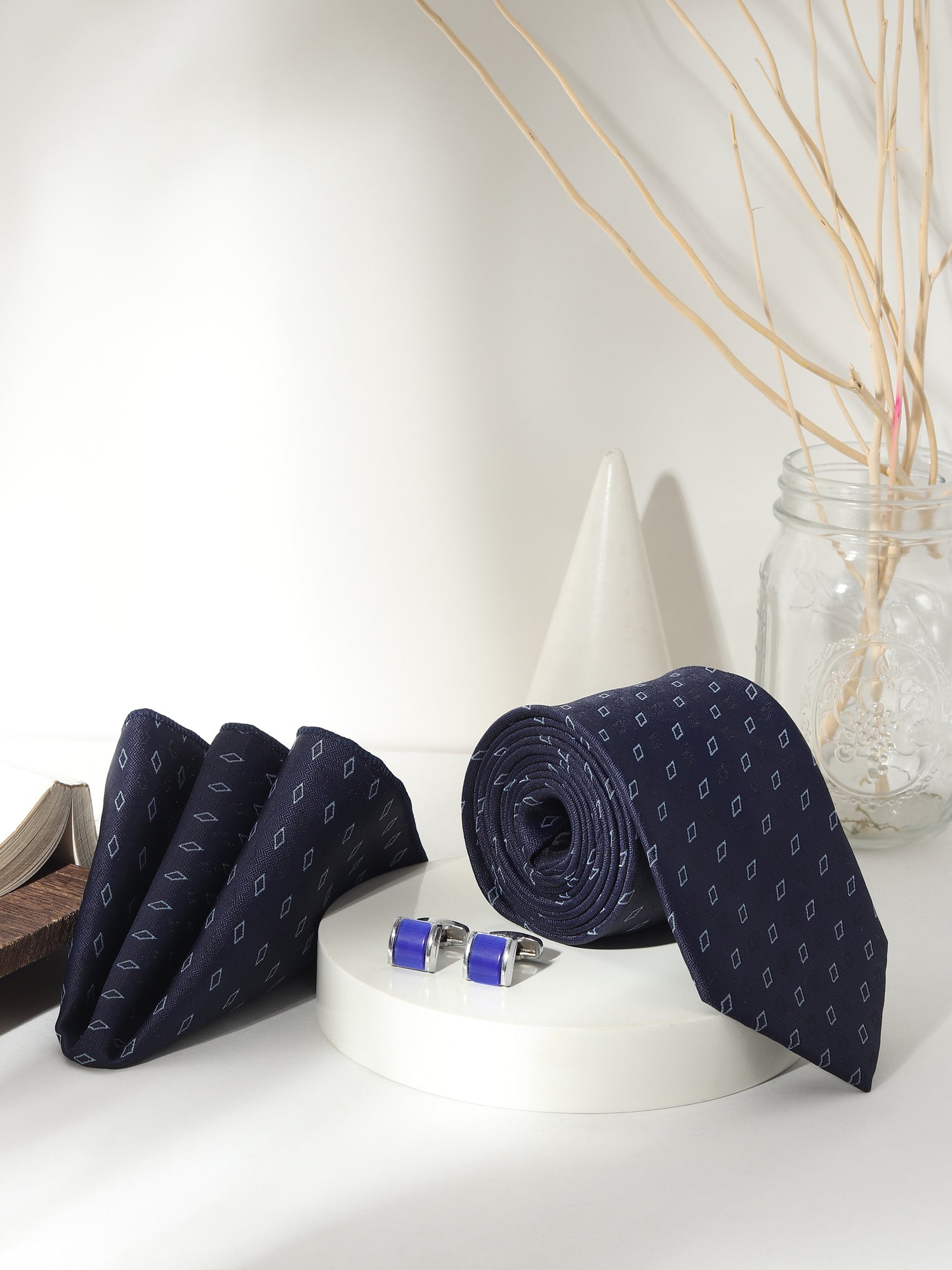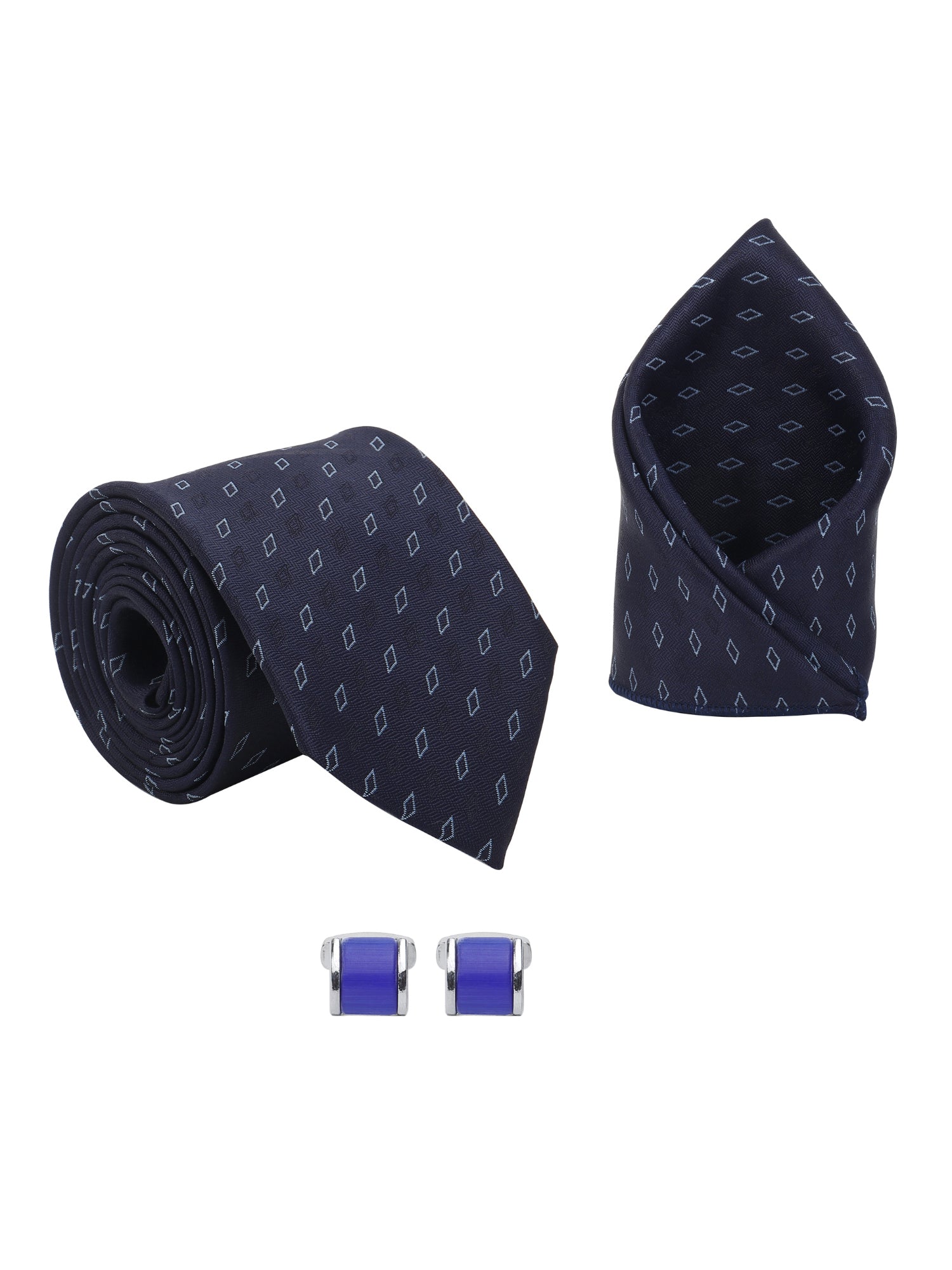 Kanthlangot Men’s 3-Piece Formal Set – Navy Diamond Tie, Pocket Square & Electric Blue Barrel Cufflinks (3-Inch Necktie)