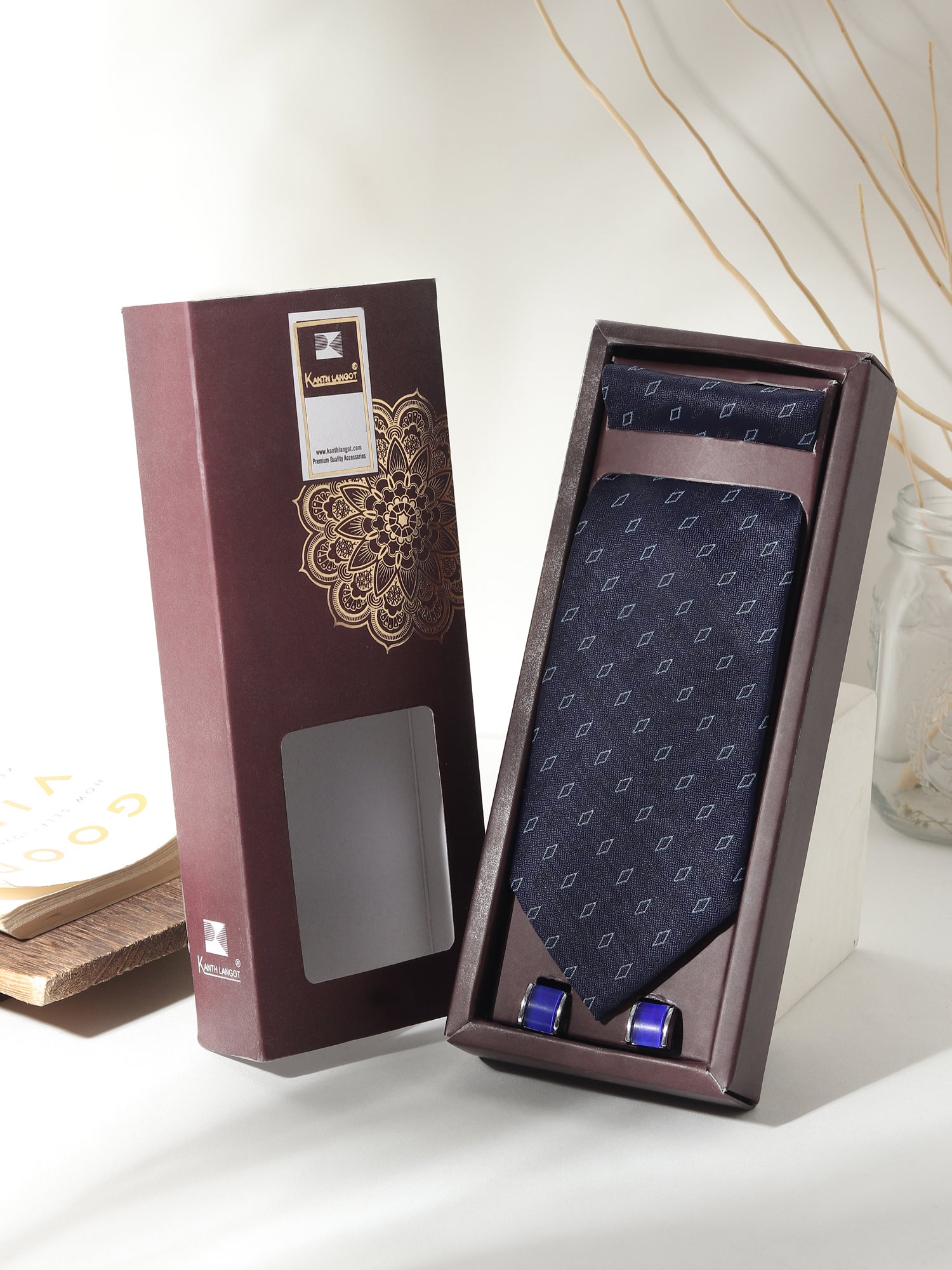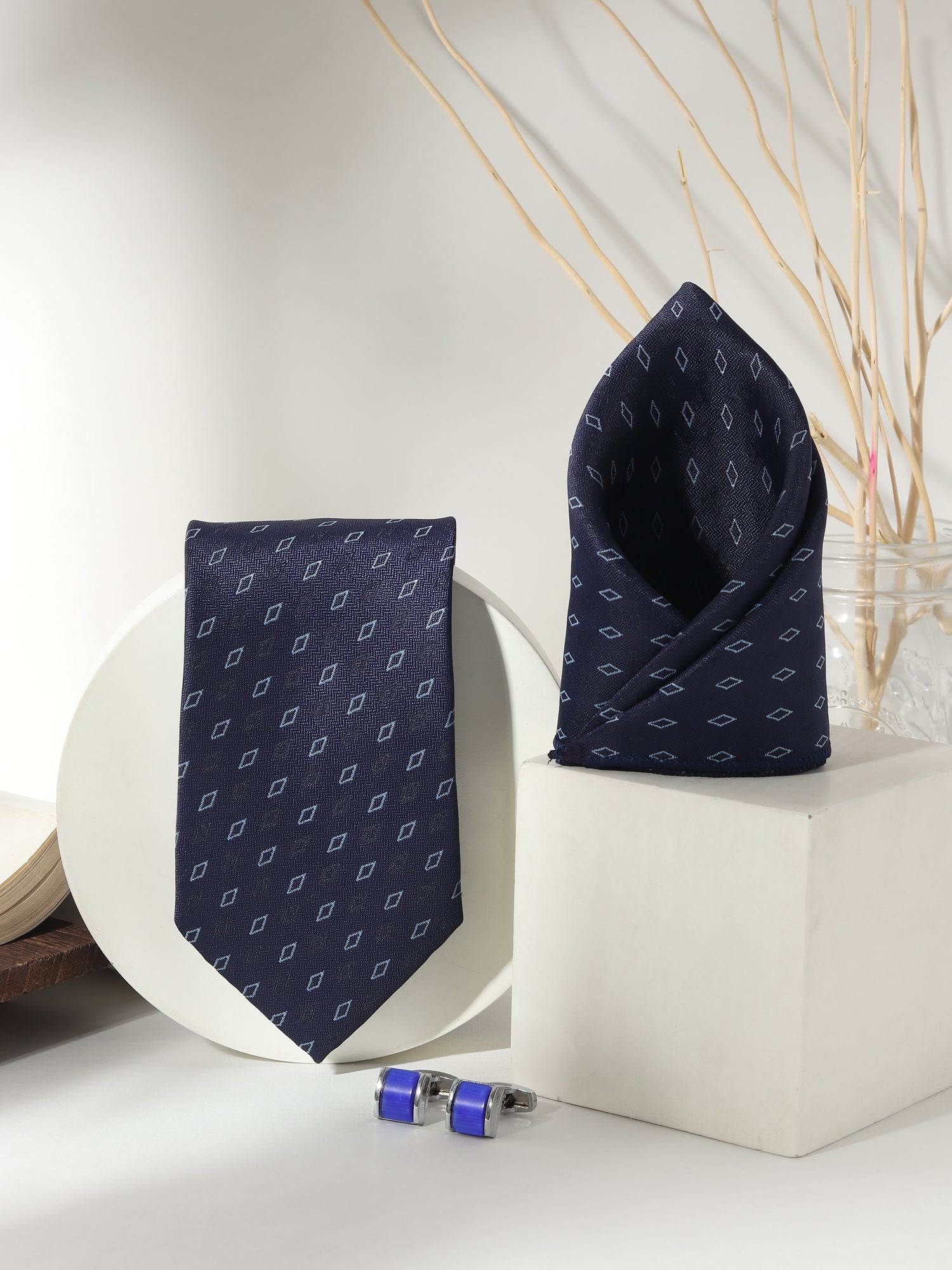 Modern yet classic, the Kanthlangot navy diamond tie set blends subtle geometric patterns with an electrifying pop of color. The deep navy tie and pocket square feature a repeating diamond motif, adding refined texture to formal wear, while the electric blue enamel cufflinks serve as a striking contrast—perfect for men who lead with presence.