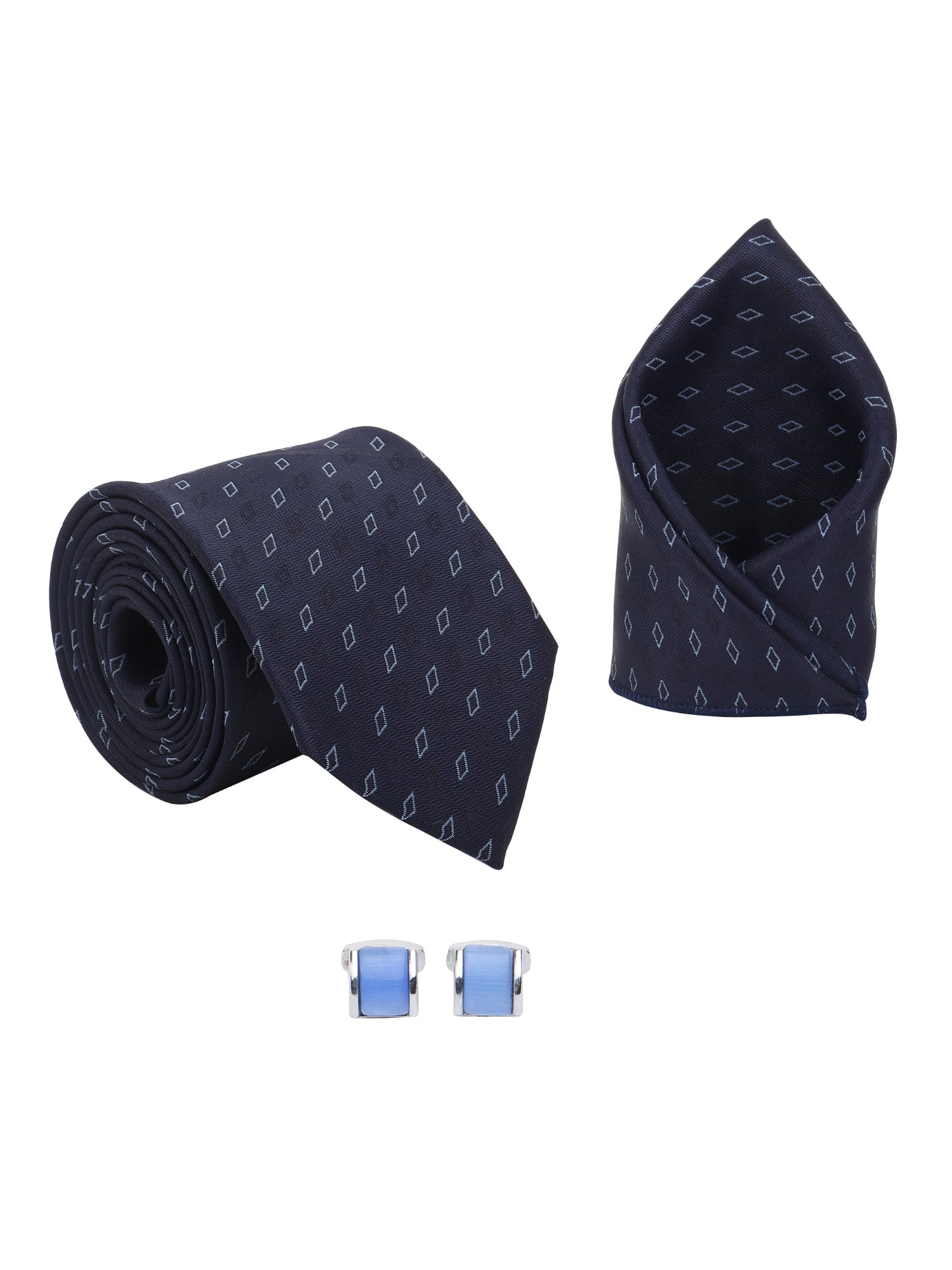Kanthlangot Men’s 3-Piece Formal Set – Navy Micro-Diamond Tie, Pocket Square & Sky Blue Barrel Cufflinks (3-Inch Necktie)
