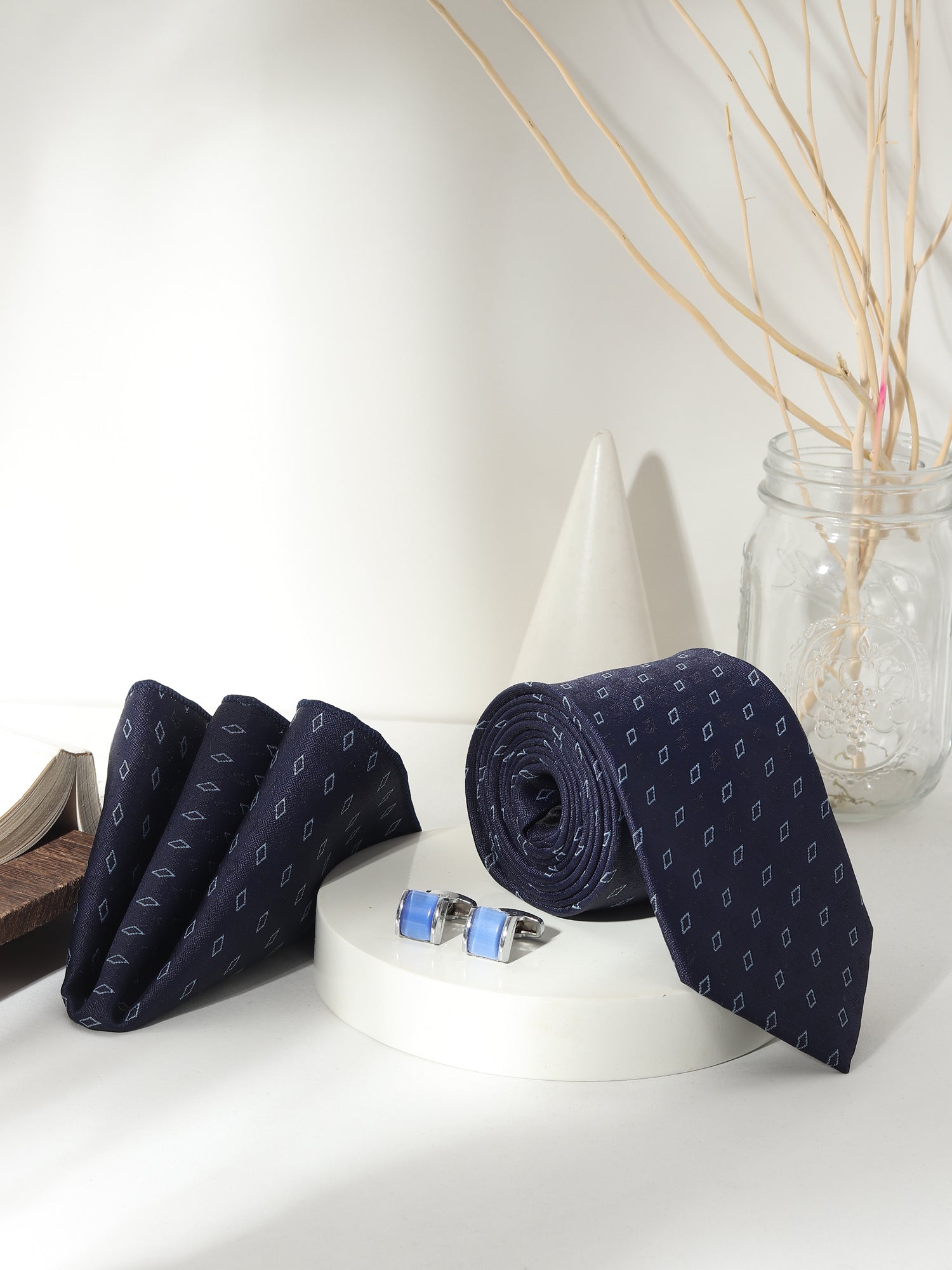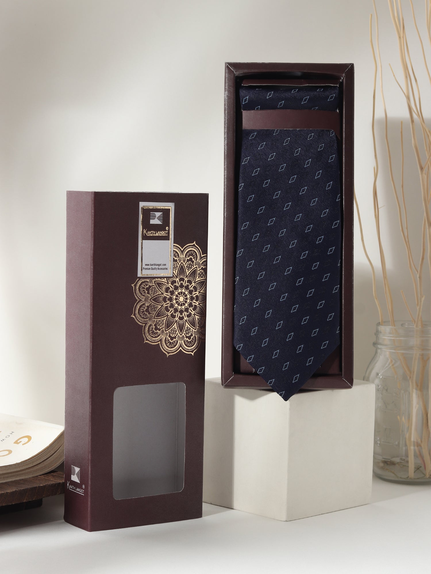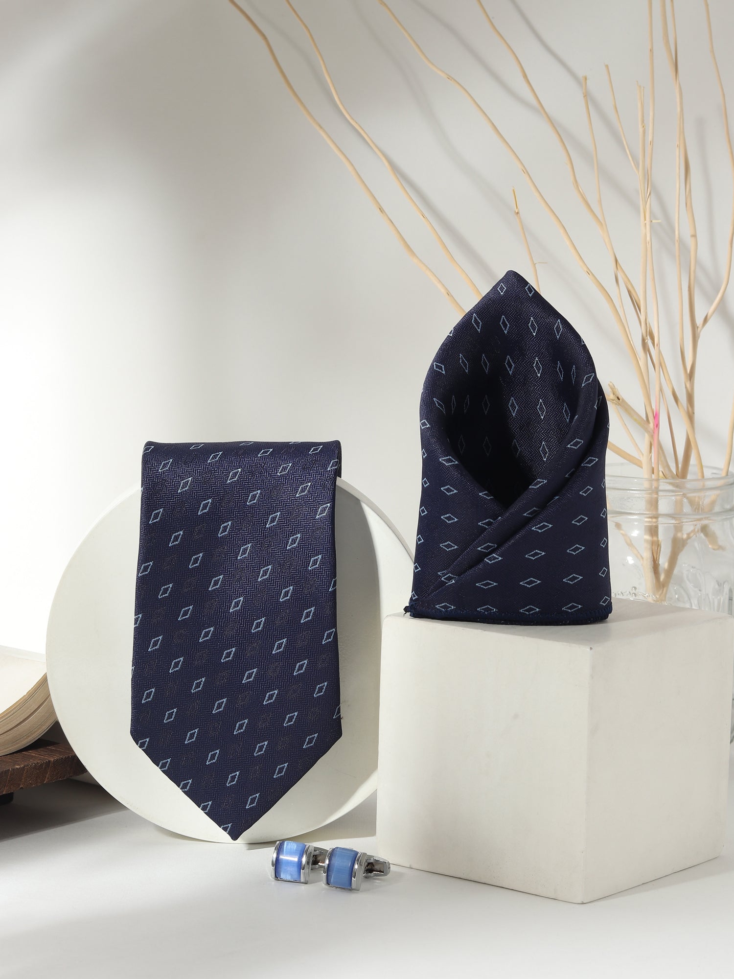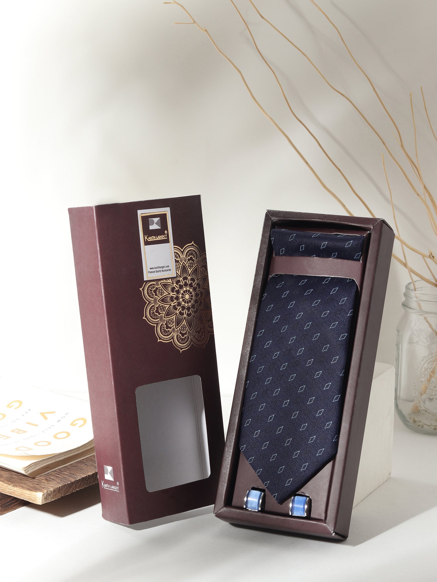 Command attention with this Kanthlangot premium formal combo featuring a navy tie designed with a geometric abstract black overlay, a matching pocket square, and striking cobalt blue barrel-style cufflinks framed in polished silver. A masterful blend of edgy detail and refined elegance, this set is ideal for standout events, high-end celebrations, and formal gifting.