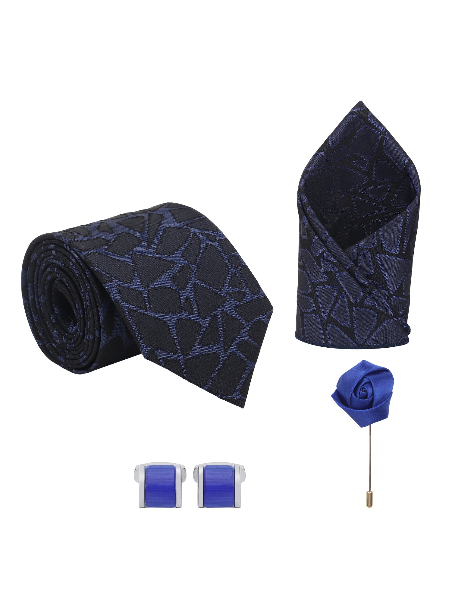 Kanthlangot Navy Mosaic Tie Set with Pocket Square, Blue Cufflinks & Satin Lapel Pin