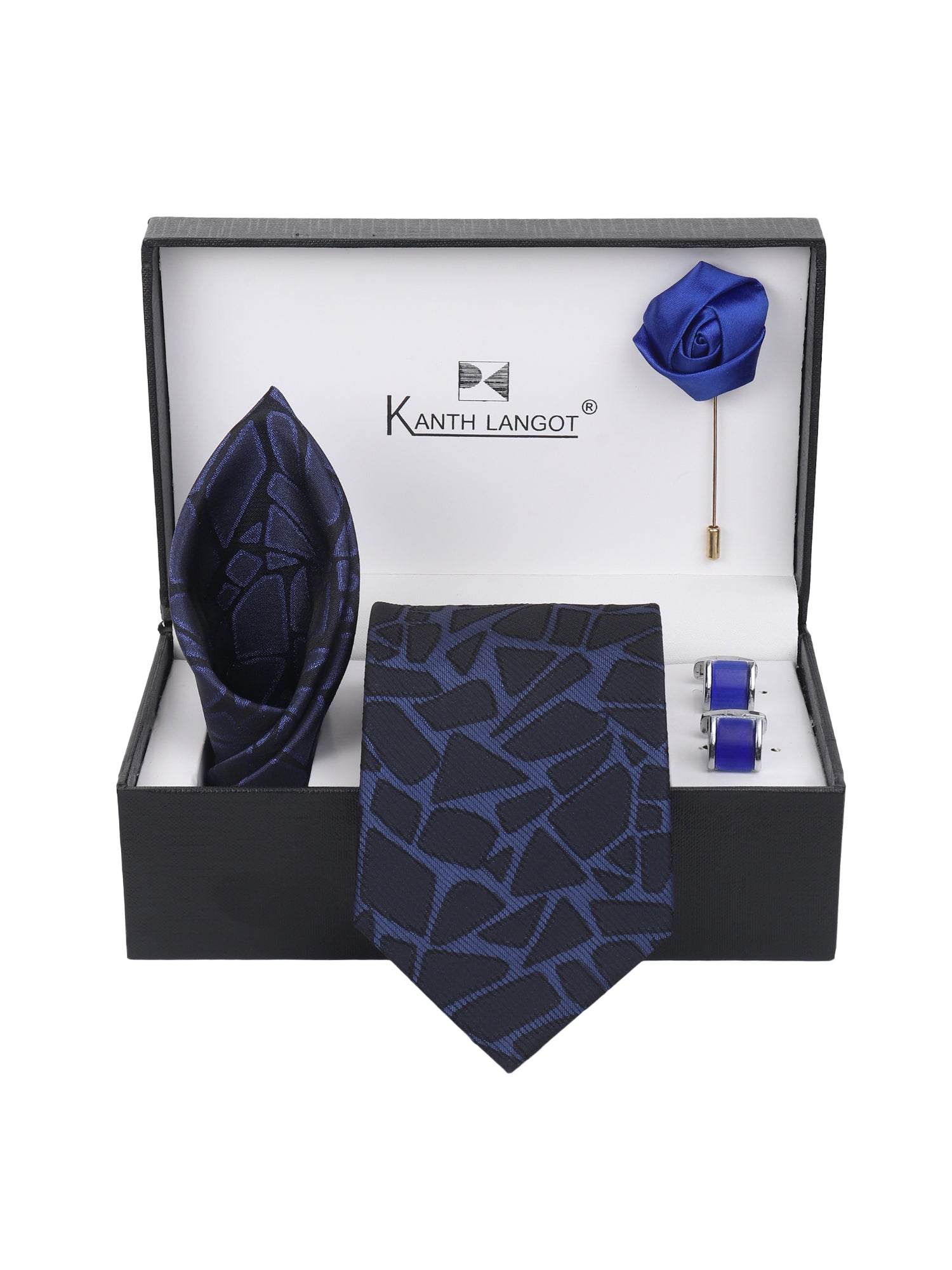 Elevate your formal look with the Kanthlangot Navy Mosaic Tie Gift Set, a premium 4-piece ensemble for men who value elegance and coordination. The necktie showcases an abstract mosaic pattern in rich navy hues, making it a versatile yet statement accessory for events, weddings, or business. Complemented by a perfectly matched pocket square, royal blue enamel cufflinks, and a satin lapel pin in bold cobalt, this set brings charm and cohesion in a sleek gift box.