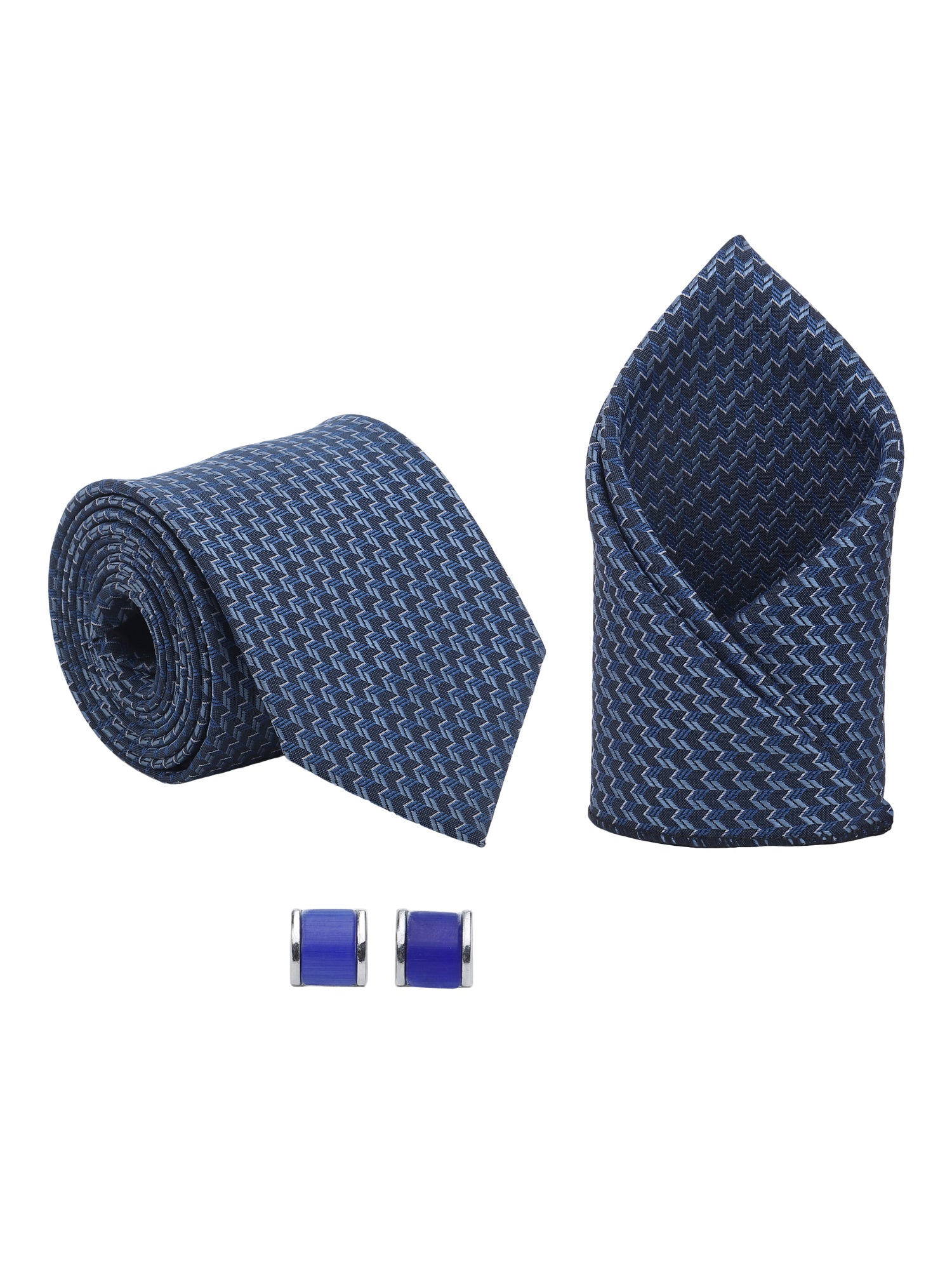 Kanthlangot Men’s 3-Piece Navy Zigzag Tie Set with Pocket Square & Royal Blue Barrel Cufflinks (3-Inch Necktie)