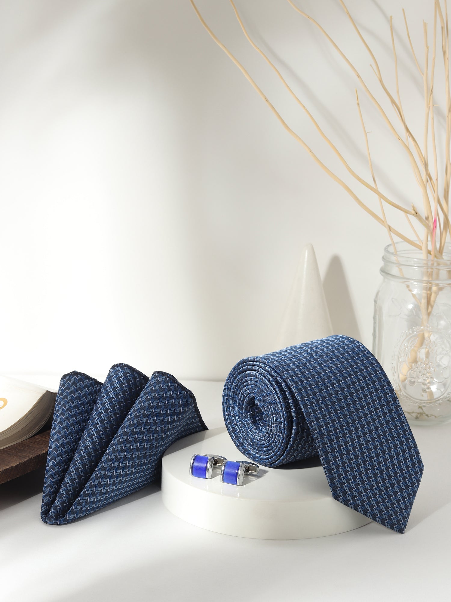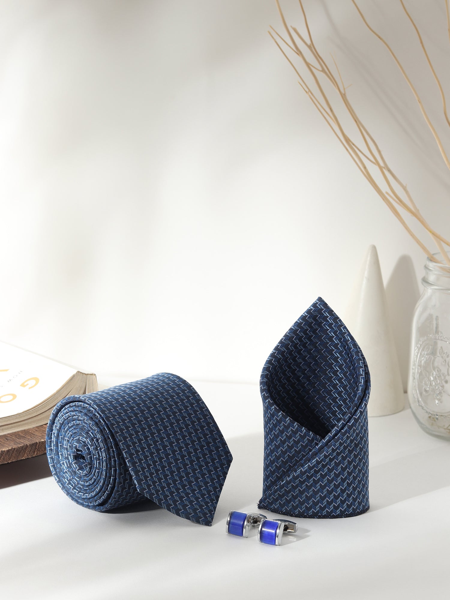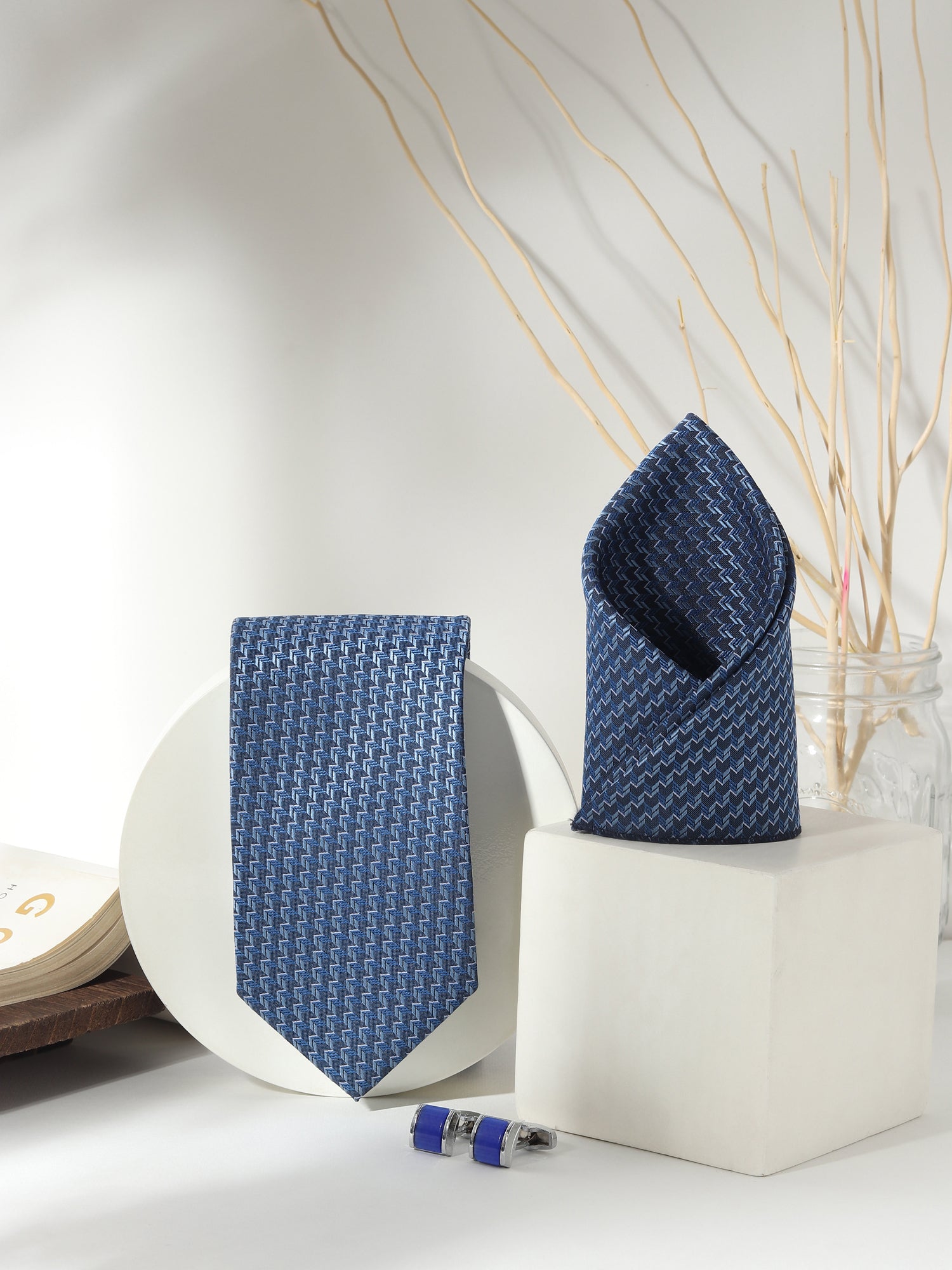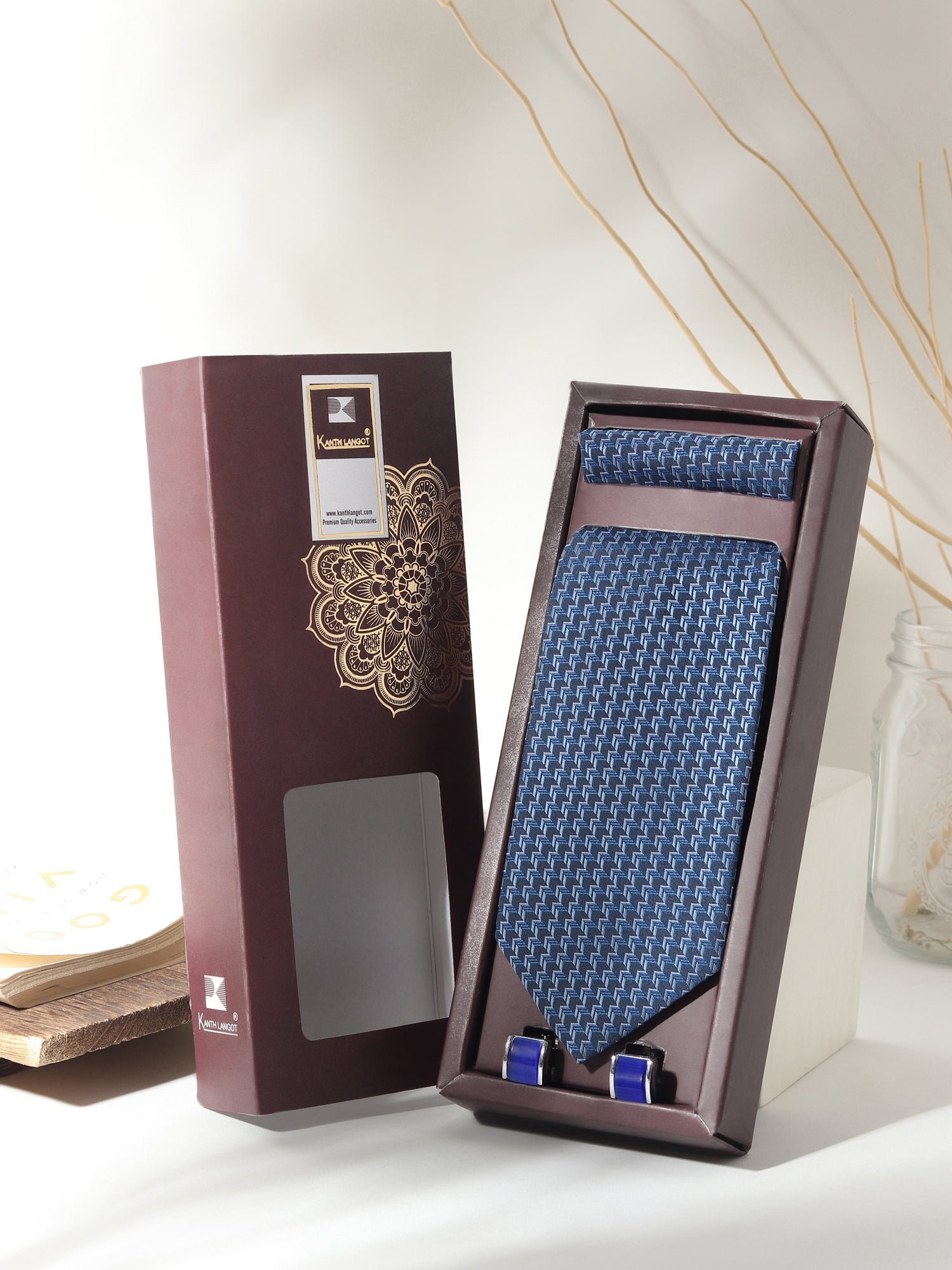 Bold yet sophisticated, this Kanthlangot navy zigzag tie set is made for men who dress with detail. The woven pattern adds depth, while the royal blue barrel cufflinks deliver a confident punch of polish. Perfect for presentations, parties, and polished evenings.